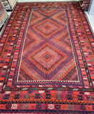 Collectible Massive Room Size Tribal Design Hand Woven Vintage Afghan Meymaneh Kilim Rug, Woven Circa 1960’s. Above All It Has A Pure Hand Spun Wool Pile On Wool Base. Rustic Red, Orange, Green, Blue And Black Tone Dyed Using Traditional Methods.