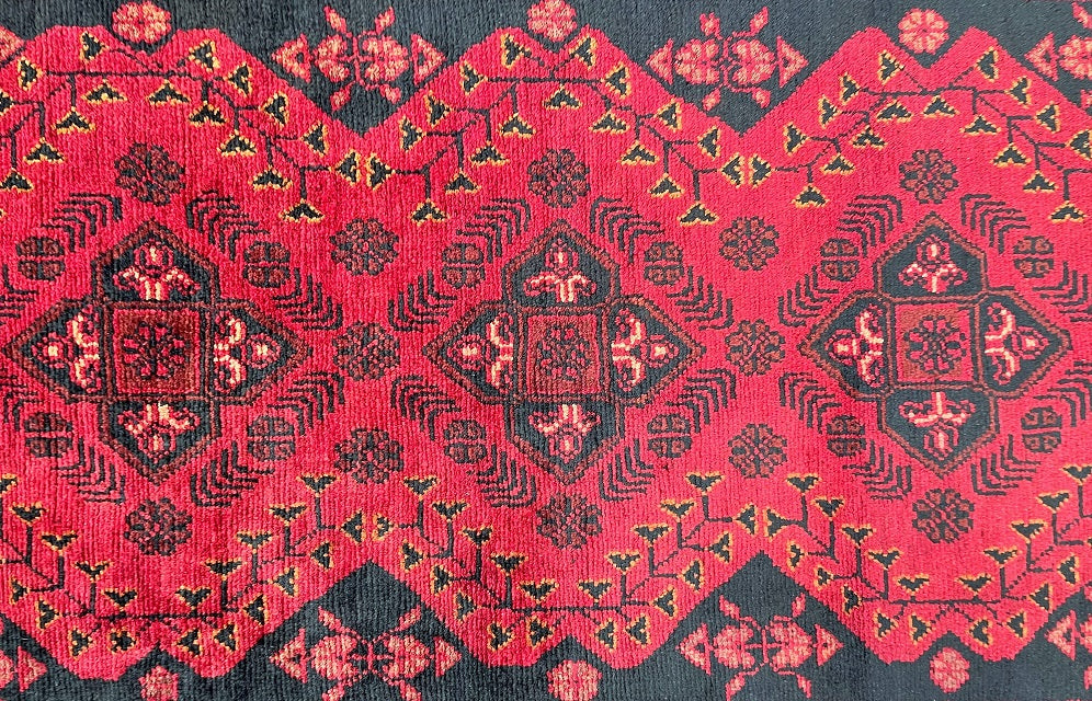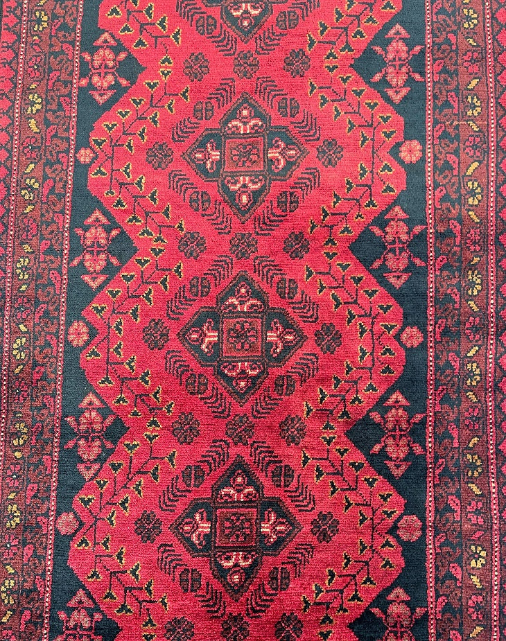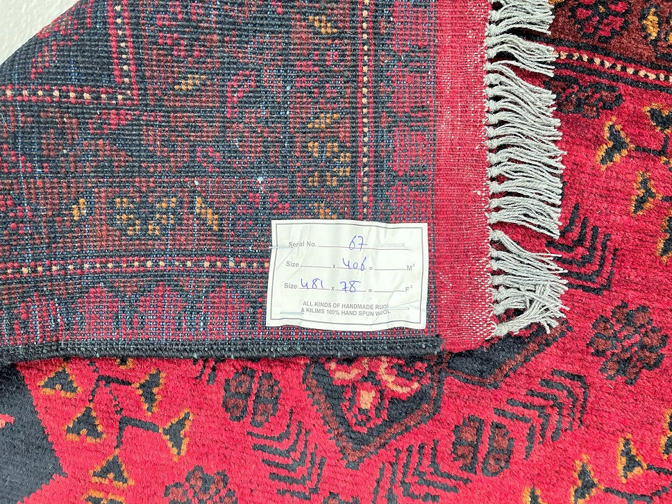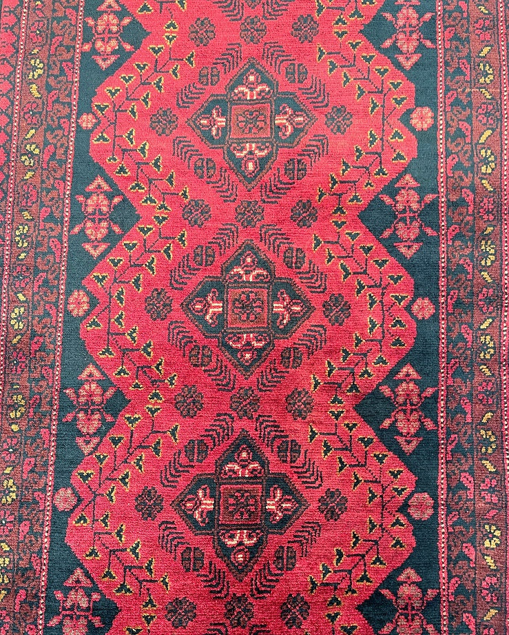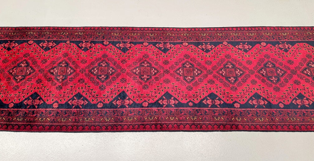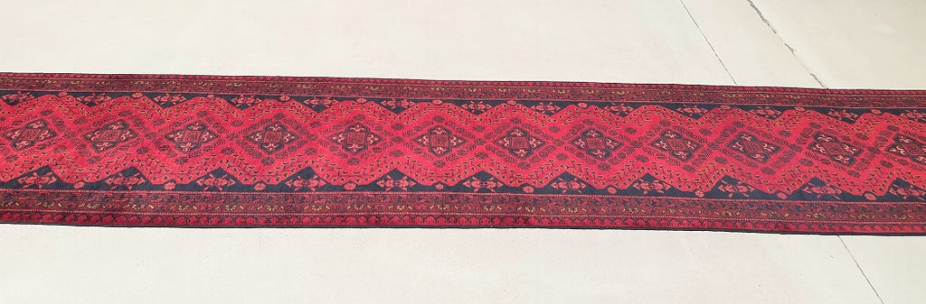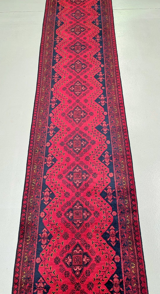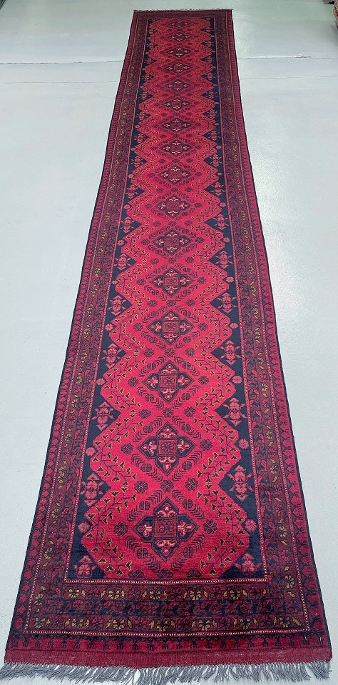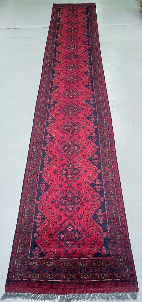 Authentic Hand Knotted Tribal Afghan Kunduz Hall Runner. This gorgeous runner showcases a pure wool pile on a wool base, ensuring durability and comfort. The burgundy/burnt terracotta tone, achieved through traditional dyeing methods, adds a touch of elegance to any space. This runner is particularly suited for wooden floorboards, enhancing the overall aesthetic. Its stunning allover broken branches semi floral, semi geometric design is truly captivating. It is worth noting that this piece required the skilled craftsmanship of a weaver for approximately 6 months to complete. Hand woven in Afghanistan, this runner measures 481 x 78 cm, making it an ideal choice for hallways or narrow spaces. Its gallery replacement value is estimated at $5499.