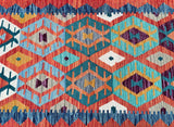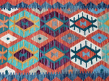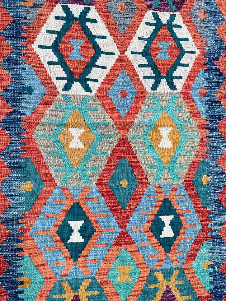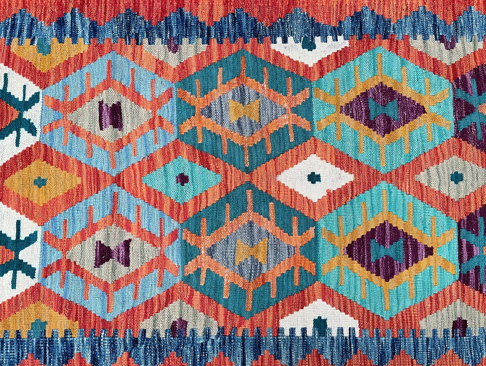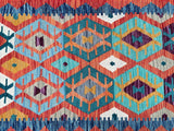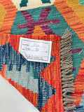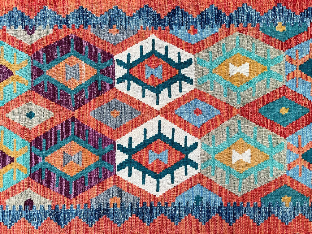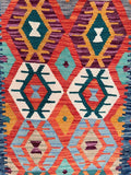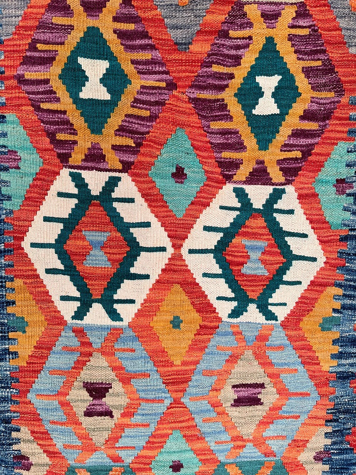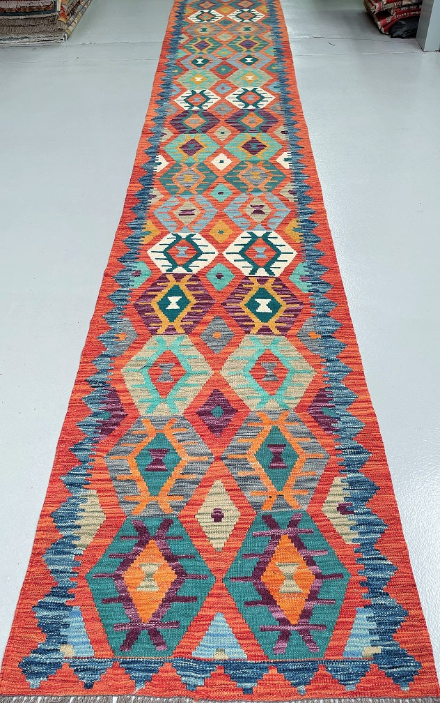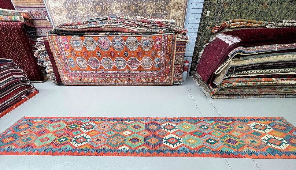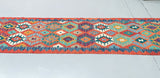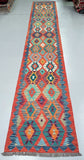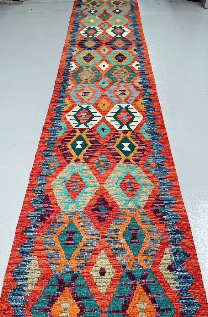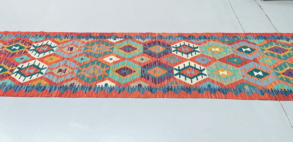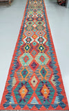 Rare Extra Long Boho Design Hand Woven Afghan Meymana Kilim Hall Runner. Above All It Has A Pure Hand Spun Wool Pile On Wool Base. Vibrant Multi-Color Tones Dyed Using Traditional Methods.