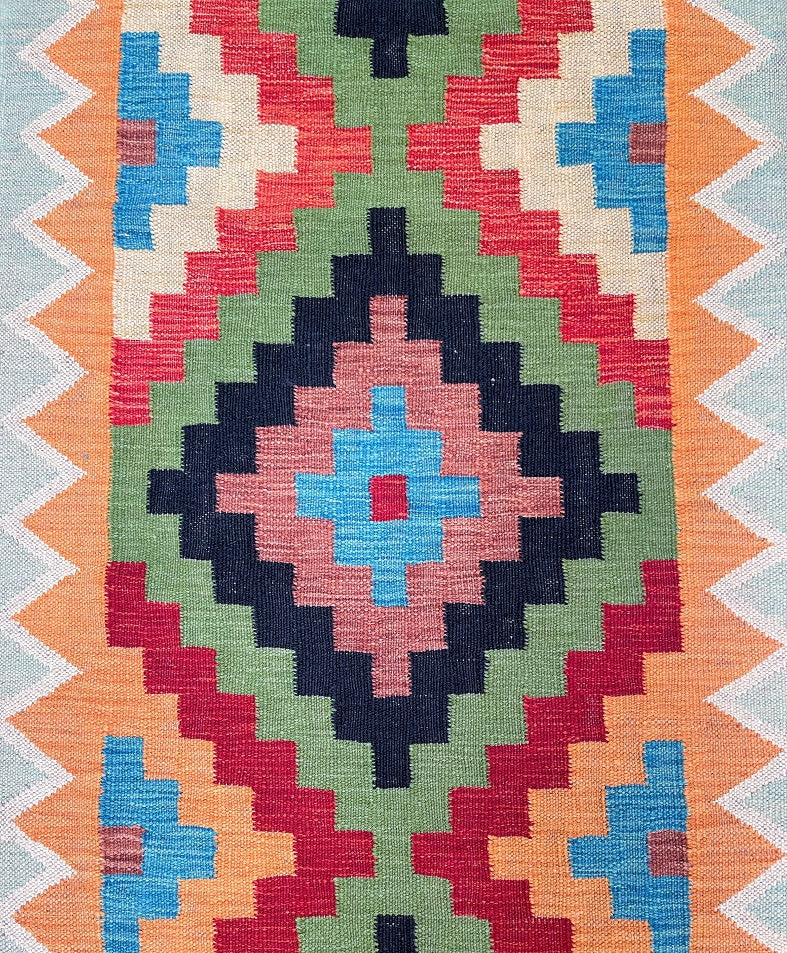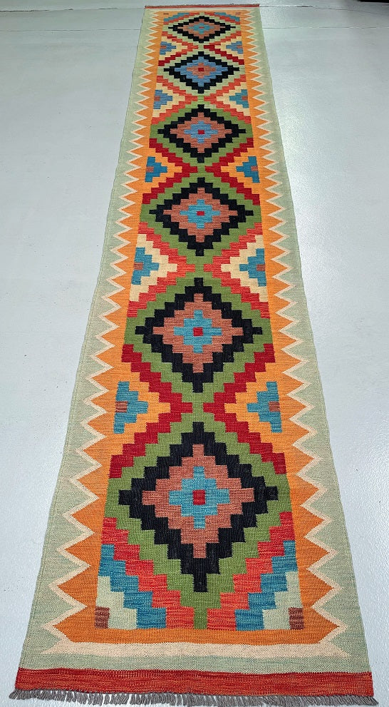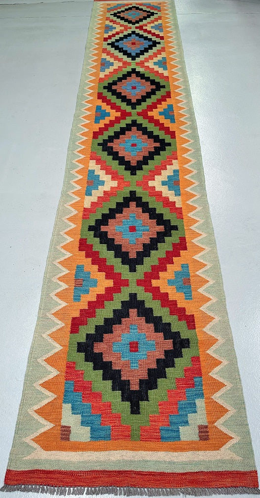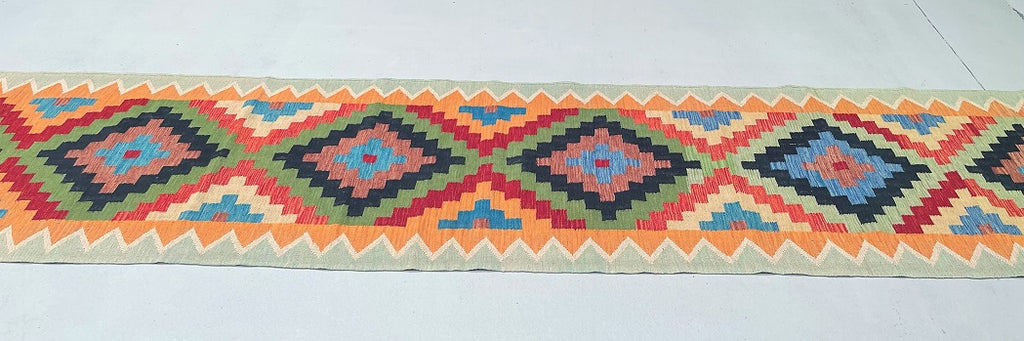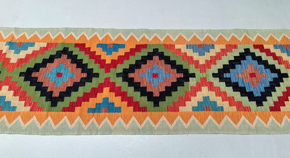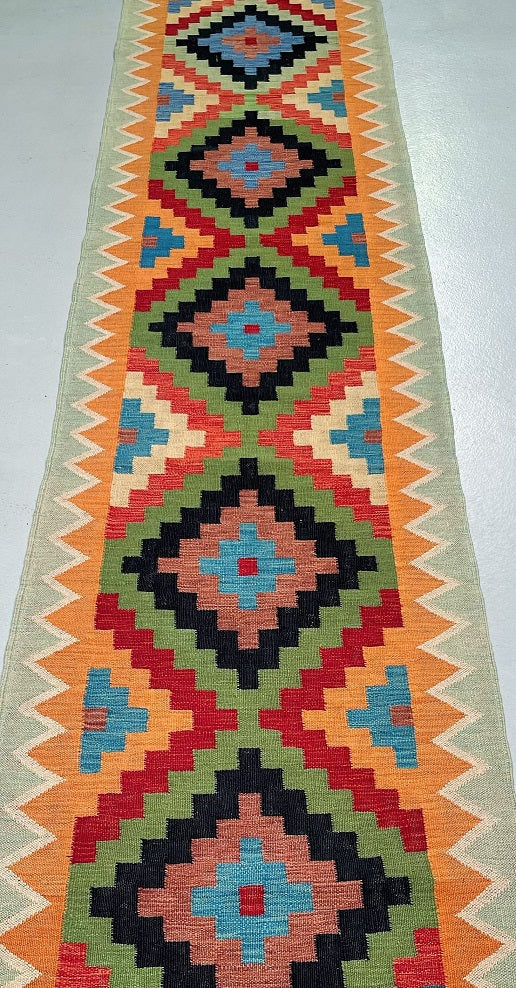 Authentic Hand Woven Afghan Kyber Kilim Hall Runner. Above All It Is Reversible. It Also Has A Pure Wool Pile On Wool Base. Vibrant Tone Dyed Using Vegetable Roots.
