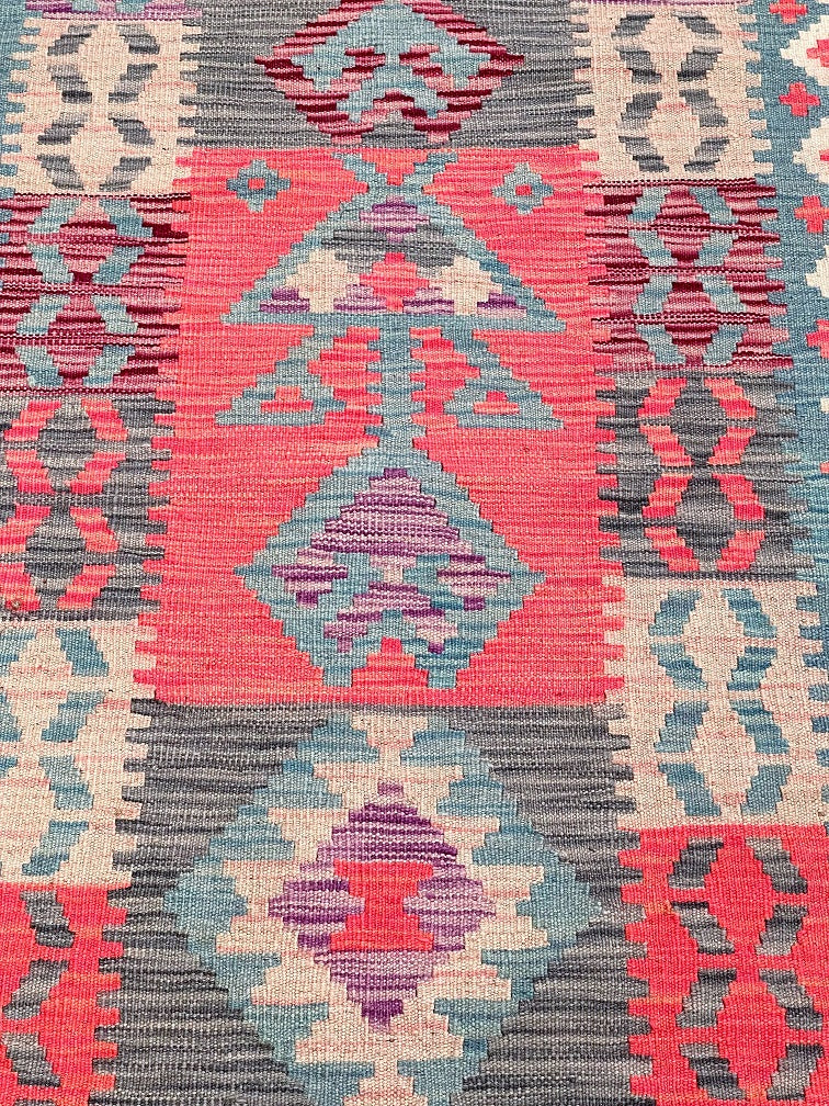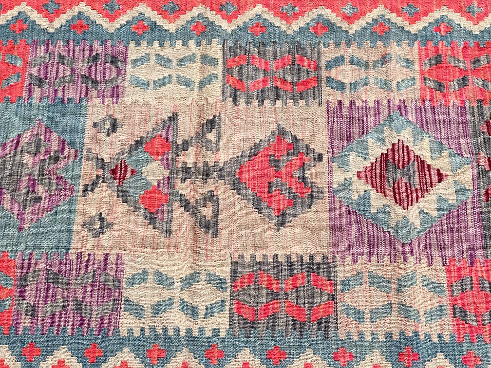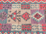 Decorative 4m Hand Woven Afghan Chobi Kilim Hall Runner. Above All It Is Reversible. It Also Has A Pure Hand Spun Wool Pile On Wool Base. Soft Pink, Beige, Blue and Purple Tone Dyed Using Vegetable Roots.
