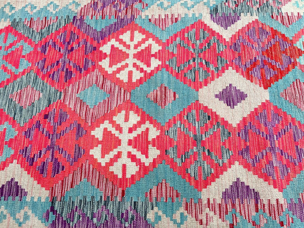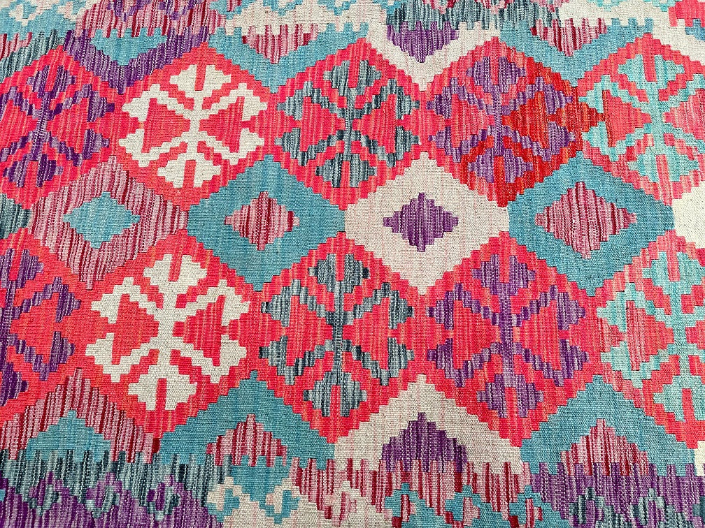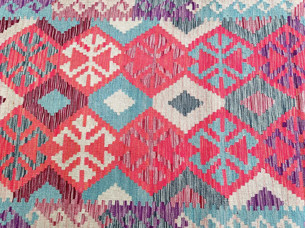 Decorative 4m Hand Woven Afghan Kyber Kilim Hall Runner. Above All It Is Reversible. It Also Has A Pure Hand Spun Wool Pile On Wool Base. Soft Pink, Beige, Blue and Purple Tone Dyed Using Vegetable Roots.