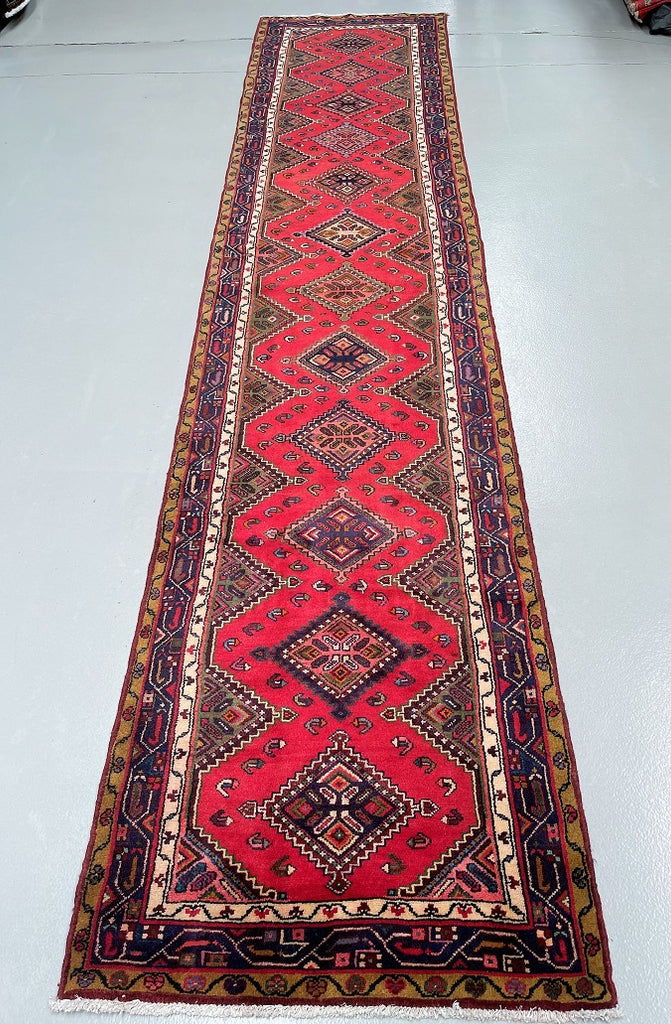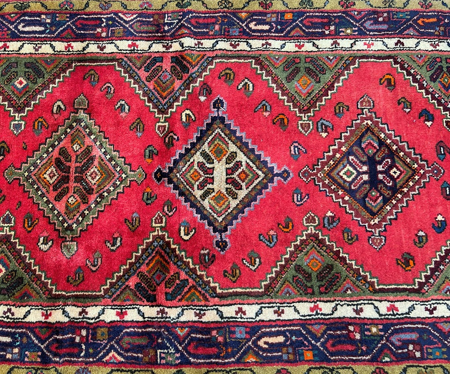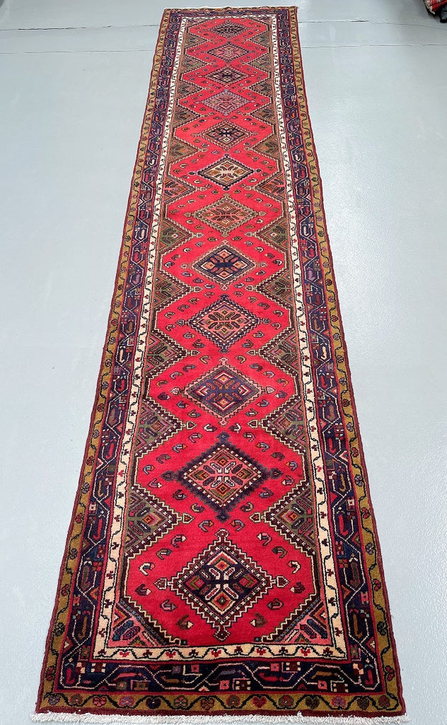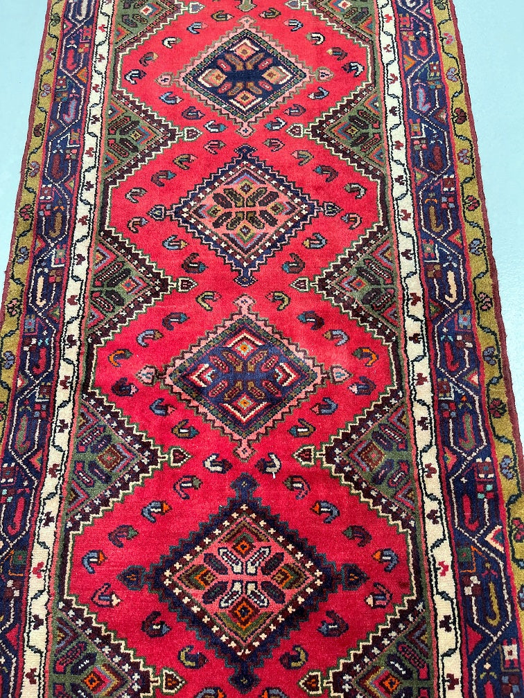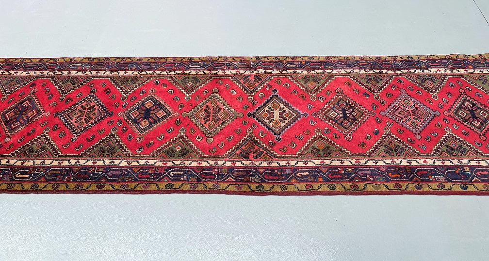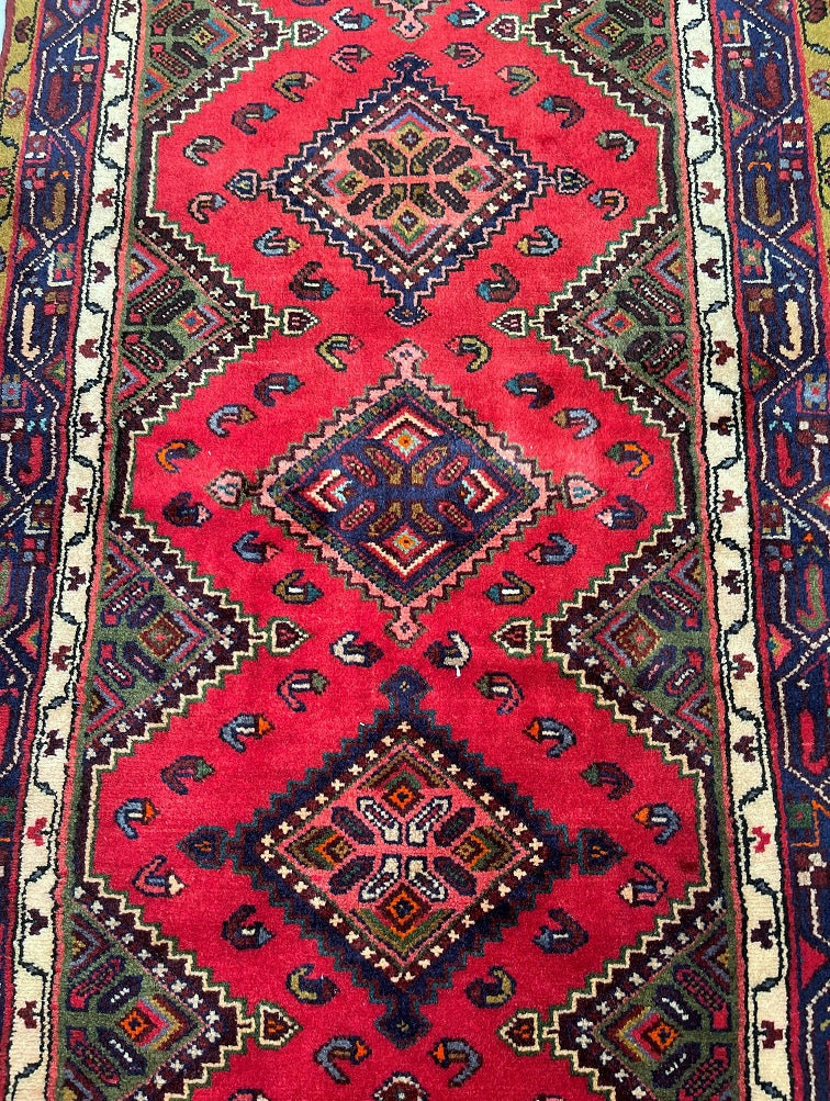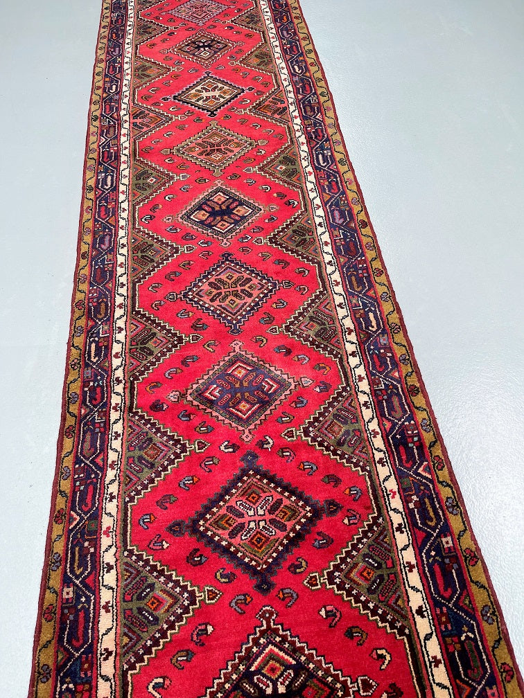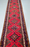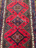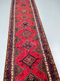 Unique Nomadic Genuine Handmade Persian Hamedan Hall Runner. Above All It Is A Hard Wearing Runner. Pure Hand Spun Wool Pile On Cotton Base. It Also Has A Soft Red, Pink, Brown, Green And Blue Tone Dyed Using Traditional Methods.