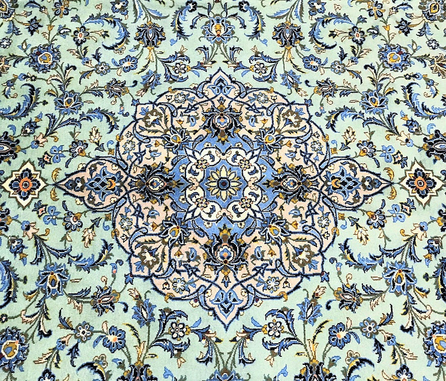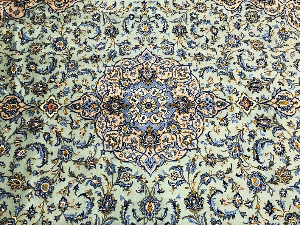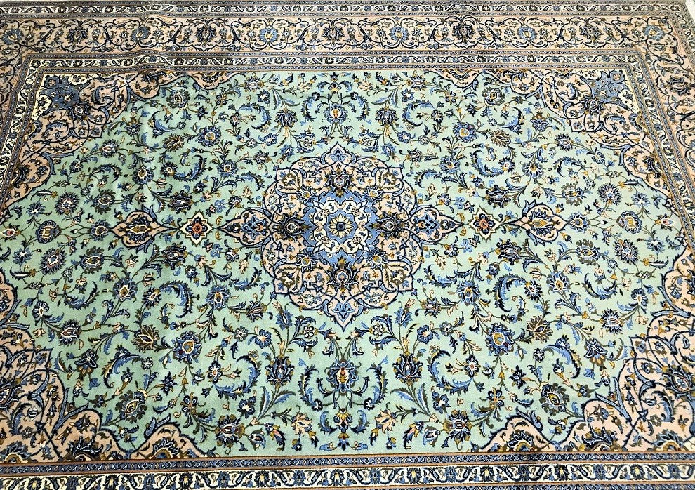 Massive Room Size Pistachio Green Tone Authentic Handmade Persian Kashan Rug. Above All It Is Hard To Get This Quality Original Handmade Rug In Such a Unique Color and Design. Pure Lamb’s Wool Pile On Cotton Base. It Also Has A Pistachio Green, Aqua, Peach, Beige and Indigo Blue Tone Dyed Using Traditional Methods.