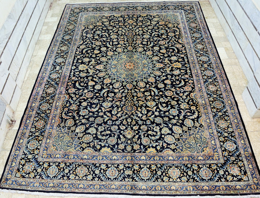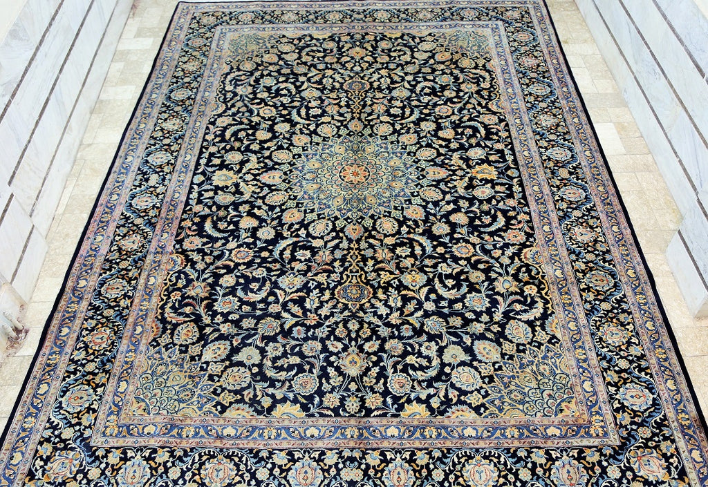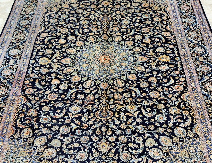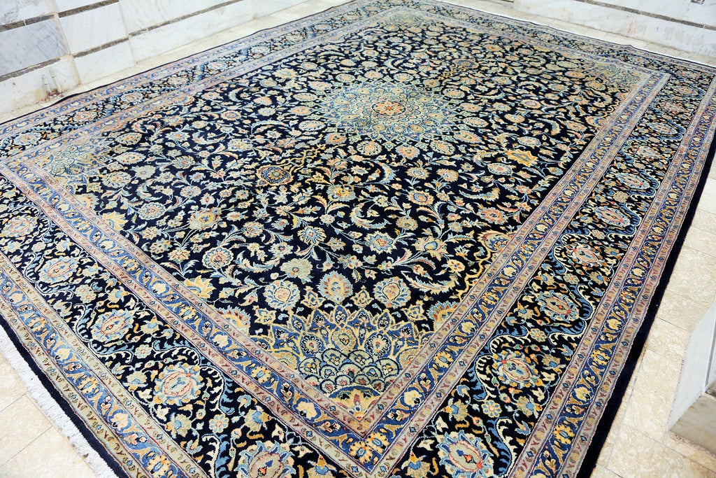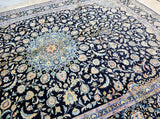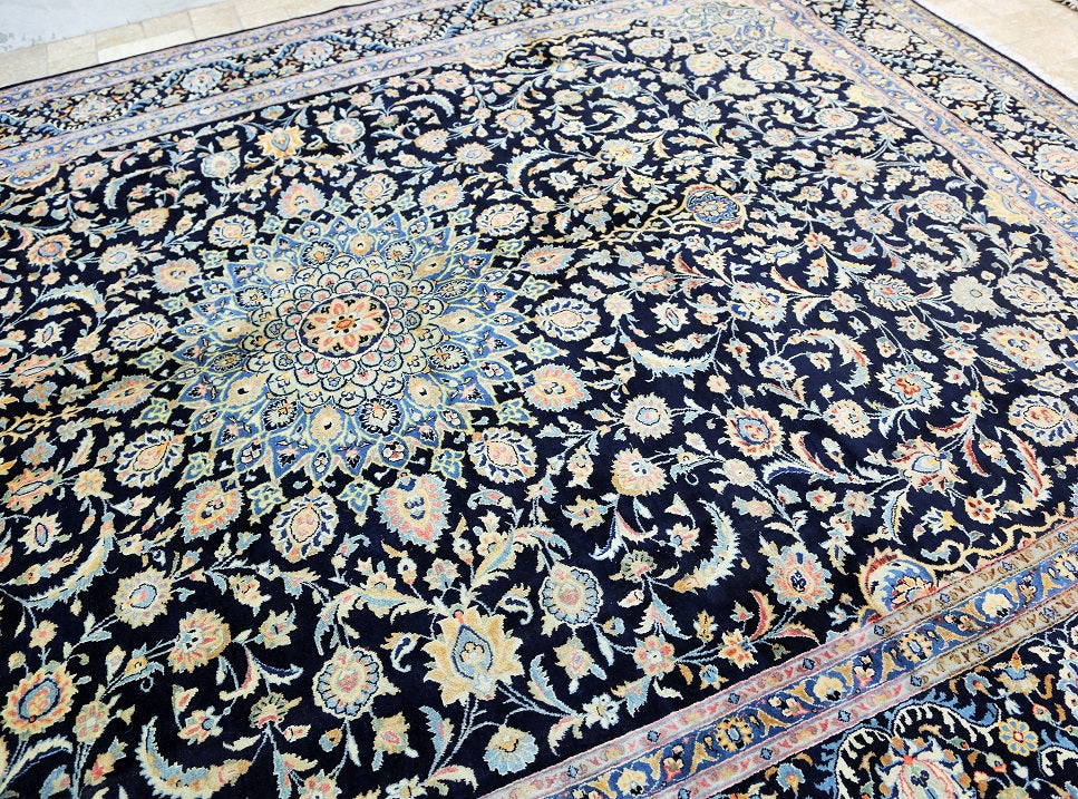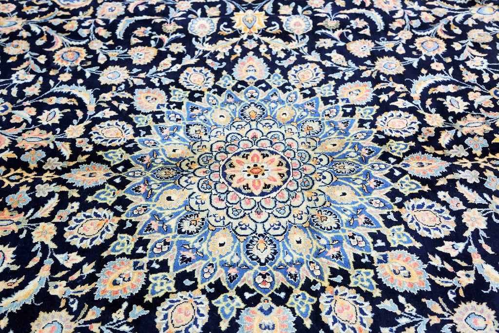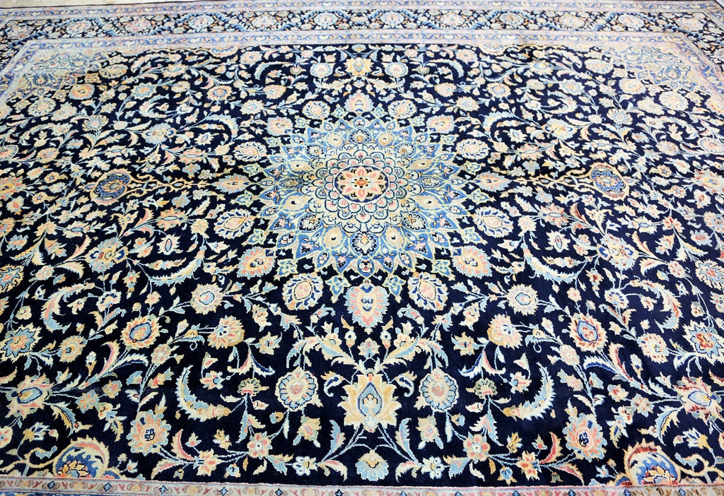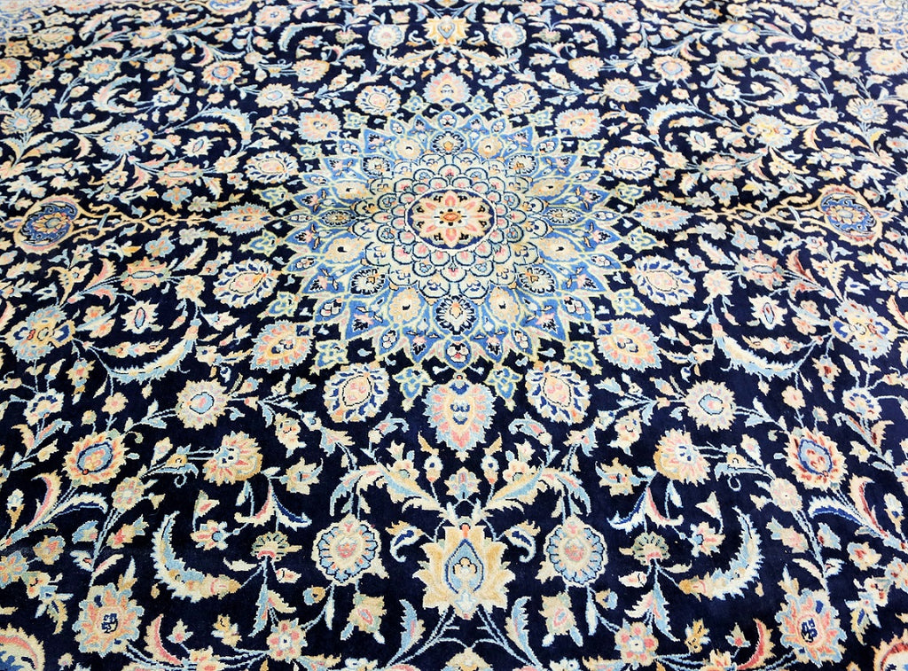 Superb Massive Room Size Authentic Handmade Persian Kashmar Rug. Above All It Is Hard To Get This Quality Original Handmade Rug In Larger Sizes. It Also Has A Pure Lamb’s Wool Pile On Cotton Base, Indigo Blue And Beige Tone Dyed Using Traditional Methods, Dense Quality Piece.