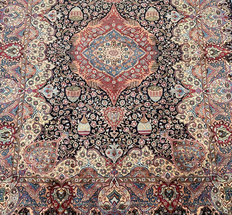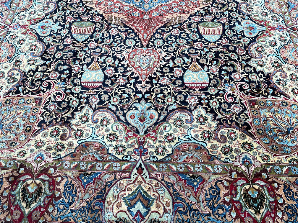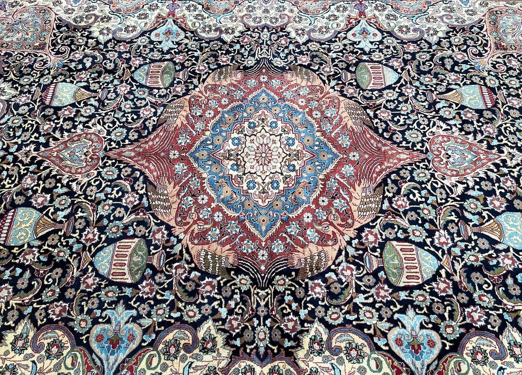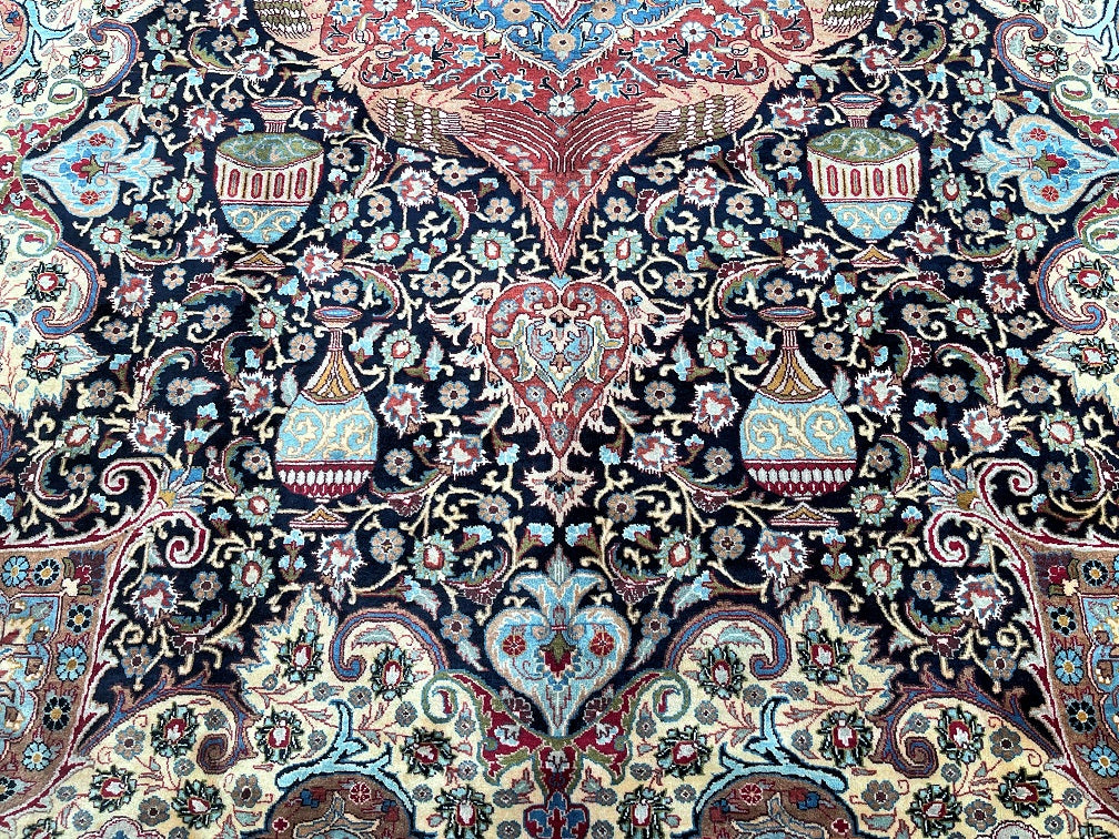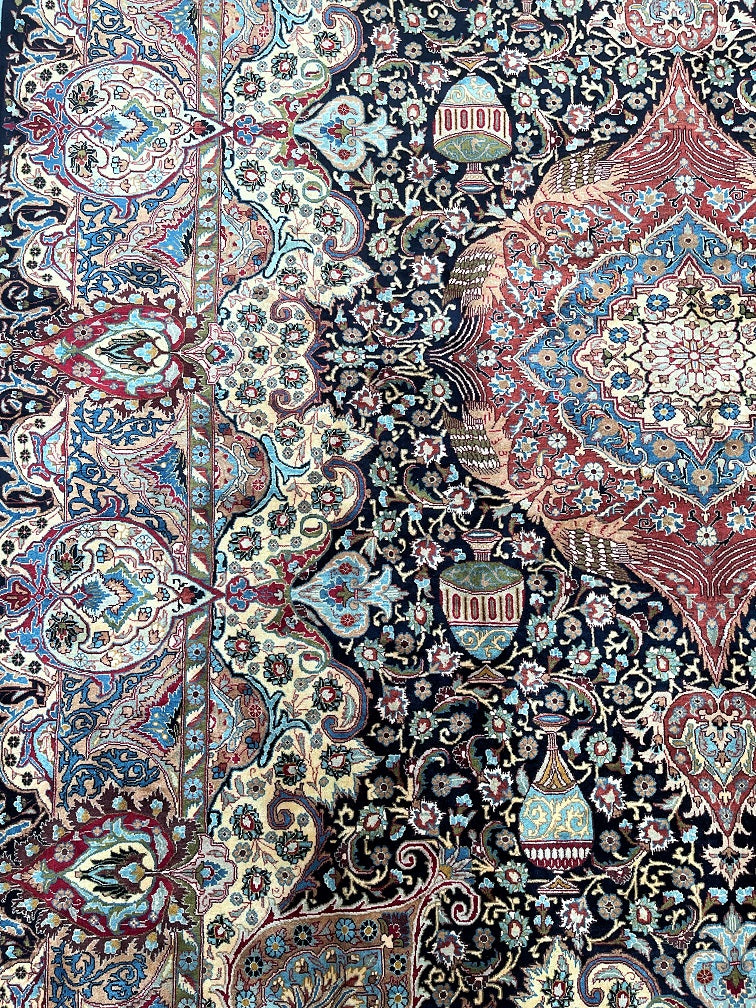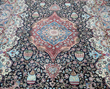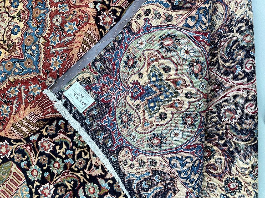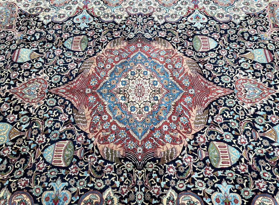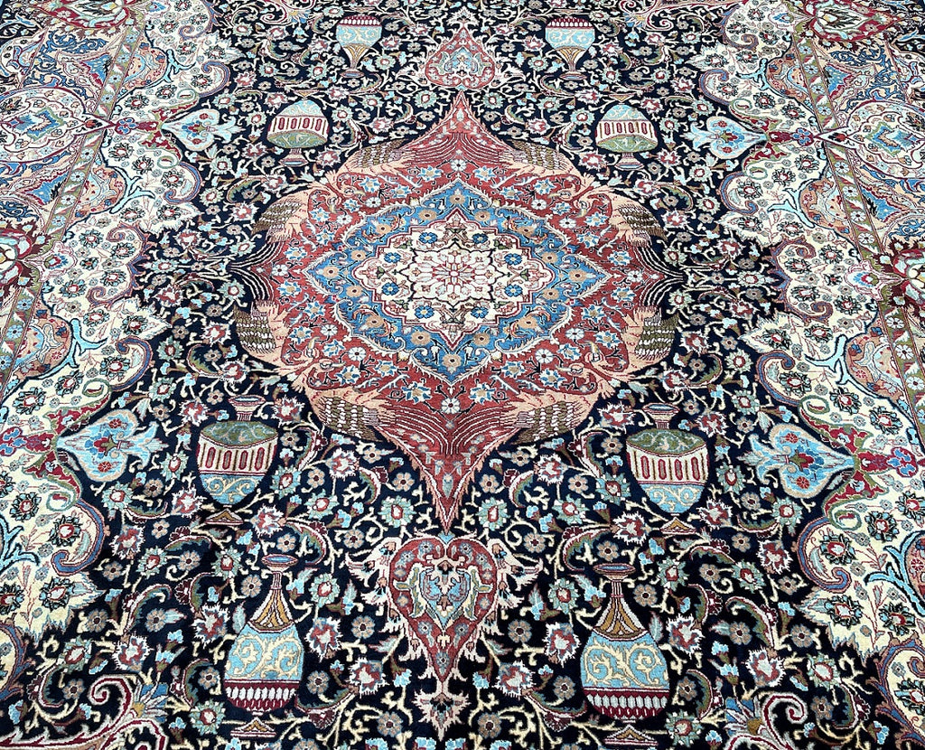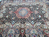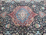 Superb Large Room Size Authentic Handmade Persian Kashmar Rug. Above All This Is A Very Unique Pattern Which Would Look Like A Floor Art On Your Floor. It Also Has A Pure Lamb’s Wool Pile On Cotton Base. It Has An Indigo Blue Background Dyed Using Traditional Methods. Dense Quality Rug That It Would Last A Life Time.