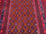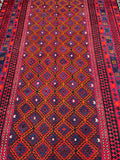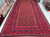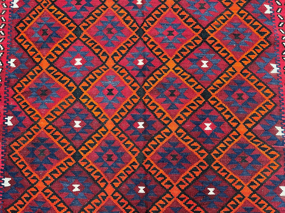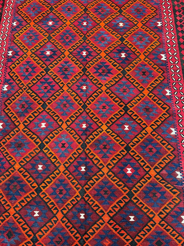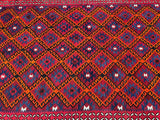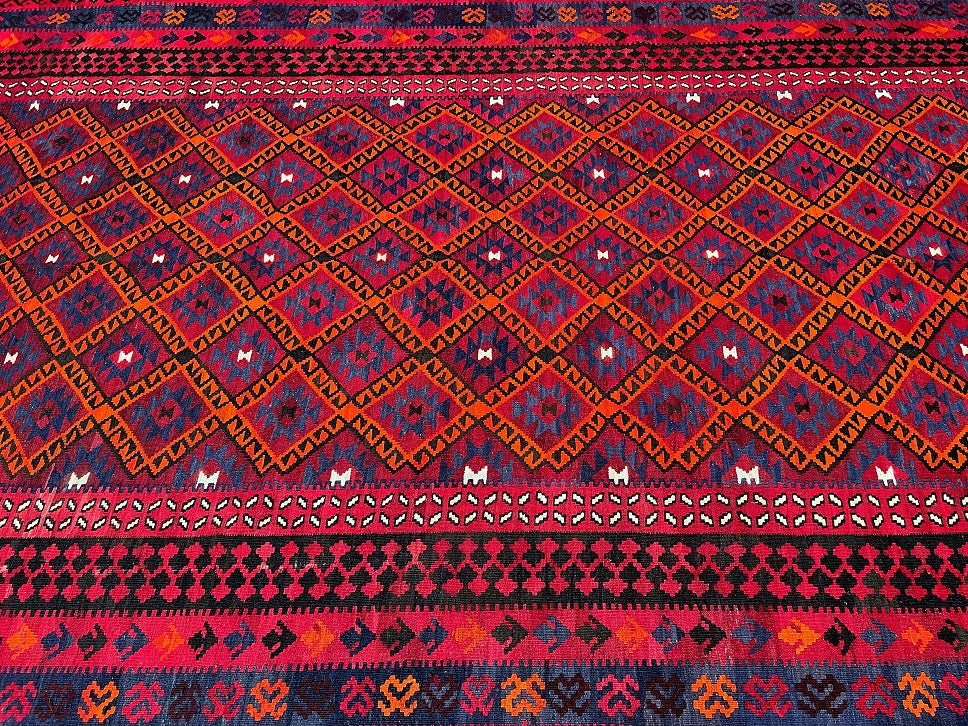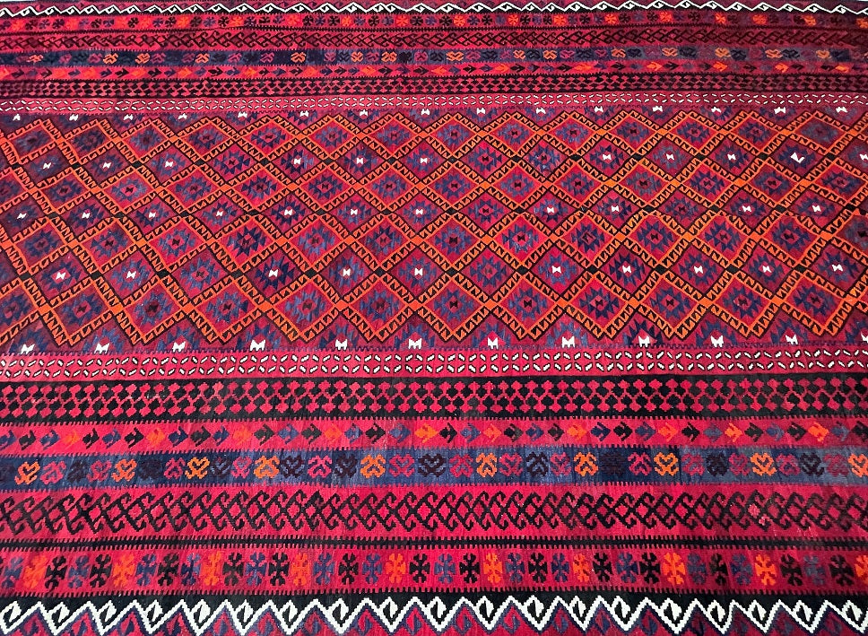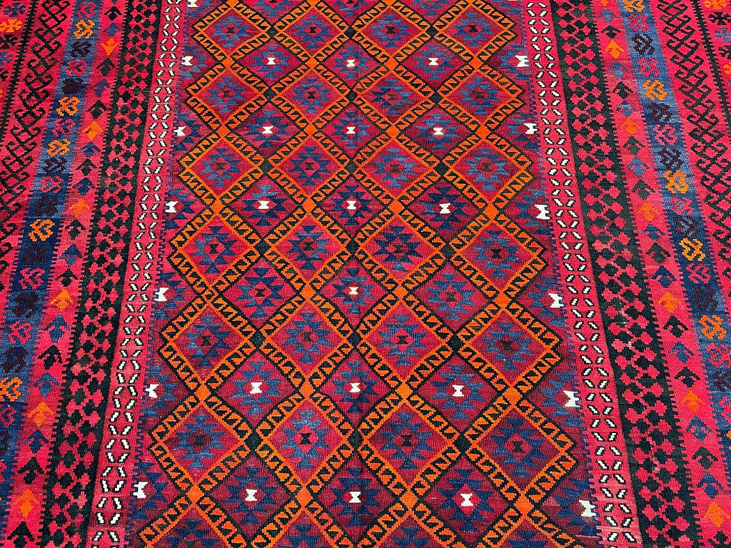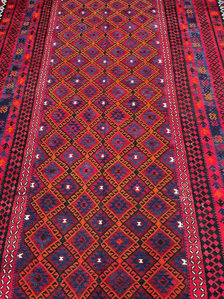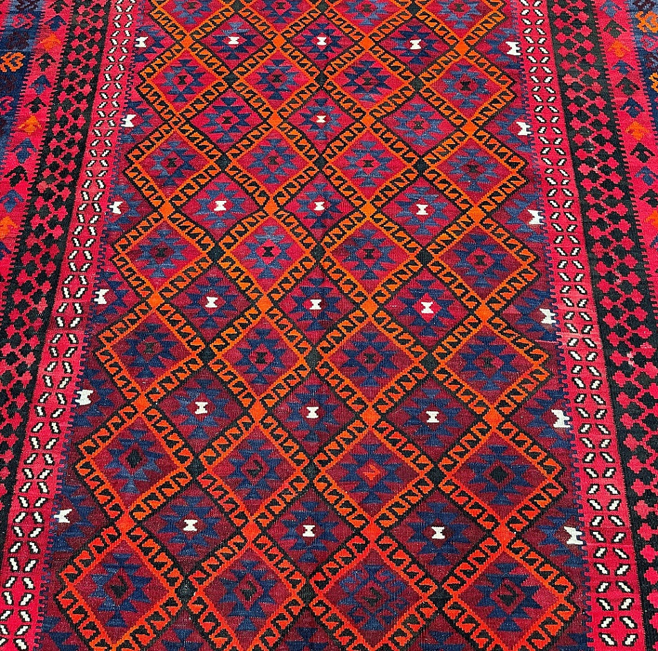 Massive Room Size Tribal Hand Woven Vintage Afghan Meymaneh Kilim Rug. Above All It Has A Pure Hand Spun Wool Pile On Wool Base. Maroon, Red, Orange, White And Black Tone Dyed Using Traditional Methods.