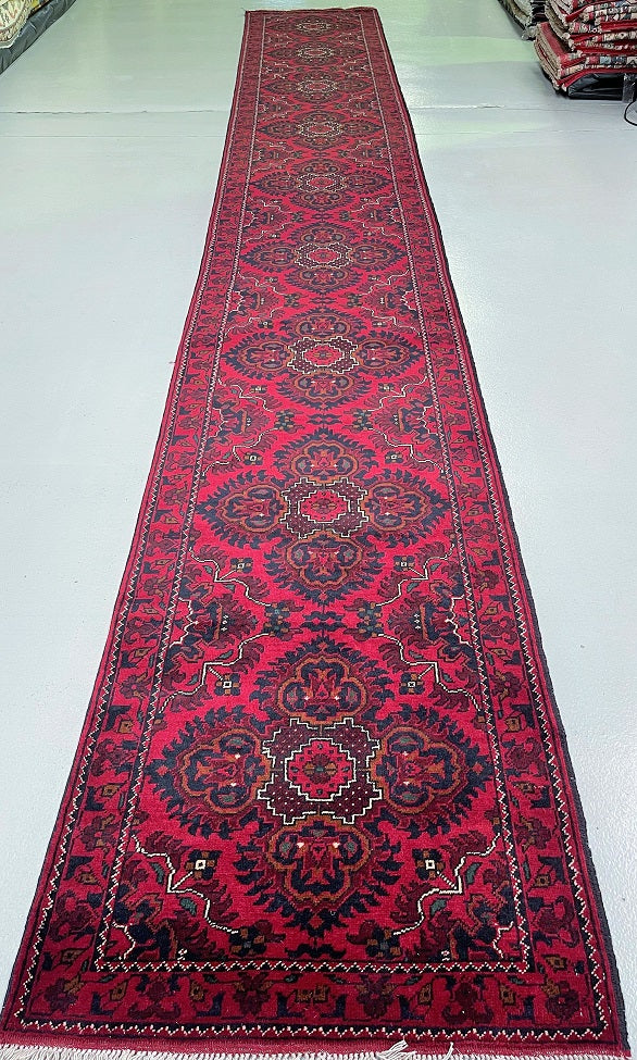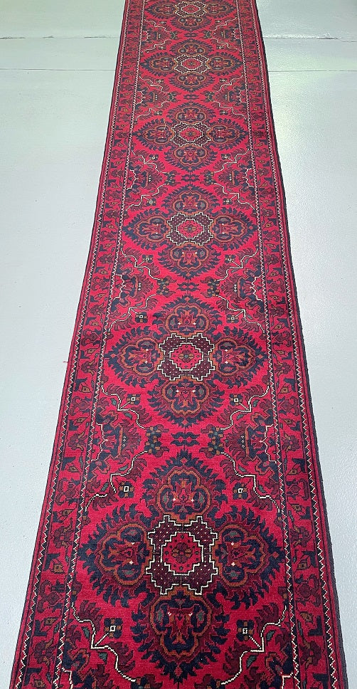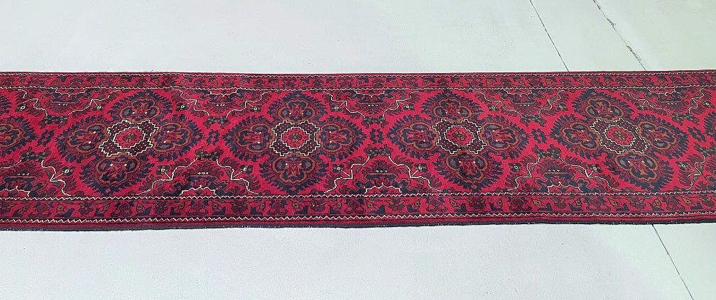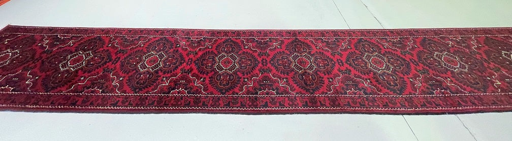 Superb Quality Authentic Hand Knotted Tribal Afghan Khamyab Hall Runner. Above All It Has A Pure Lamb’s Wool Pile On Cotton Base. It Also Has A Deep Burgundy/Maroon Tone Dyed Using Traditional Methods. This Runner Would Look Fantastic On Wooden Floor Board.