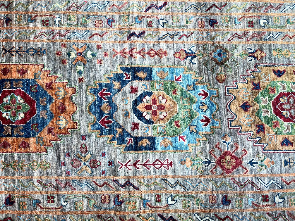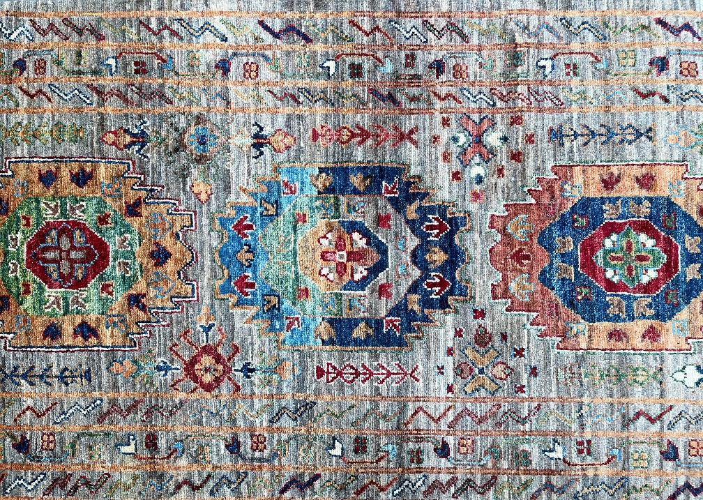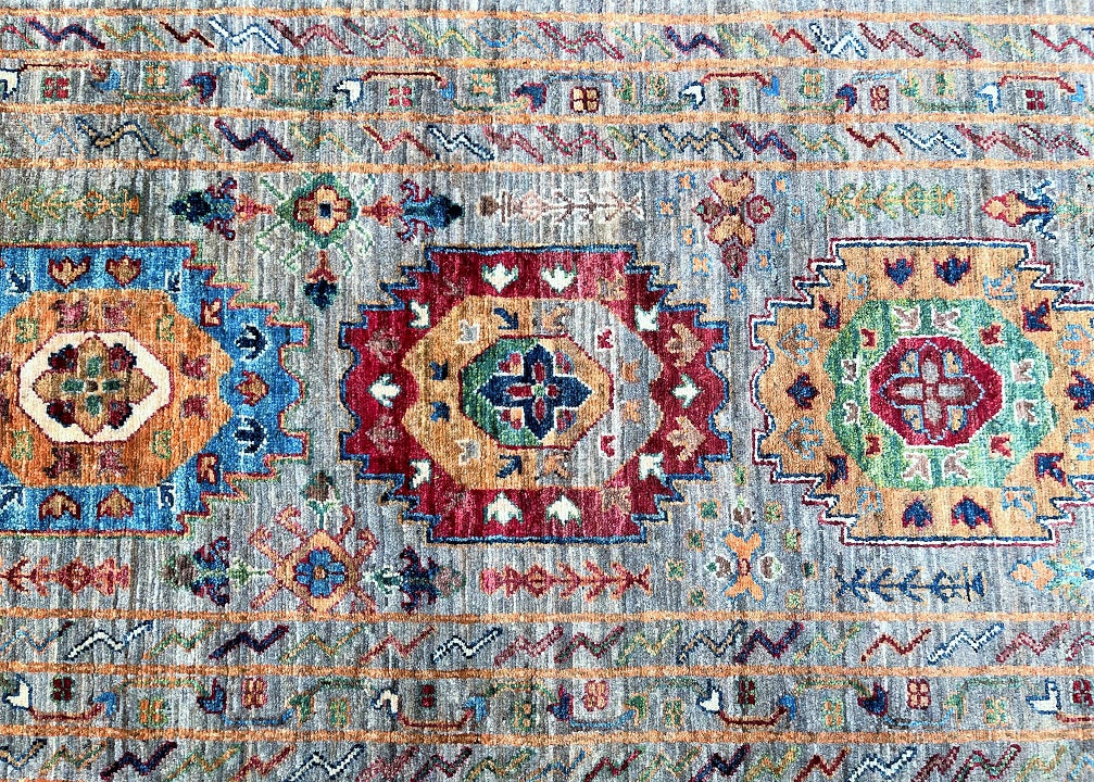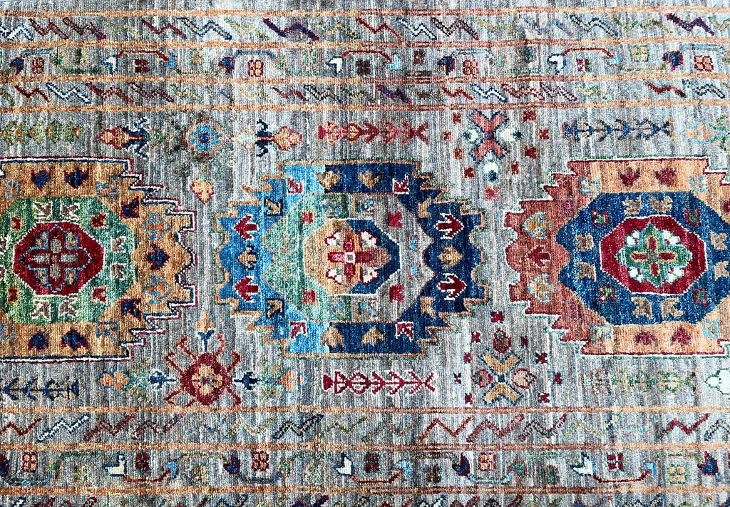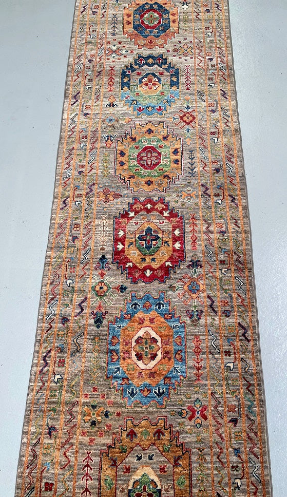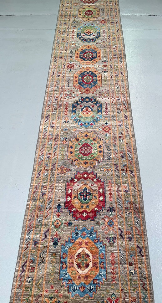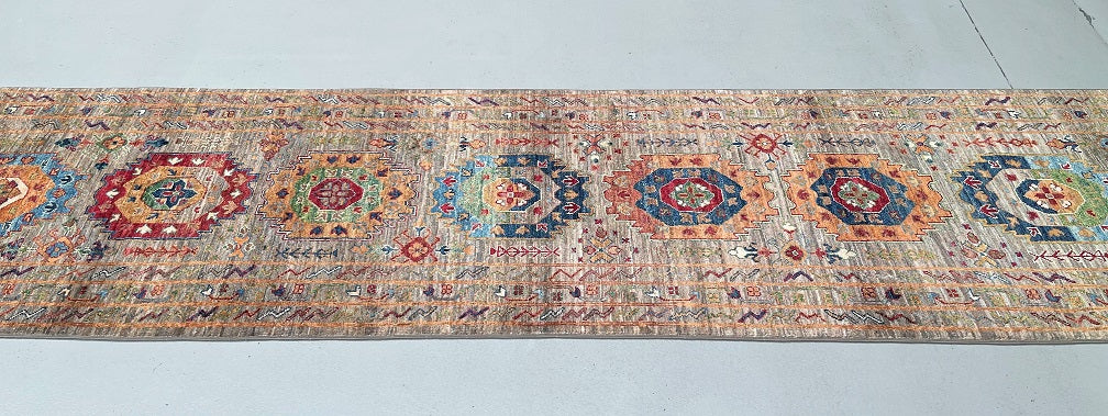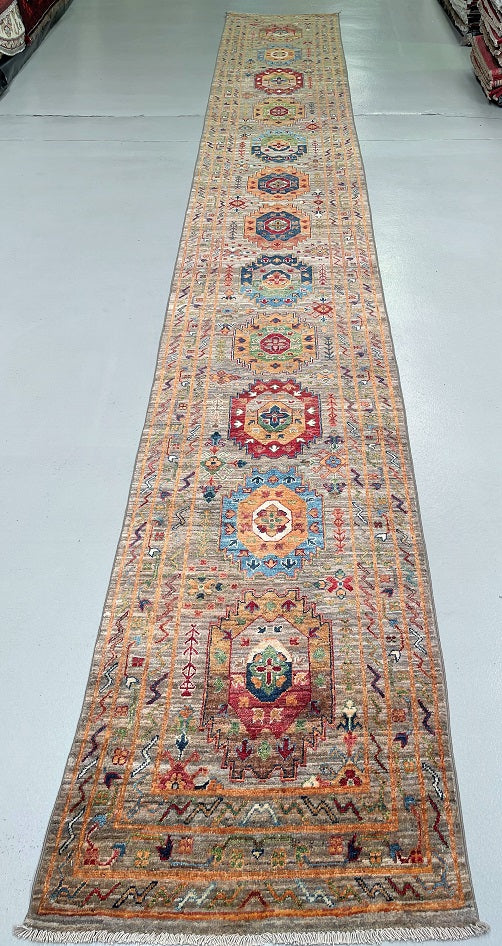 Oversize Genuine Handmade Afghan Super Kazak Hall Runner. Above All It Is Pure Hand Spun Wool Pile On Cotton Base. Light Brown, Beige, Blue, Green, Orange And Gold Tone Dyed Using Traditional Methods (Vegetable Dyes). Last Of True Woven Tribal Art.