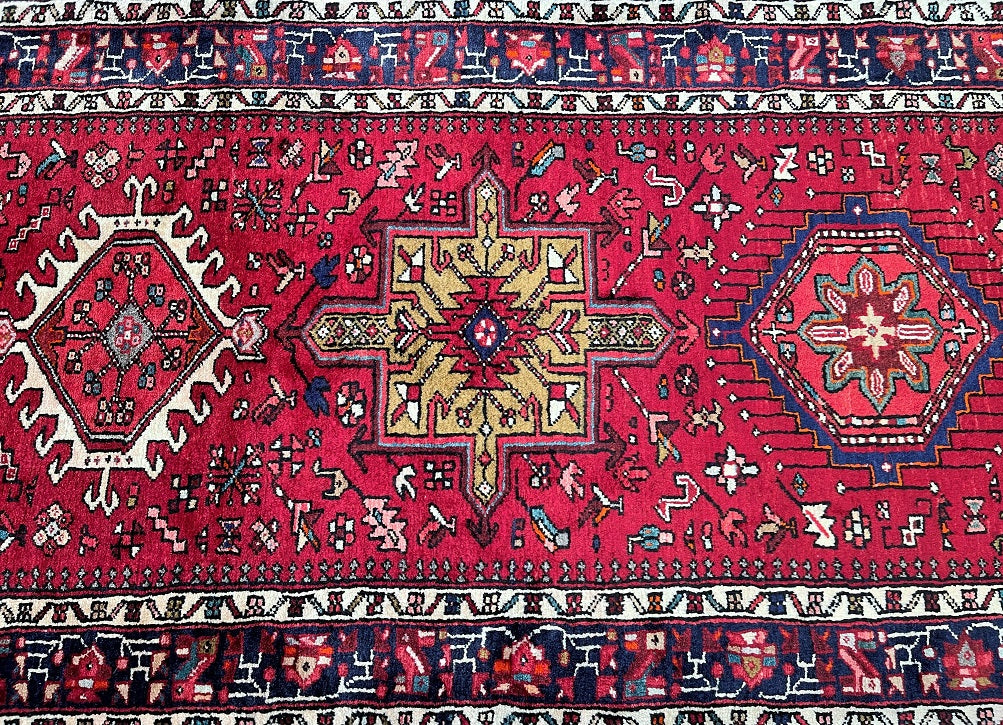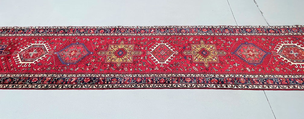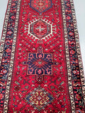 Rare Extra Long Authentic Handmade Persian Qarajeh Hall Runner. Above All It Is Hard To Find Runners Over 4m Long. It Has A Pure Hand Spun Wool Pile On Cotton Base. Red, Blue, Beige, Black, Mustard And Pink Tone Dyed Using Traditional Methods.