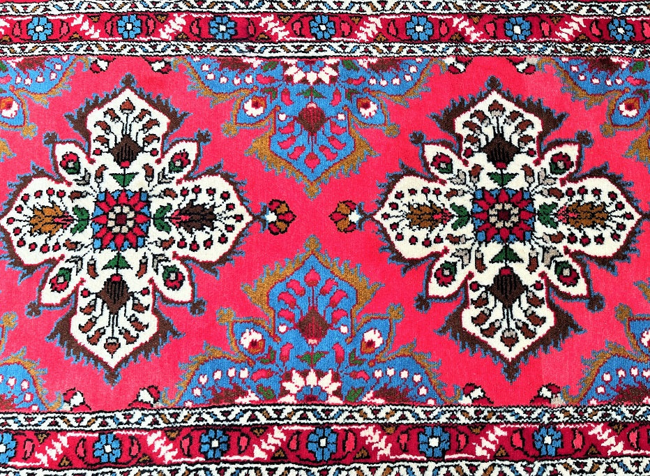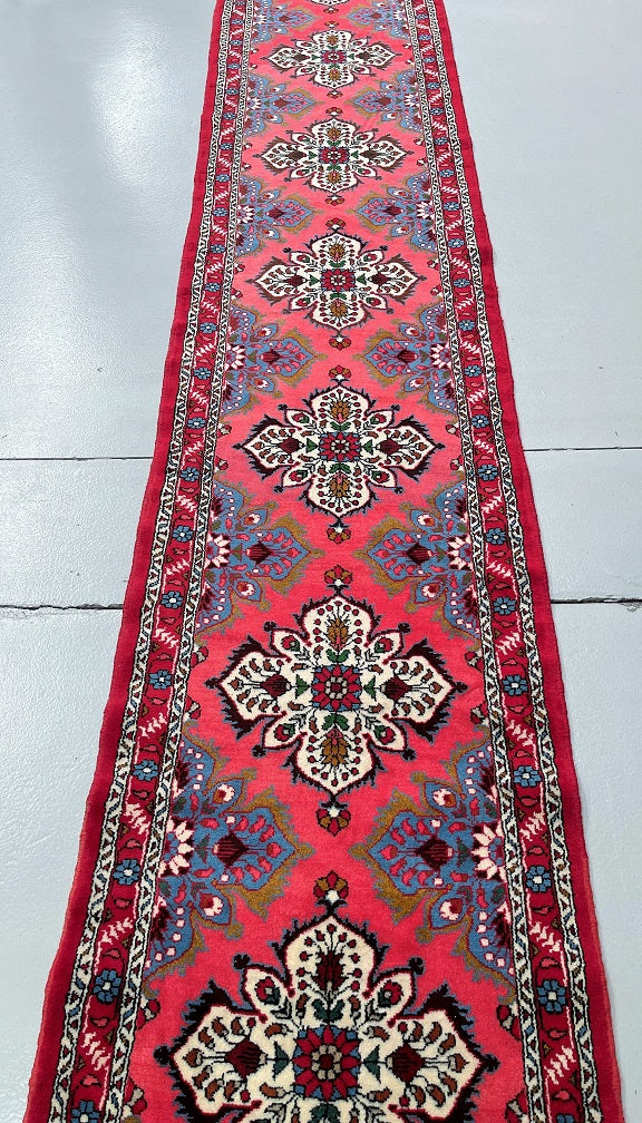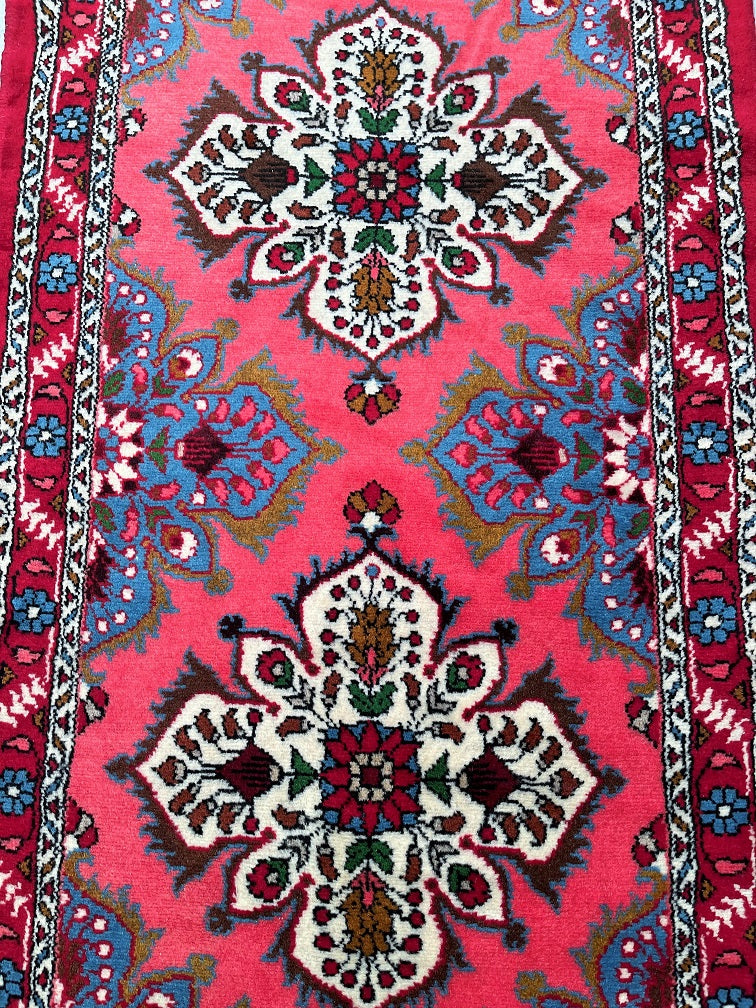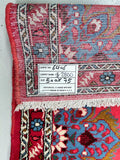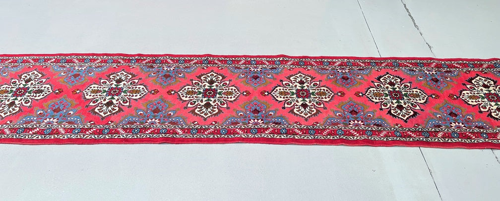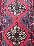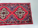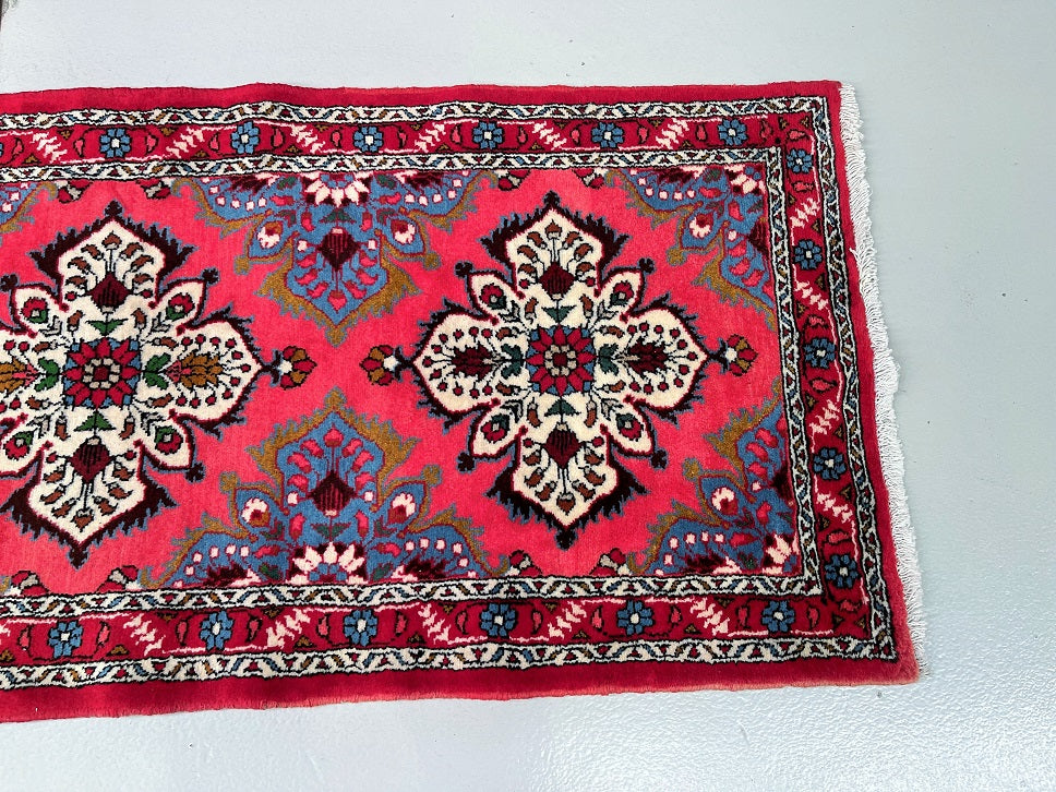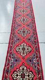 Authentic Hand Knotted Persian Hamadan Hall Runner. Above All It Has A Slight Bend But It Is Normal For Handmade Runners. Pure Hand Spun Wool Pile On Cotton Base. Unique Pink, Light Blue, Red, Black, Brown And Brown Tone Dyed Using Traditional Methods.