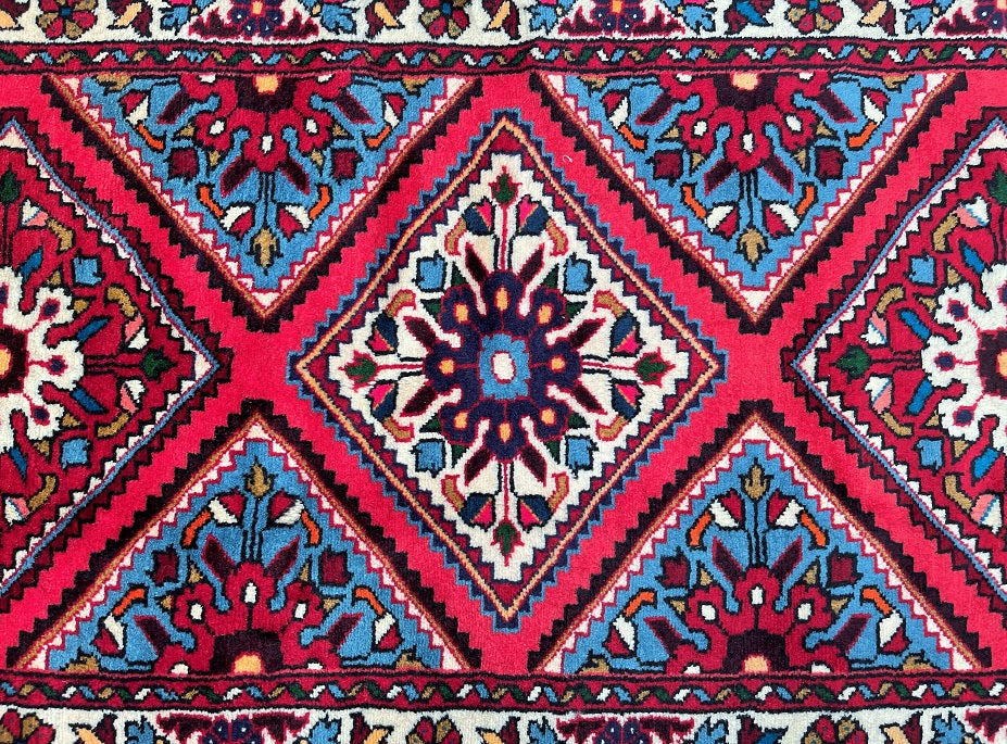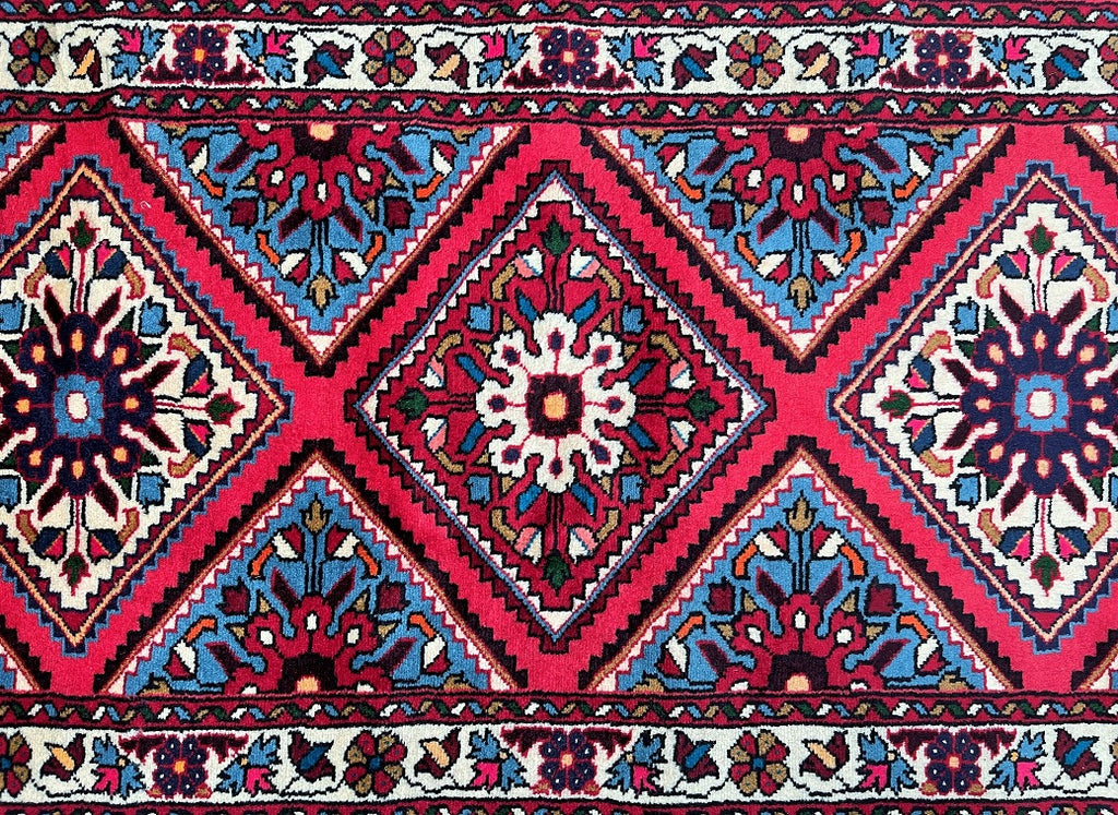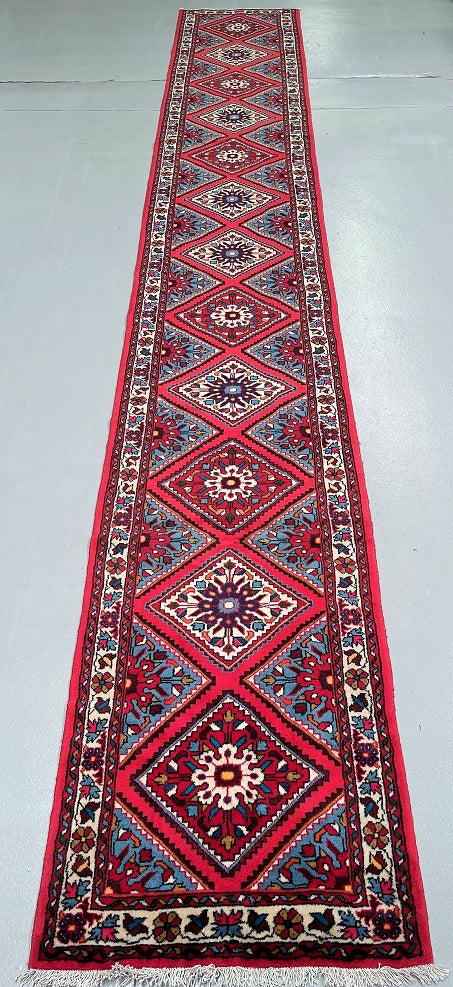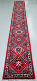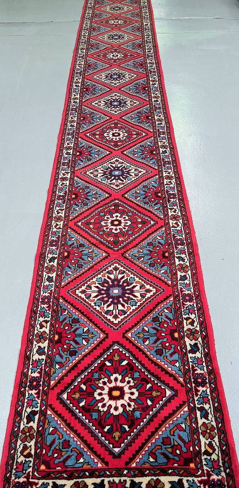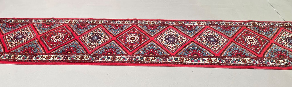 Authentic Hand Knotted Persian Hamadan Hall Runner. Above It Has A Pure Hand Spun Wool Pile On Cotton Base. Pink, Light Blue, Red, Indigo Blue, Orange, Black, Brown And Brown Tone Dyed Using Traditional Methods.