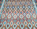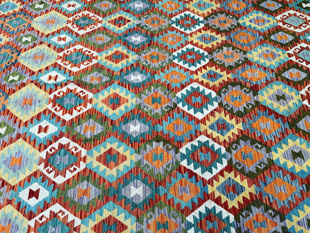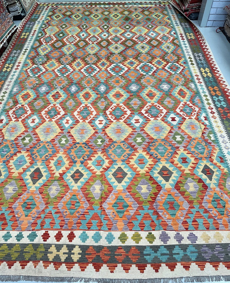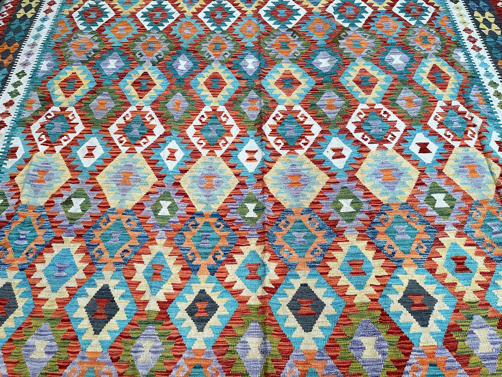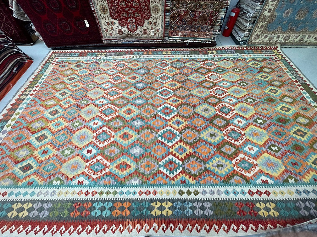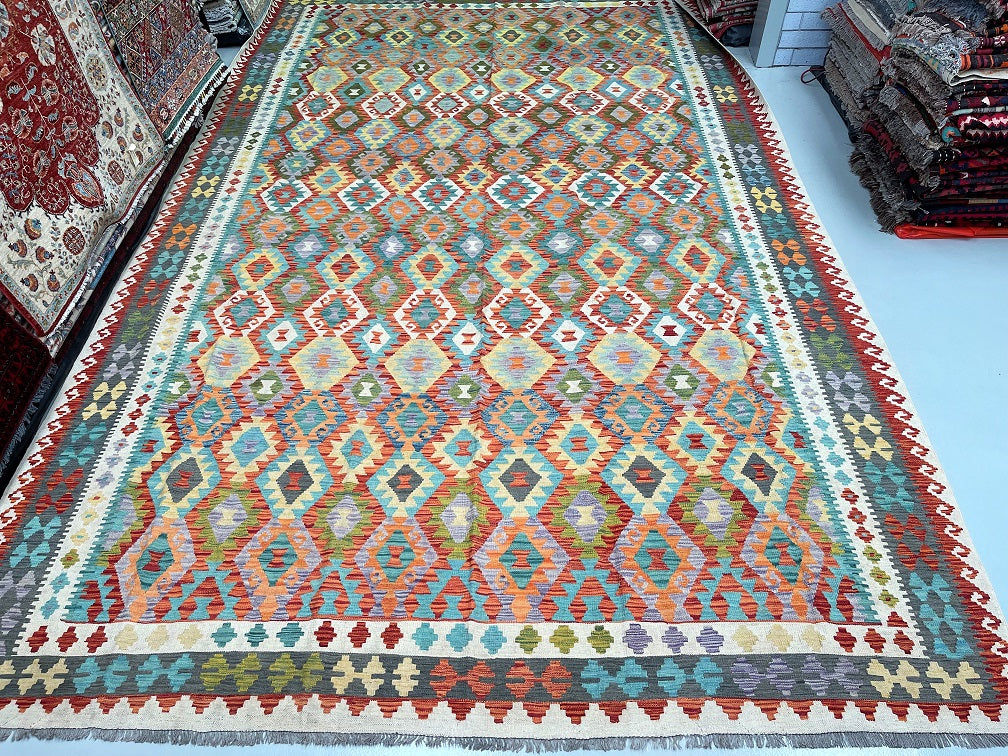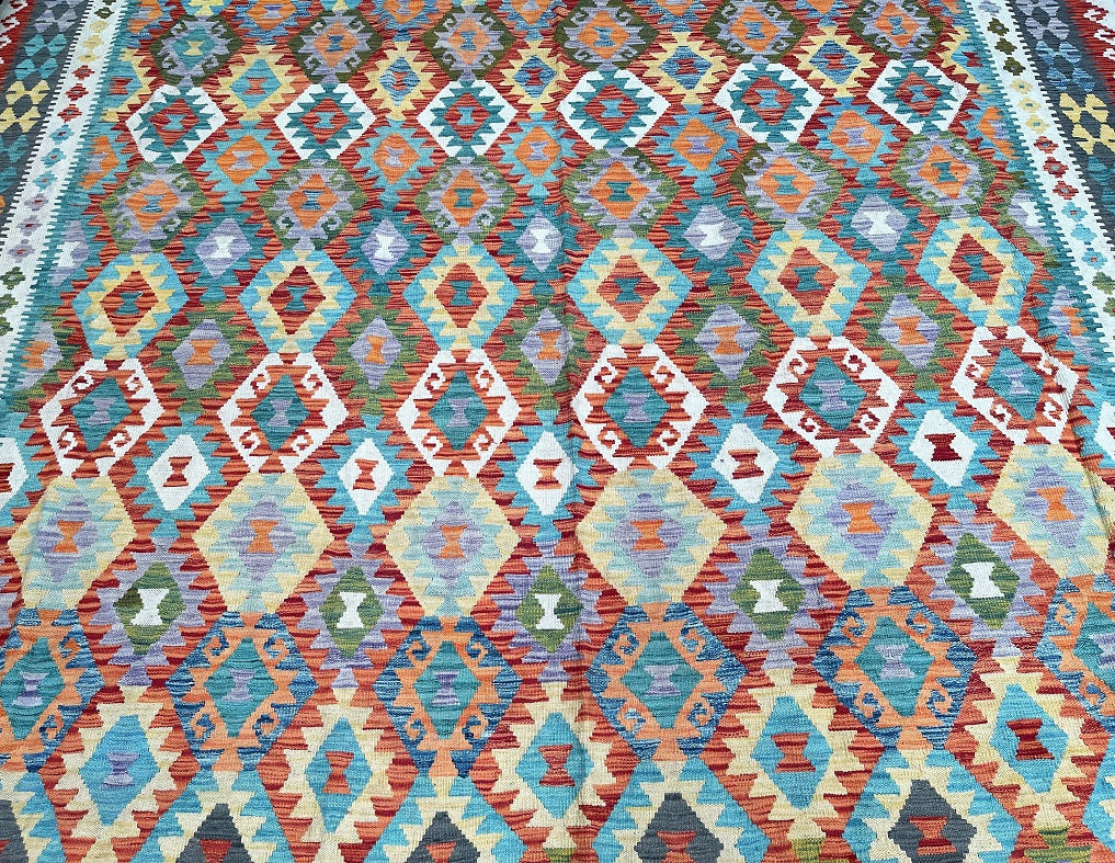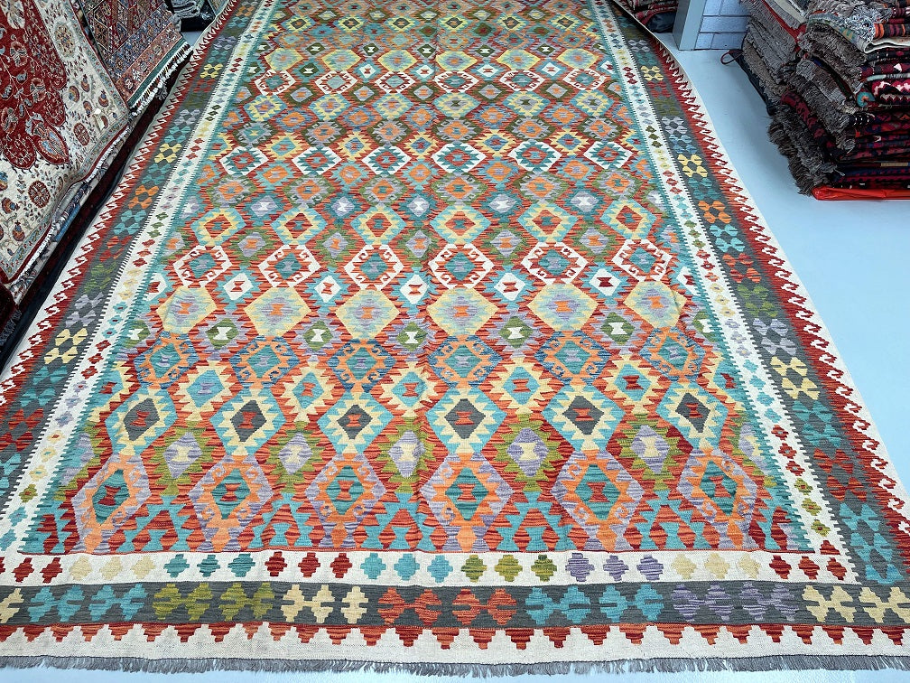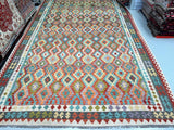 Massive Room Size Handmade Afghan Aryana Kilim Rug. Above All It Is Rare To Find These Boho Kilim Rugs In Such Large Size. It Also Has A Pure Hand Spun Wool Pile On Wool Base. Multi-Color Tone Dyed Using Vegetable Roots.