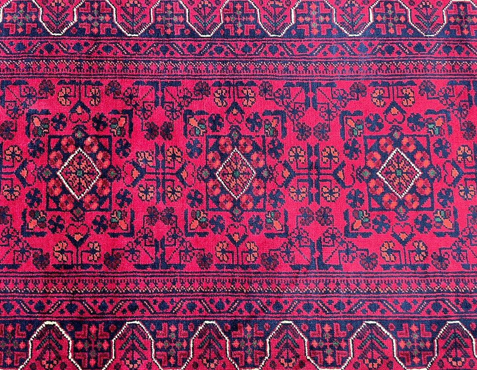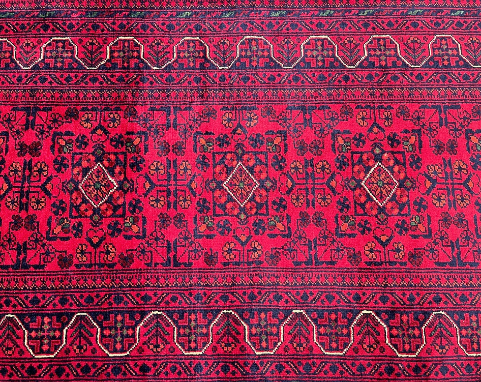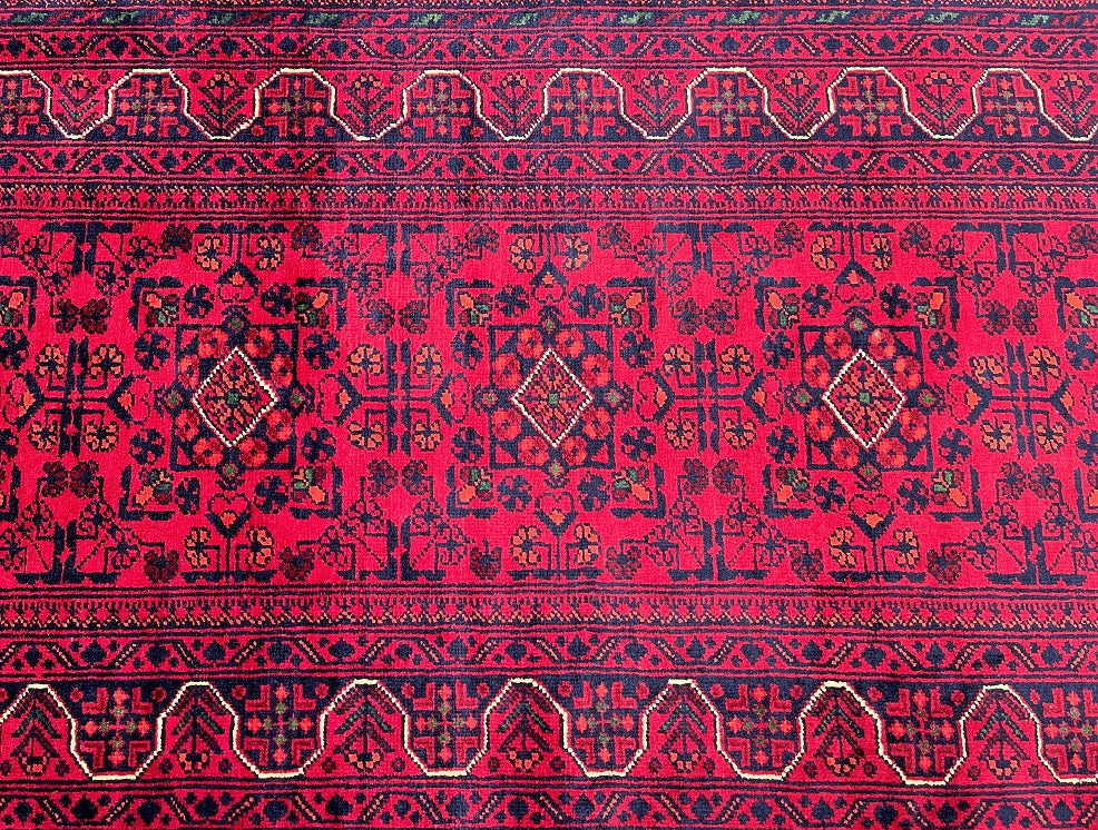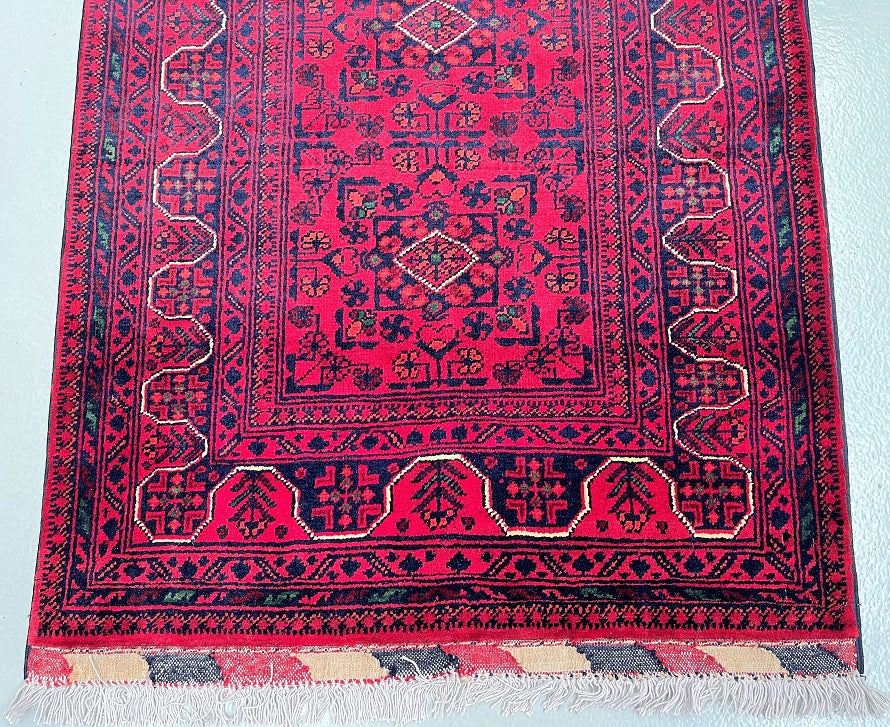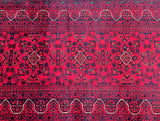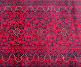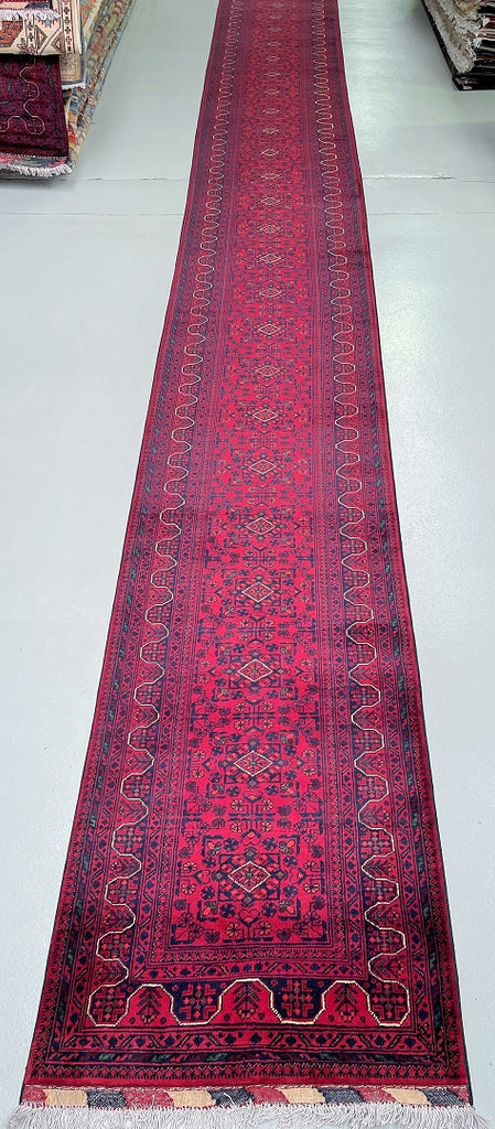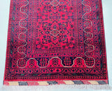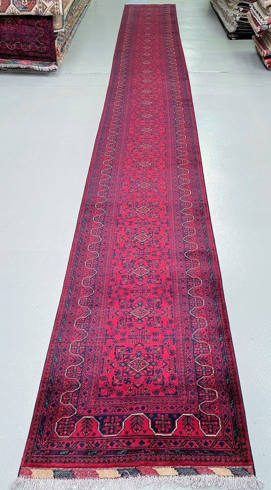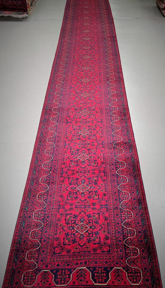 Superb Oversize Hand Knotted Tribal Afghan Kunduz Hall Runner. Above All It Has A Pure Lamb’s Wool Pile On Cotton Base. It Also Has A Burgundy/Maroon Tone Dyed Using Traditional Methods. This Runner Would Look Fantastic On Wooden Floor Board.