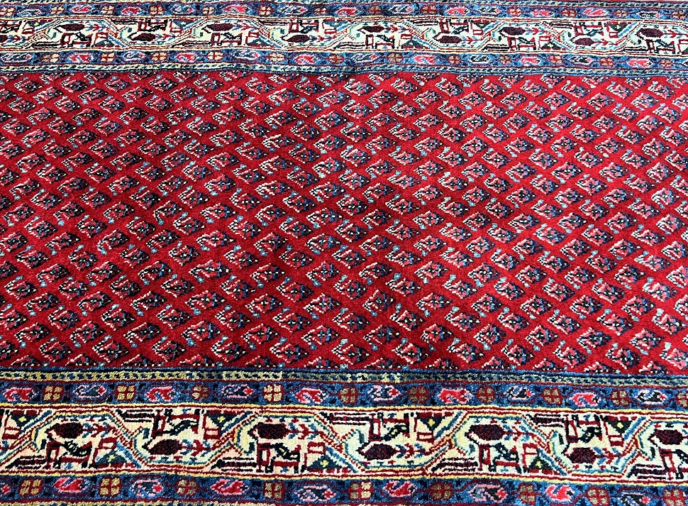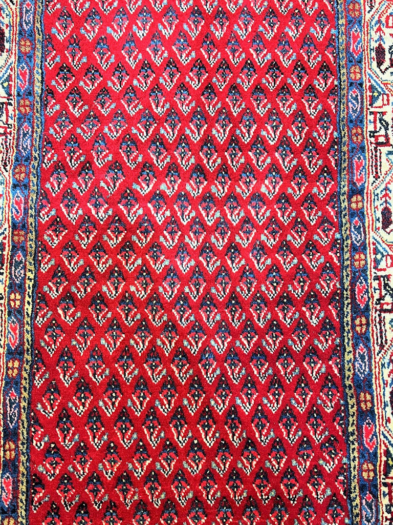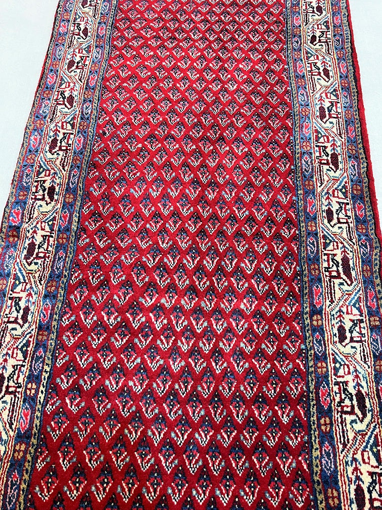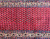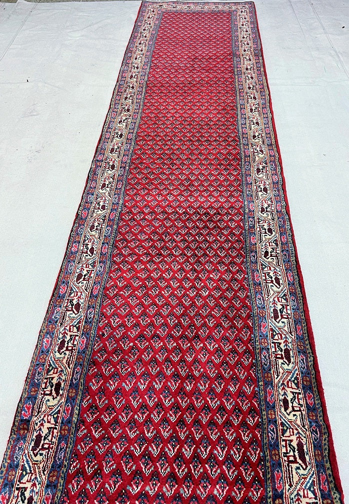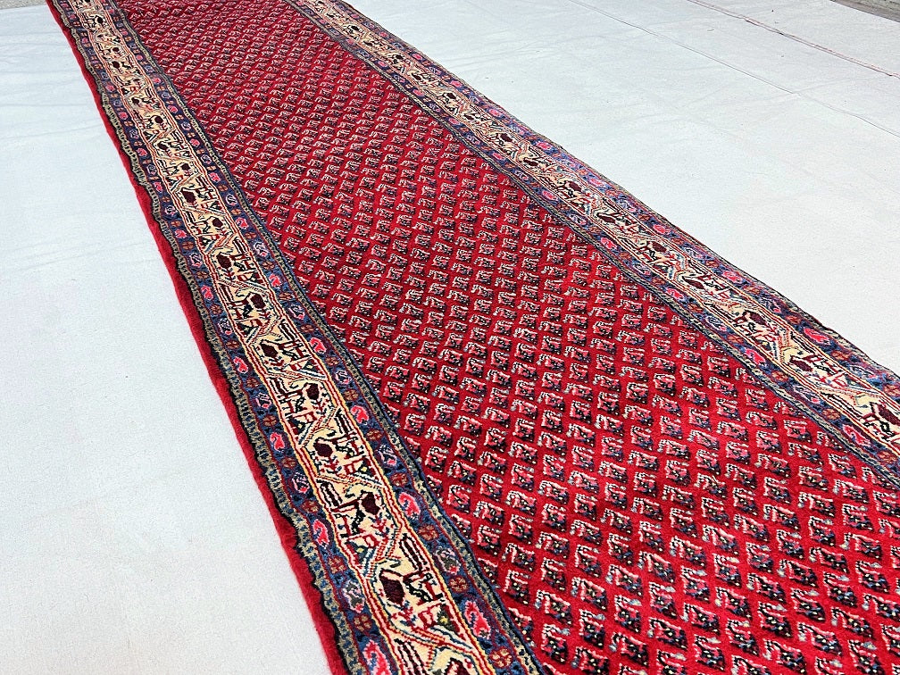 Extra Long Authentic Handmade Persian Boteh Mir Hall Runner. Above It Is Hard To Get Quality Handmade Hall Runners In Such Length. It Also Pure Lamb’s Wool Pile On Cotton Base. It Has A Red, Blue, Pink, Yellow And Beige Tone Which Was Dyed Using Traditional Methods.
