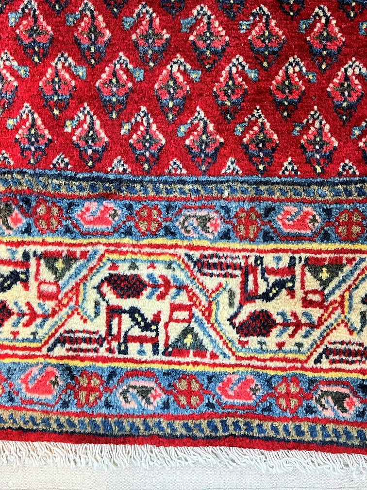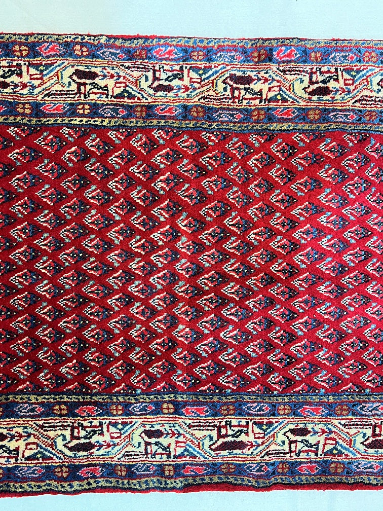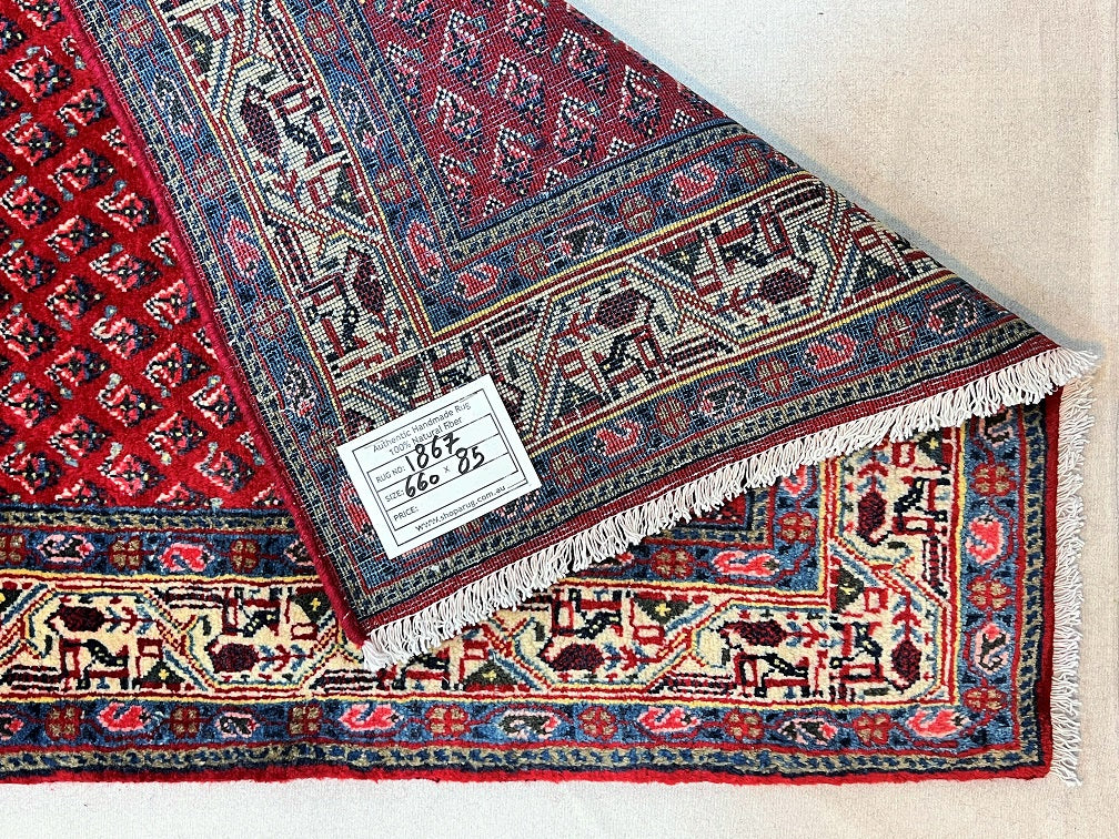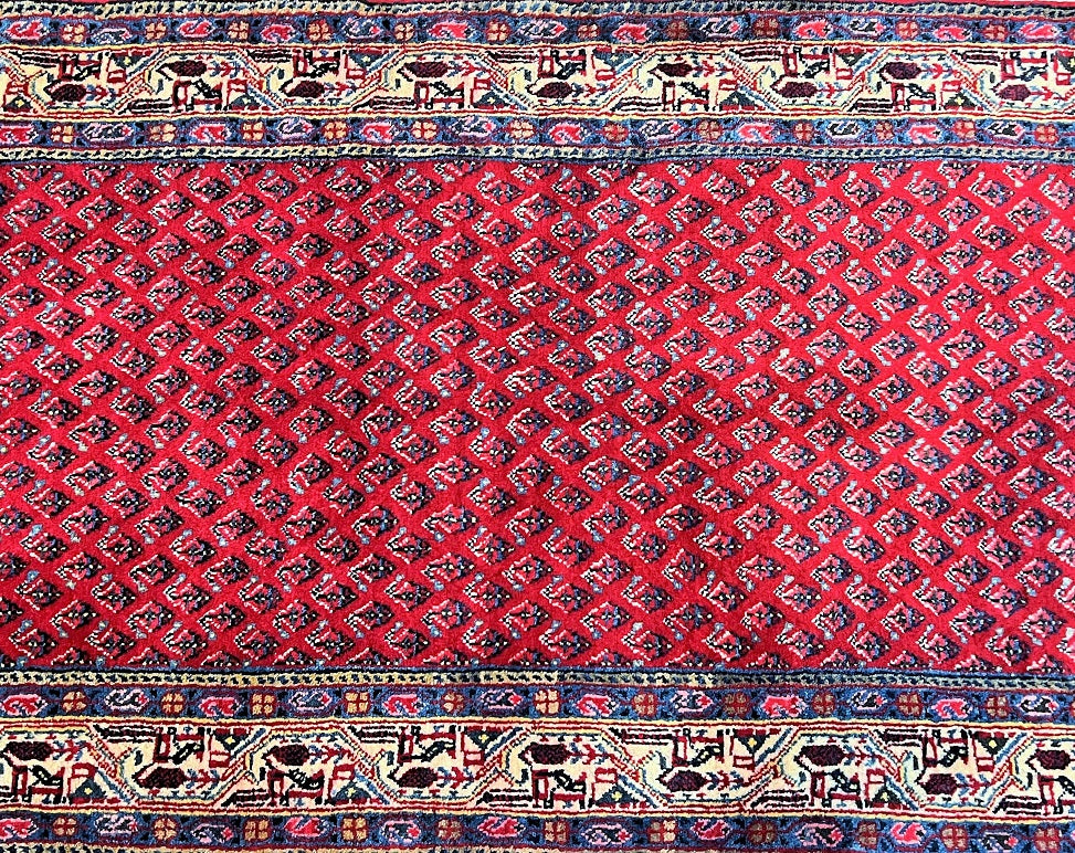 Extra Long Authentic Handmade Persian Boteh Mir Hall Runner. Above It Is Hard To Get Quality Handmade Hall Runners In Such Length. It Also Pure Lamb’s Wool Pile On Cotton Base. It Has A Red, Blue, Pink, Yellow And Beige Tone Which Was Dyed Using Traditional Methods.