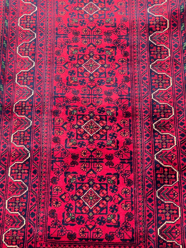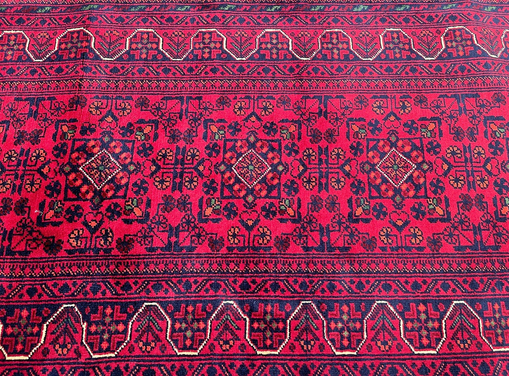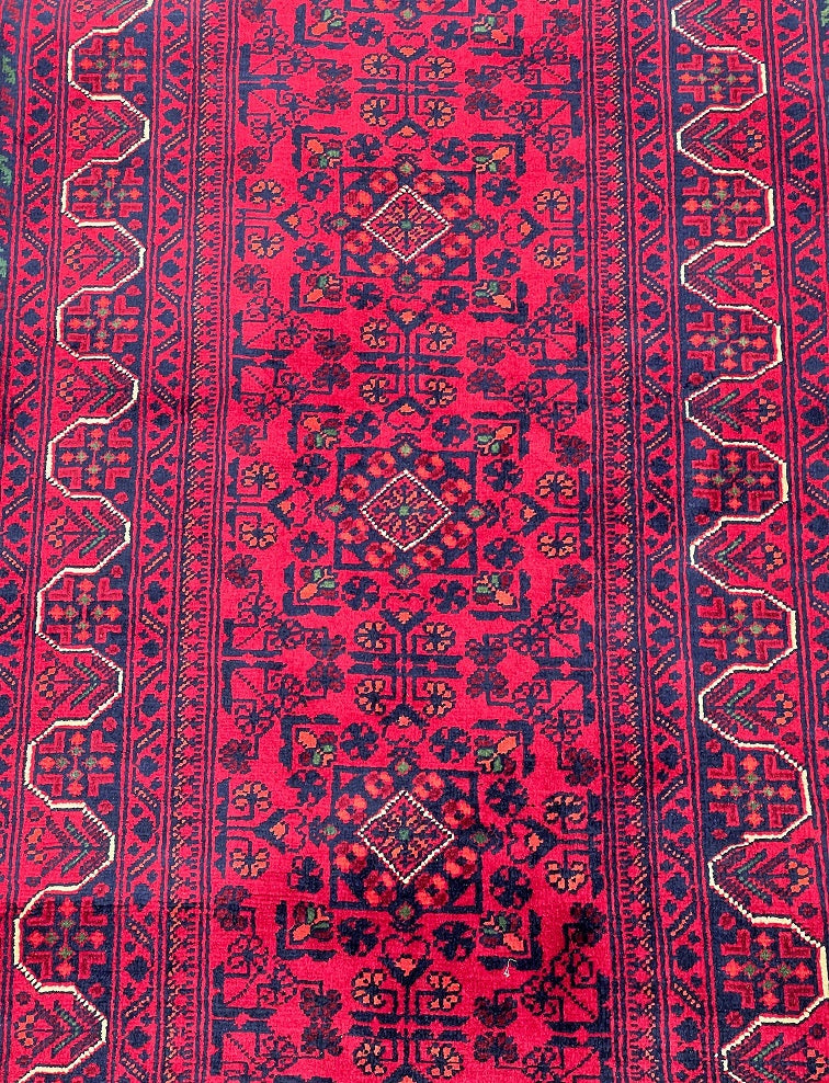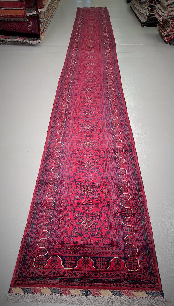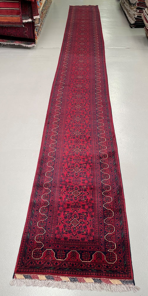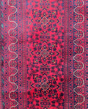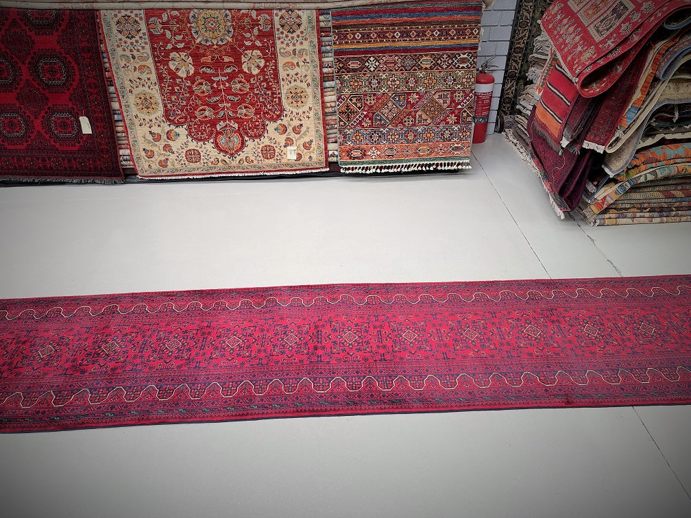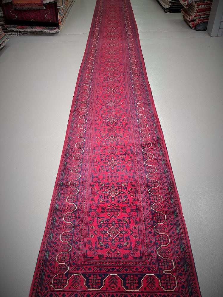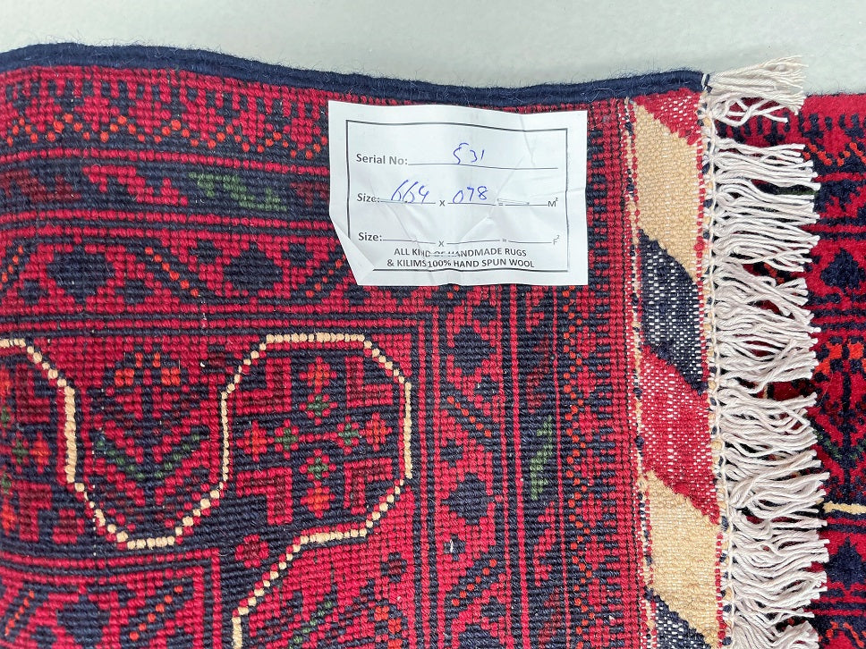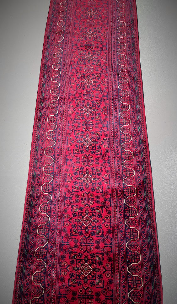 Fine Quality Oversize Hand Knotted Tribal Afghan Beljick Hall Runner. Above All It Has A Pure Lamb’s Wool Pile On Wool Base. It Also Has A Burgundy/Burnt Terracotta Tone Dyed Using Traditional Methods. This Runner Would Look Fantastic On Wooden Floor Board.
