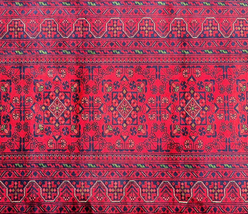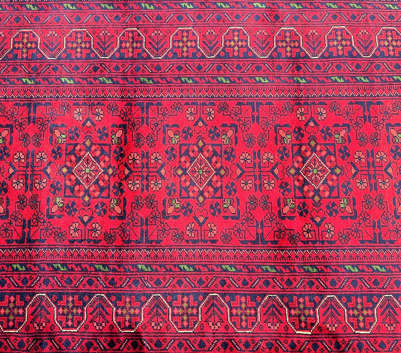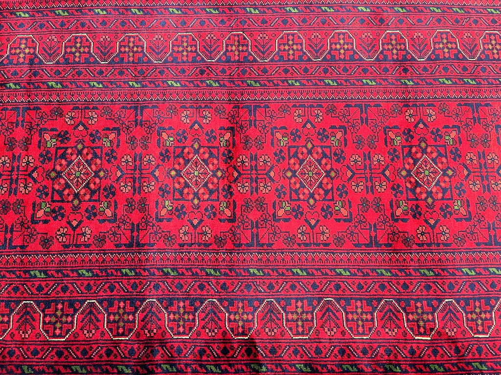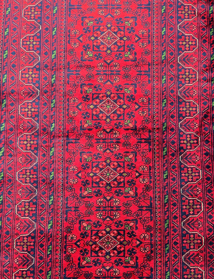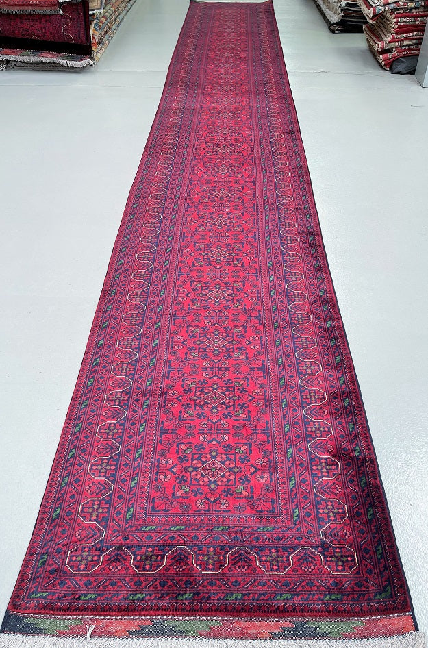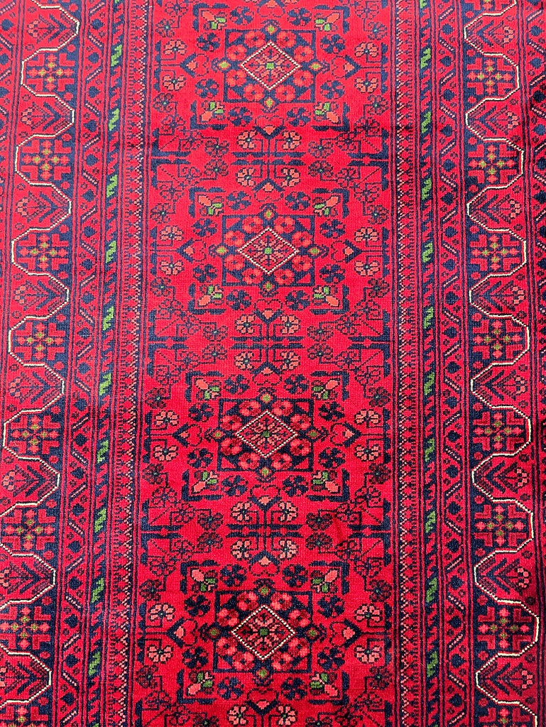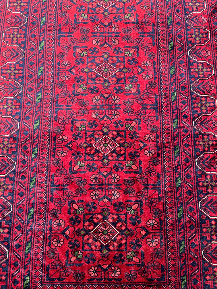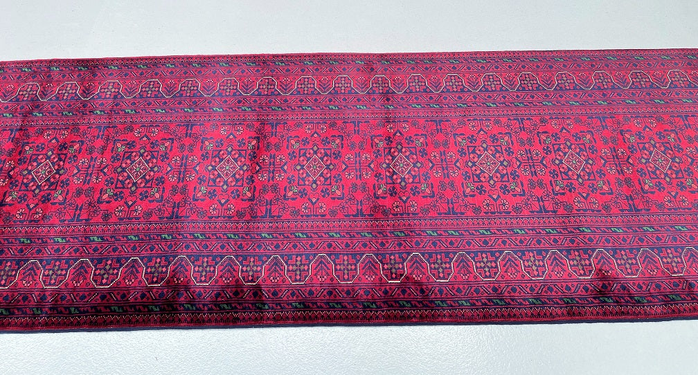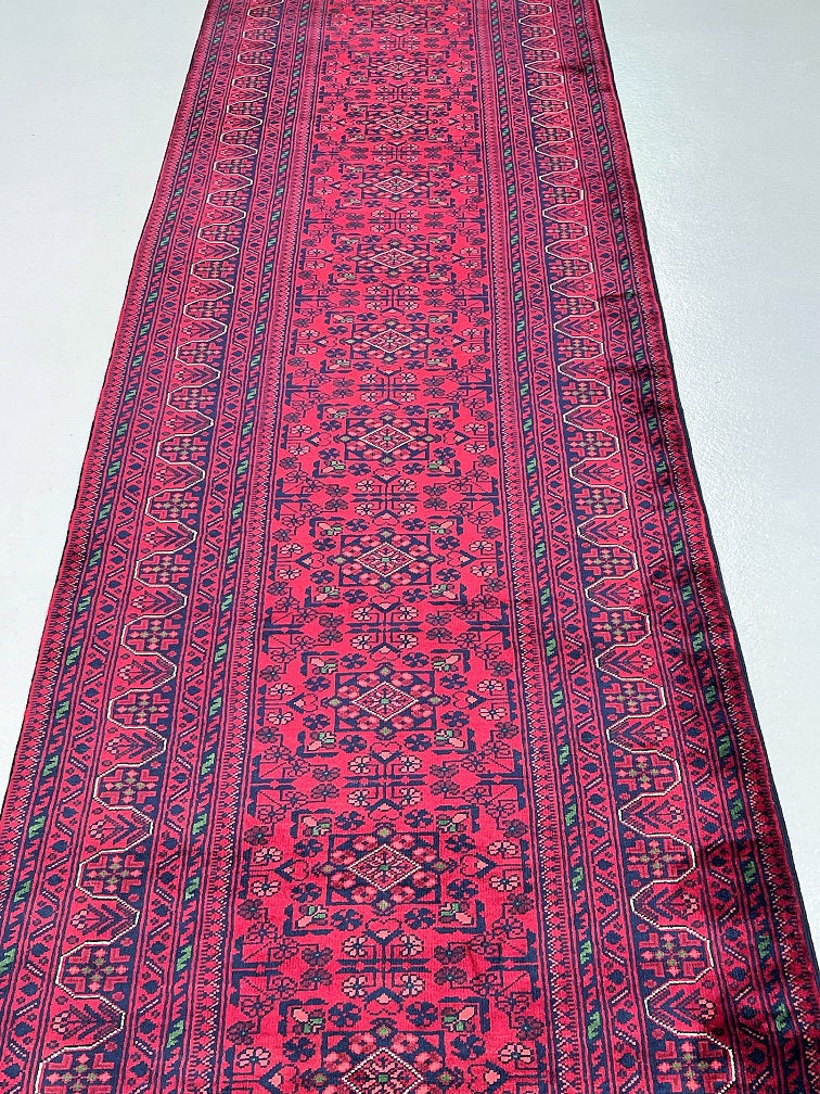 Superb Quality Hand Knotted Tribal Afghan Kunduz Hall Runner. Above All It Has A Pure Lamb’s Wool Pile On Cotton Base. It Also Has A Burgundy/Maroon Tone Dyed Using Traditional Methods. This Runner Would Look Fantastic On Wooden Floor Board.
