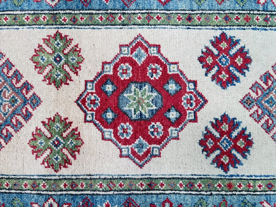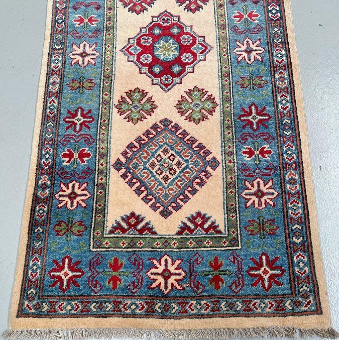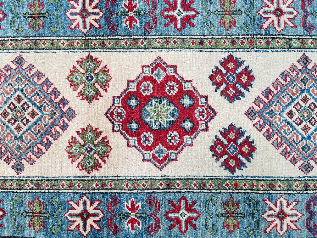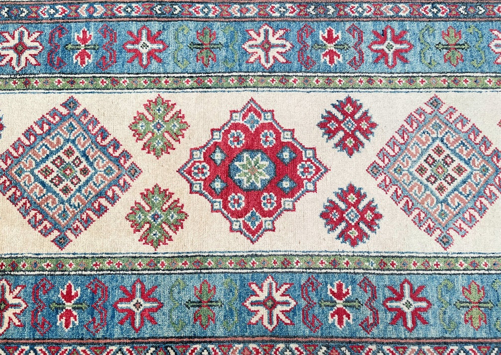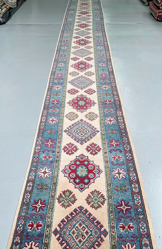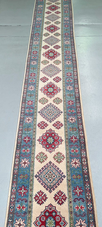 Superb Oversize Authentic Handmade Afghan Kazak Hall Runner. Above All It Has A Pure Hand Spun Wool Pile On Cotton Base. Beige, Blue, Green And Red Tone Dyed Using Traditional Methods (Vegetable Dyes). Last of True Woven Tribal Art.
