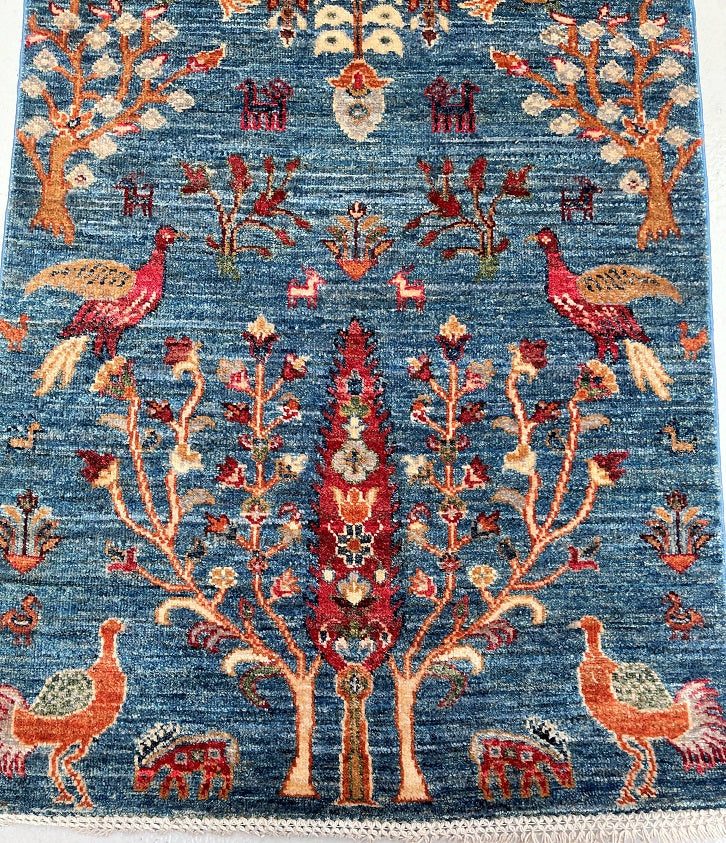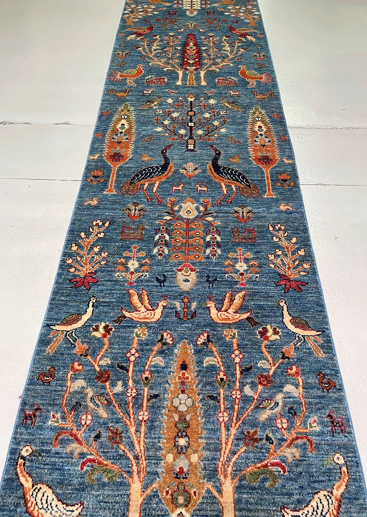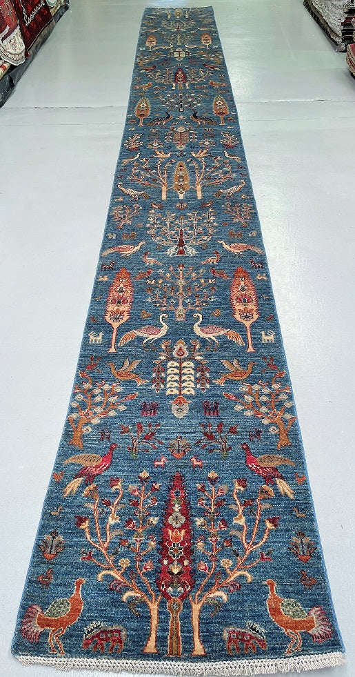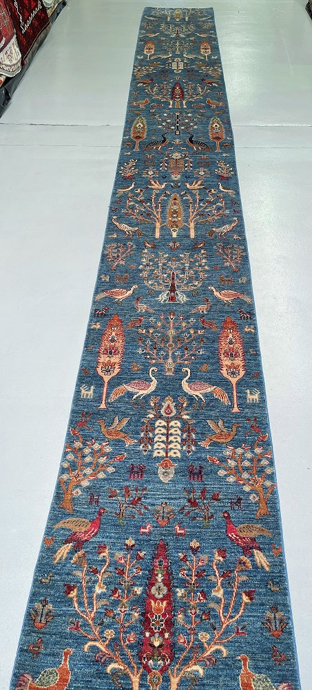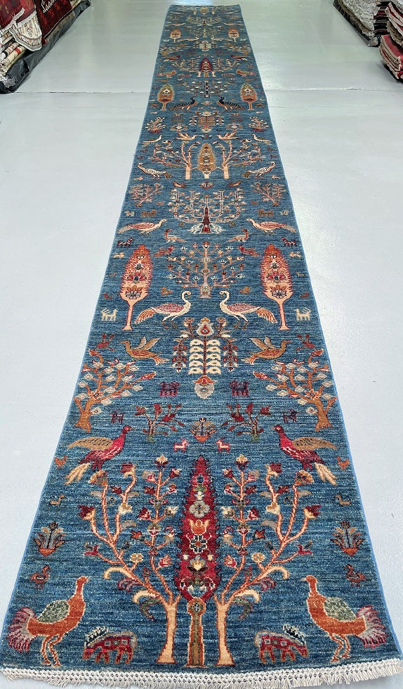 Extra Long Handmade Afghan Sultani Chobi Hall Runner. Above All It Has A Pure Wool Pile On Cotton Base. Blue, Beige, Brown, Orange And Red Tones Dyed Using Traditional Methods (Vegetable Dyes).