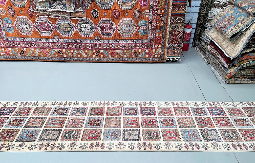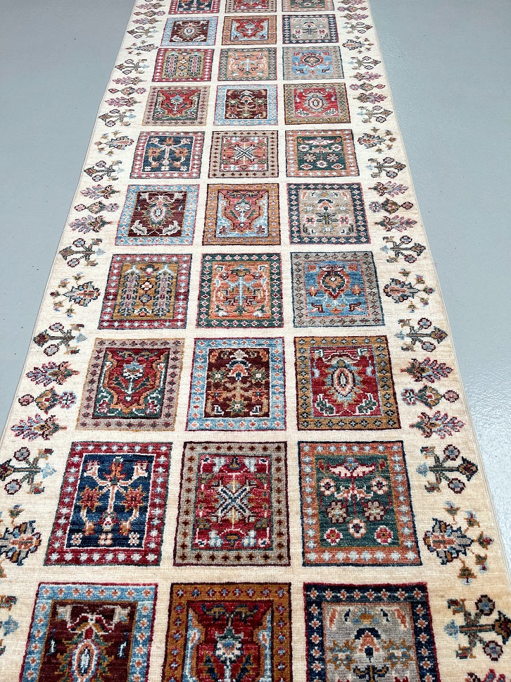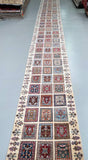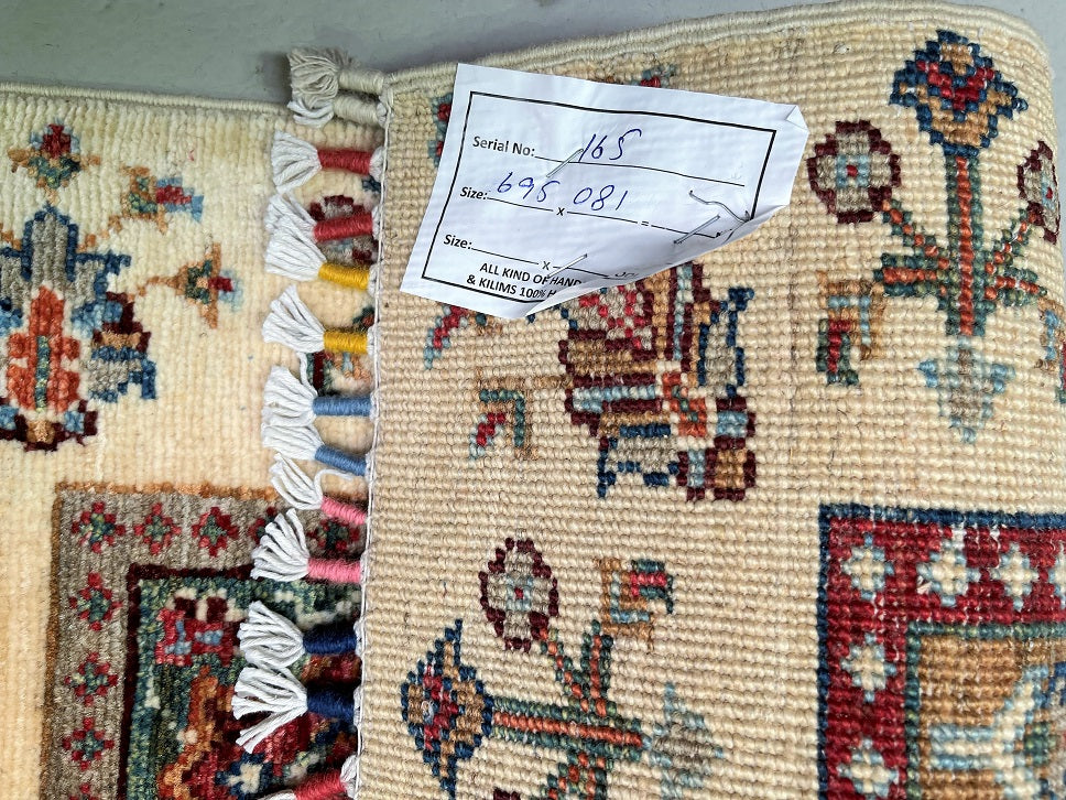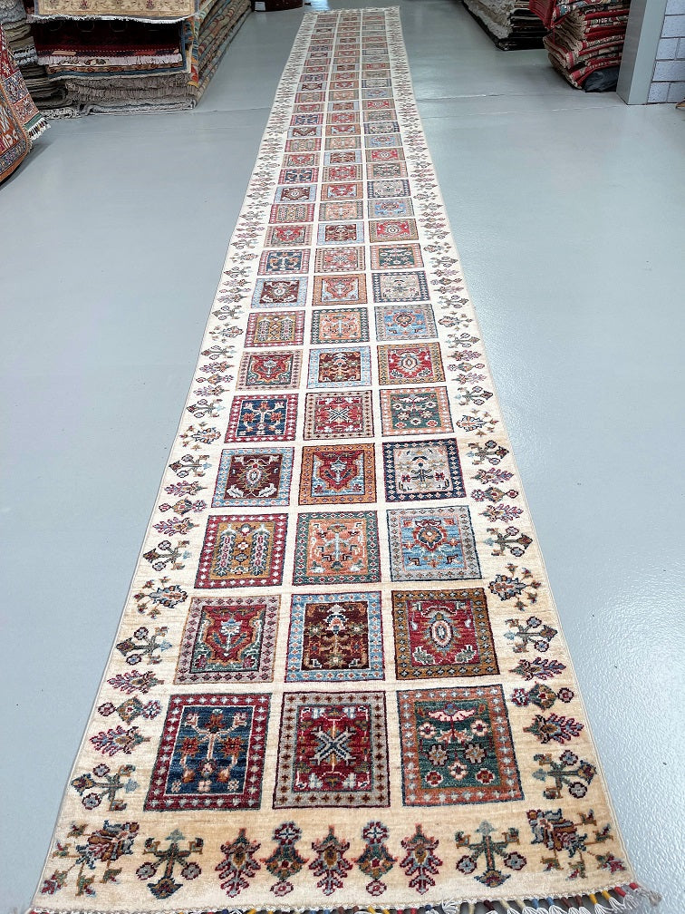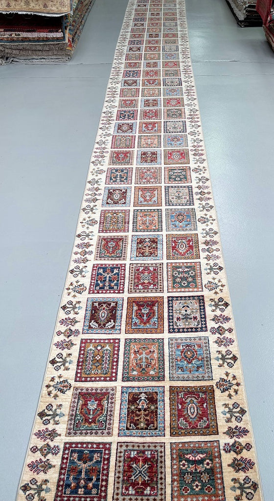 Extra Long Authentic Handmade Afghan Super Kazak Hall Runner. Above All We Do Have This Runner In A Matching Pair. It Also Has A Pure Hand Spun Wool Pile On Cotton Base. Beige Background Dyed Using Traditional Methods (Vegetable Dyes). Last Of True Woven Tribal Art.