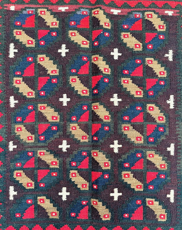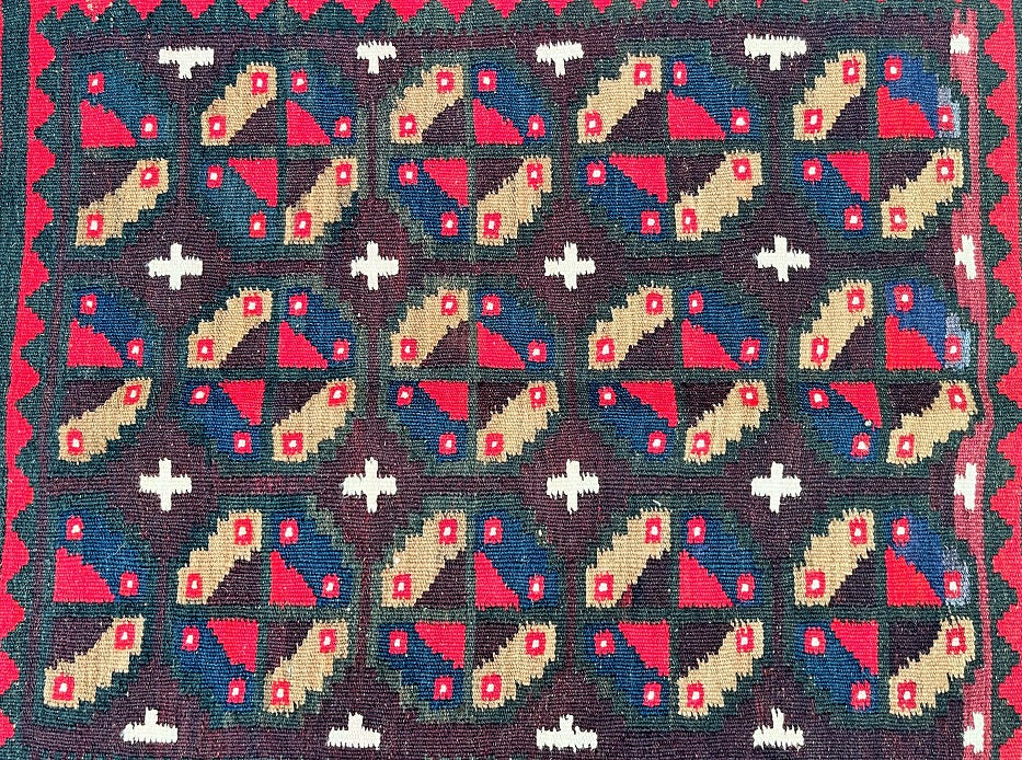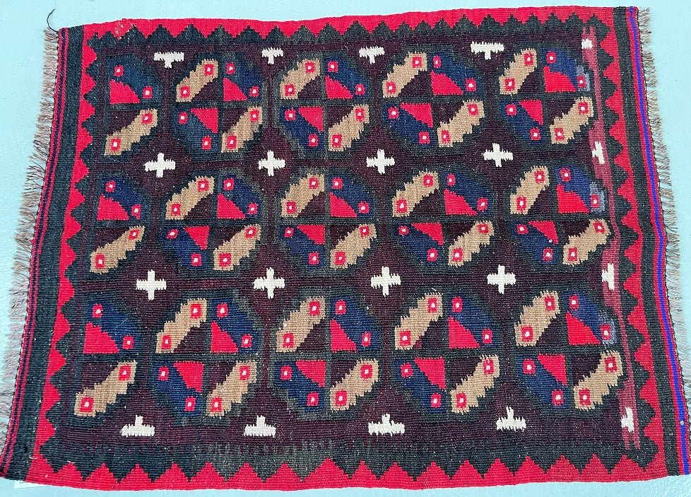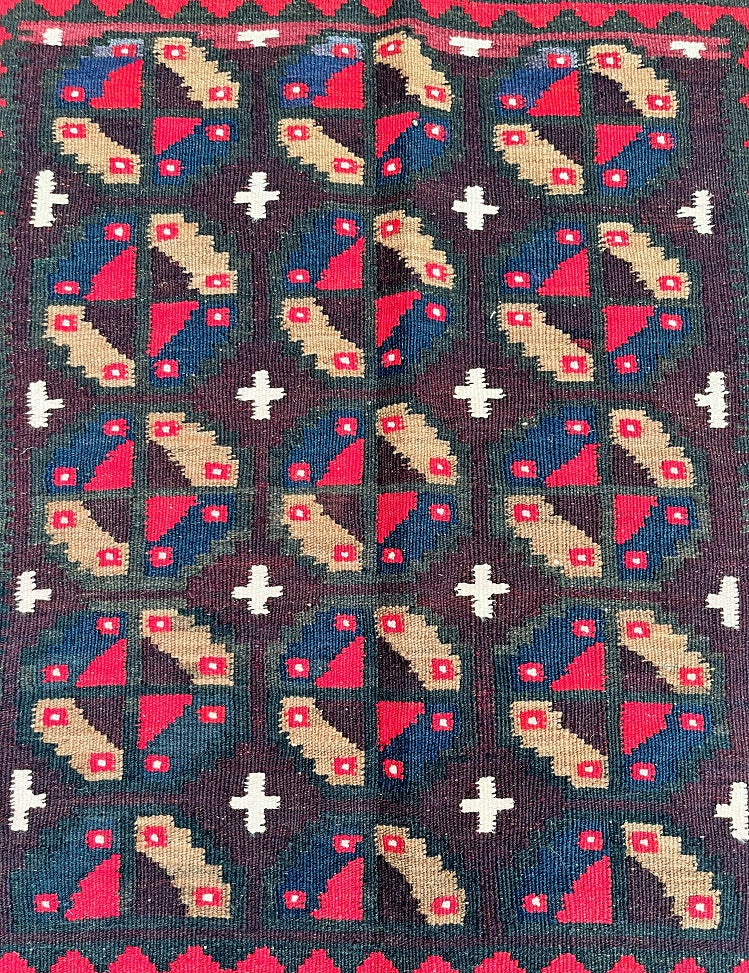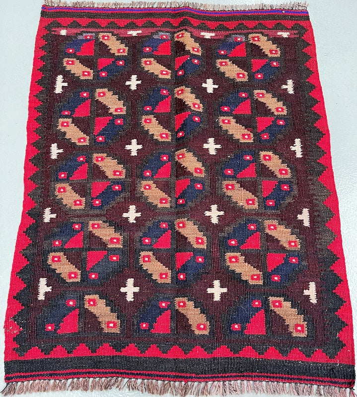 Nomadic Hand Woven Afghan Maymaneh Kilim Rug. Above All It Is A Versatile Size Which Also Could Be Used As a Runner. It Also Has A Pure Hand Spun Wool Pile On Wool Base. Red, Blue, Brown And Black Tone Dyed Using Traditional Methods.