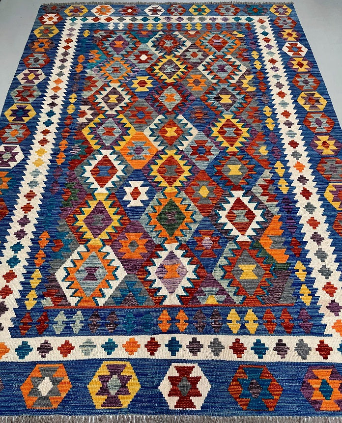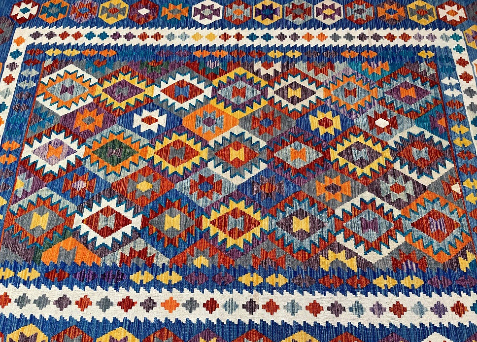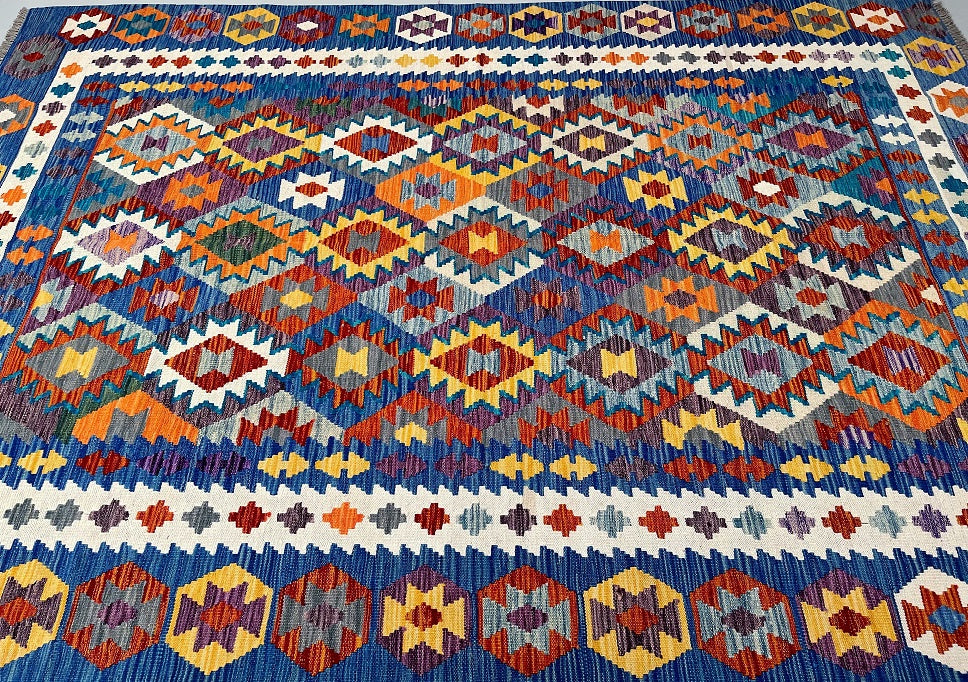Decorative Full Room Size Hand Woven Afghan Ariana Kilim Rug. Above All It Has A Pure Hand Spun Wool Pile On Wool Base. Multi-Color With Blue Background Dyed Using Vegetable Roots.