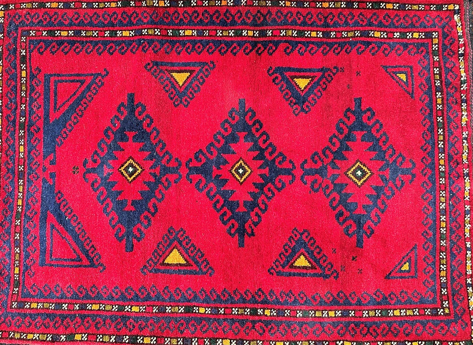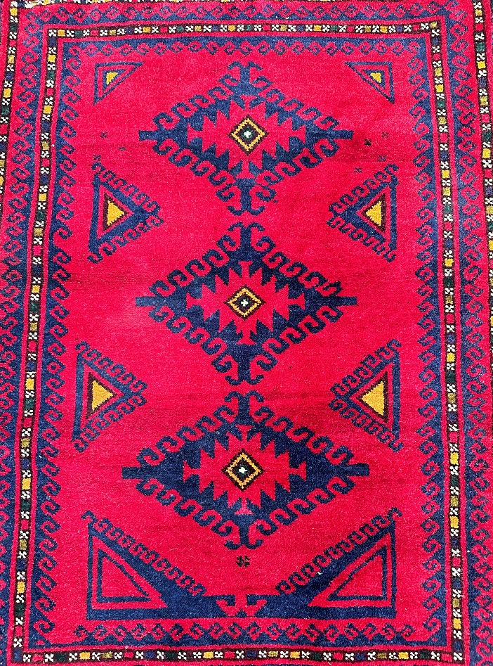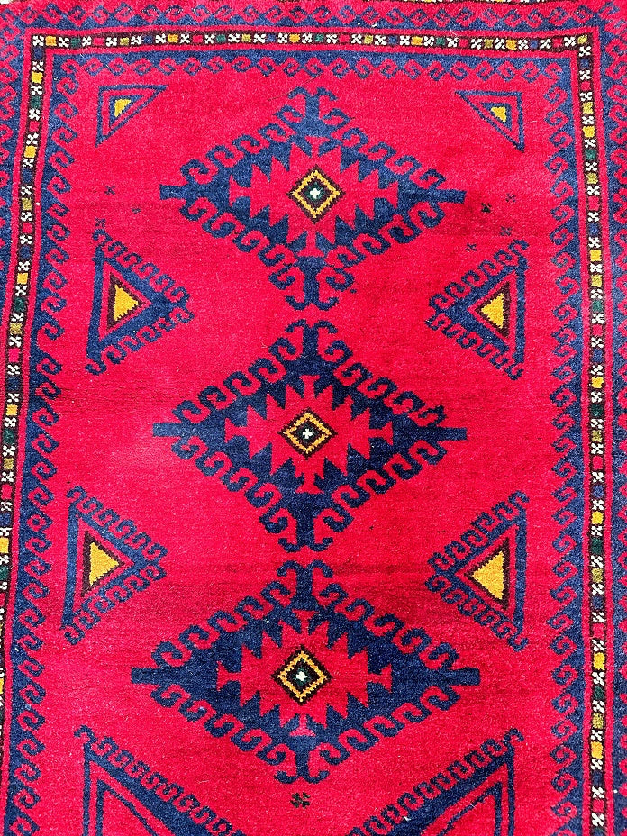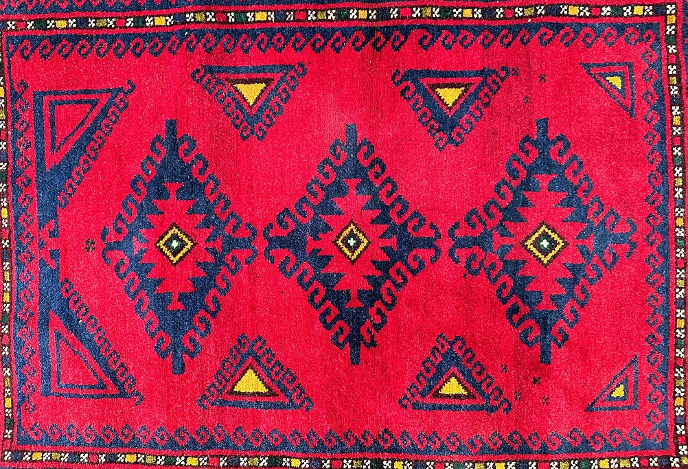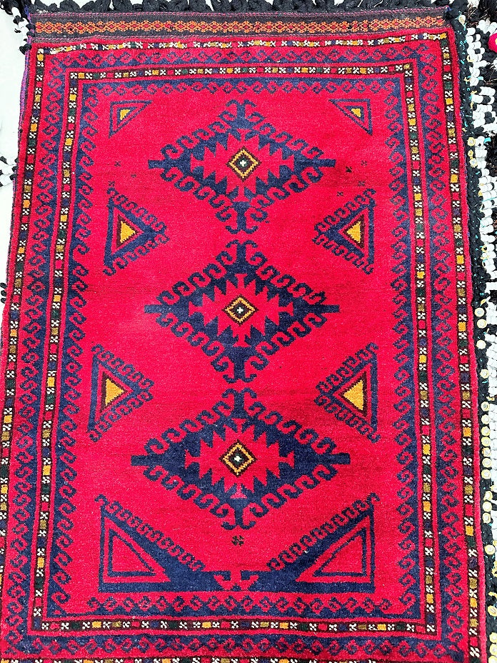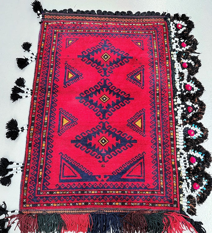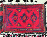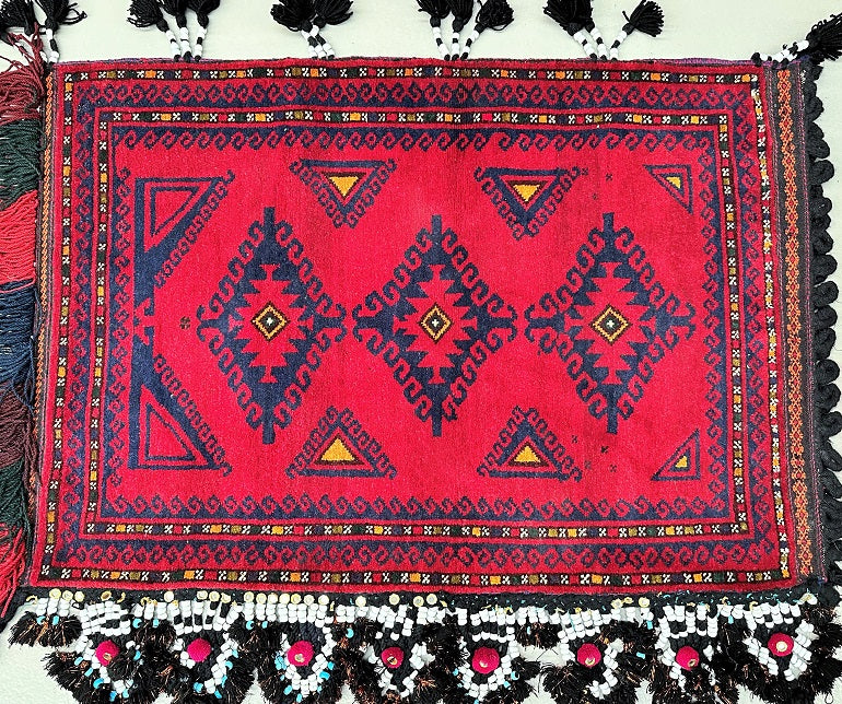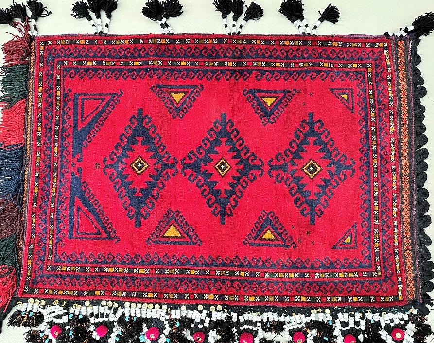 Authentic Handmade Afghan Mishwani Balouchi Saddle Rug/Pillow Case. Above All It Has The Kilim Backing And Could Be Filled And Used As A Large Cushion, Pillow Or As A Floor Rug. It Also Has A Pure Hand Spun Wool Pile On Wool Base. Red, Black, Indigo Blue And Orange Tones Dyed Using Traditional Methods.