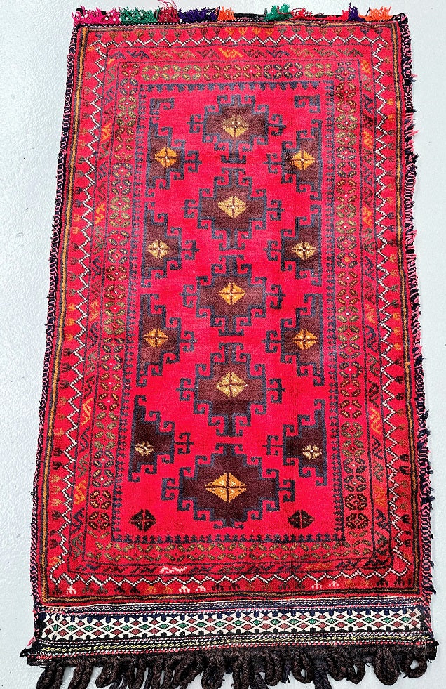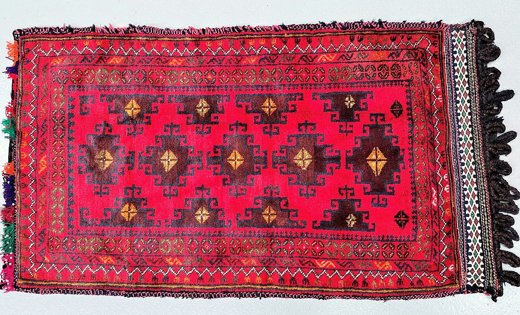 Large Authentic Handmade Afghan Mishwani Balouchi Saddle Rug/Pillow Case. Above All It Has The Kilim Backing And Could Be Filled And Used As A Large Cushion, Pillow Or As A Floor Rug. It Also Has A Pure Hand Spun Wool Pile On Wool Base. Red, Black, Indigo Blue, Beige, Yellow And Chocolate Brown Tone Dyed Using Traditional Methods.