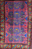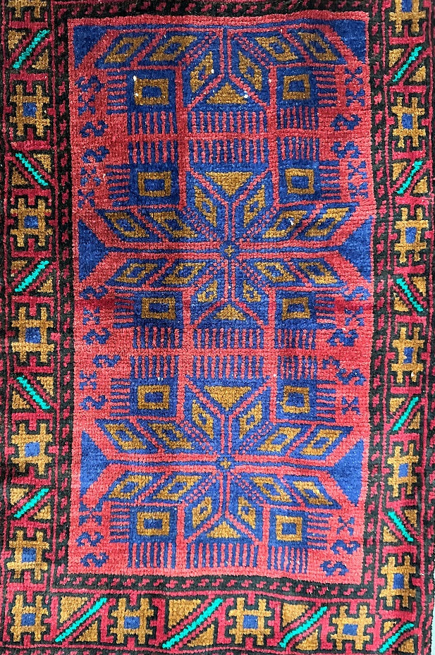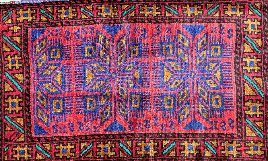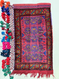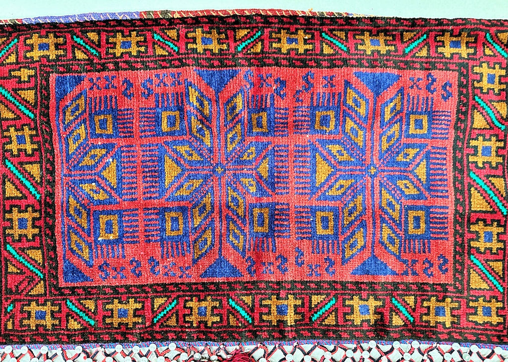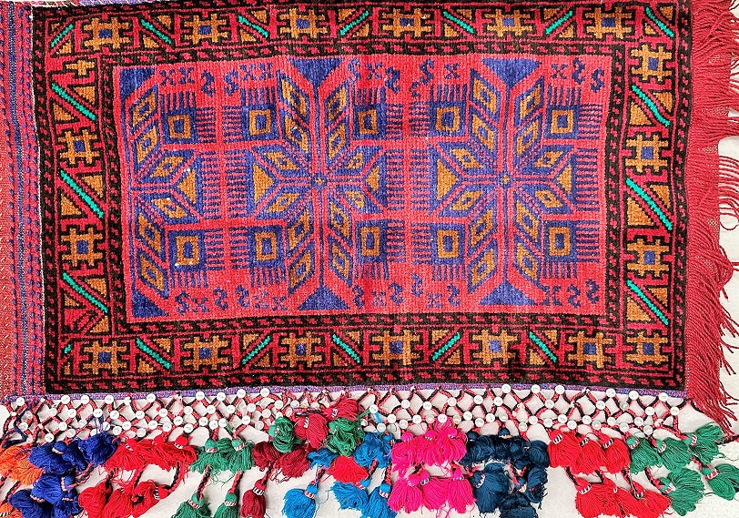 Authentic and versatile handmade Afghan Balouchi piece. This remarkable item serves as both a rug and a pillow case, offering functionality and beauty in one. With a kilim backing, it can be filled and used as a large cushion, pillow, or even placed on the floor as a rug. Crafted with a pure hand-spun wool pile on a wool base, it ensures both comfort and durability. The vibrant oxidized red, orange, blue and black tones are achieved through traditional dyeing methods, enhancing the geometric tribal design with a touch of character. It is worth noting that this piece required the dedicated weaving skills of an artisan for approximately 2 weeks. Hand-woven in Afghanistan, this rug/pillow case measures 85 x 48 cm and holds a gallery replacement value of $599, reflecting its quality and artistic value.