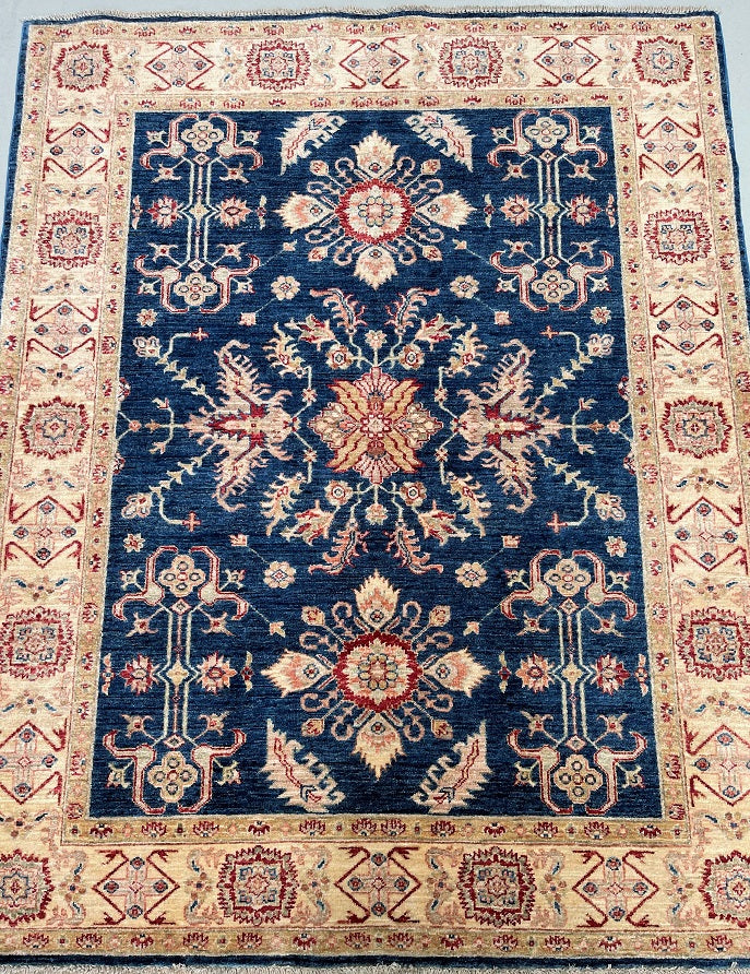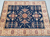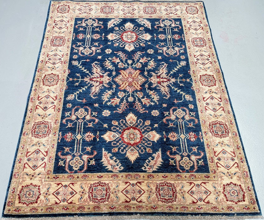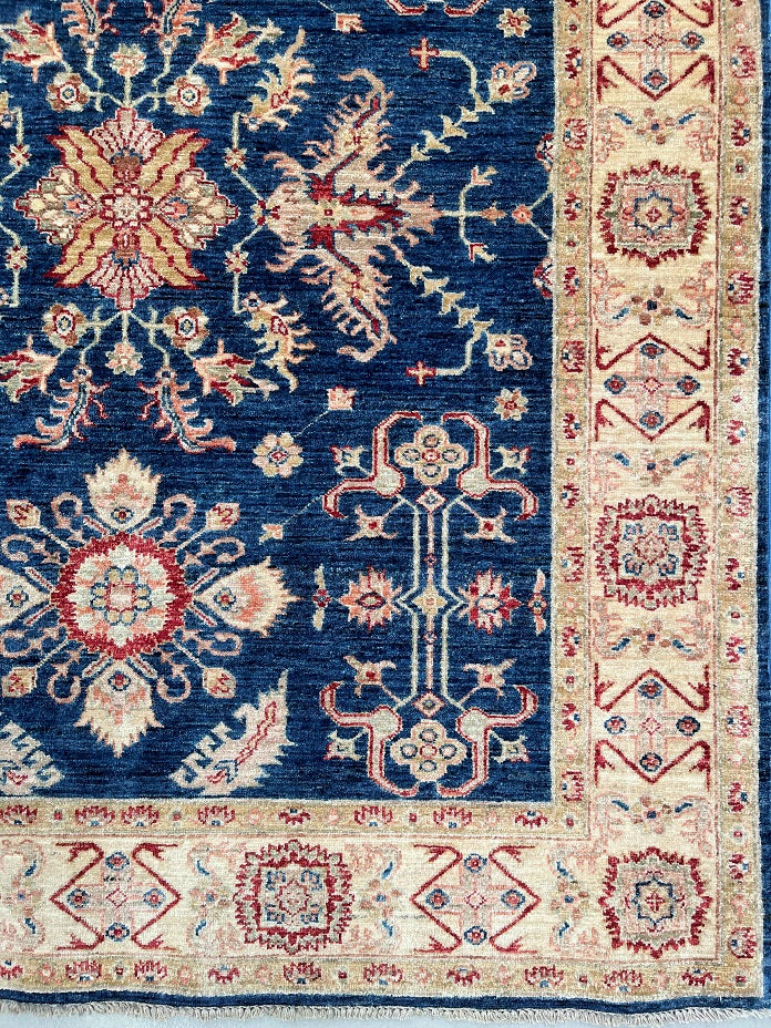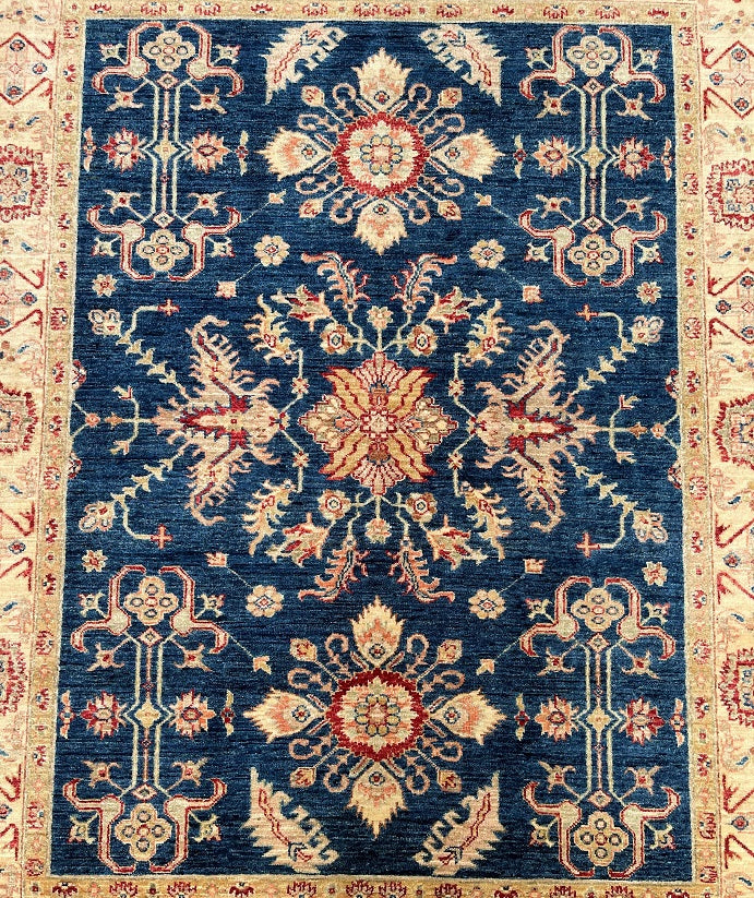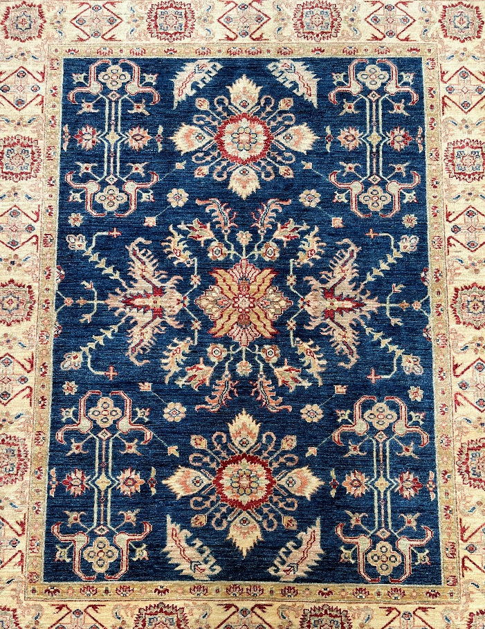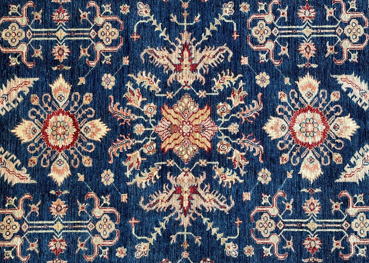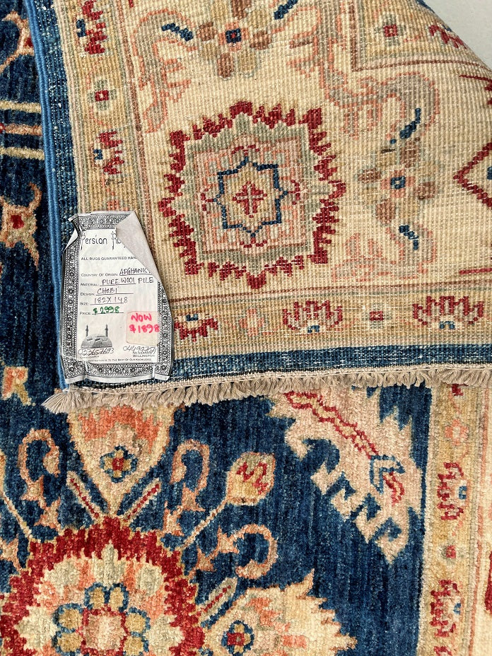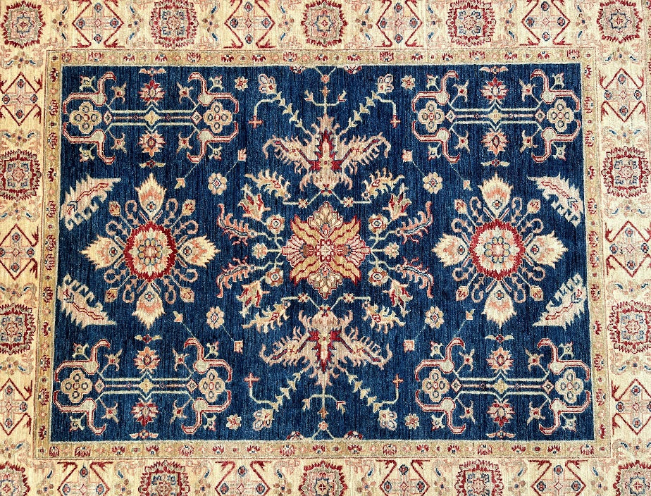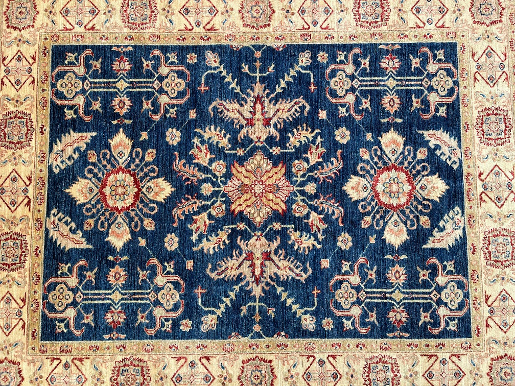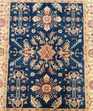 Coffee Table Size Authentic Hand Knotted Chobi Rug. Above All It Is Pure Hand Spun Wool Pile On Cotton Base. Navy Blue Beige, Gold, Orange And Red Tones Dyed Using Traditional Methods (Vegetable Dyes). Last of True Woven Nomadic Art.