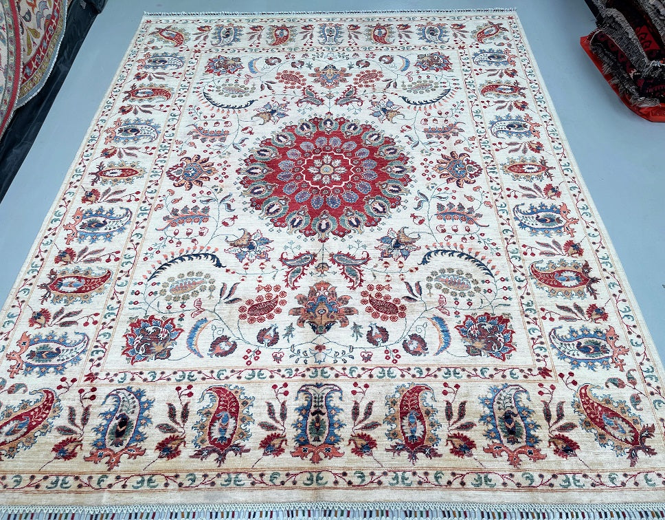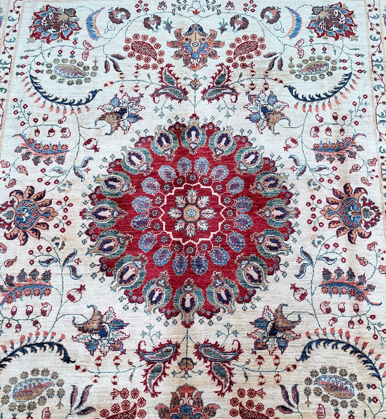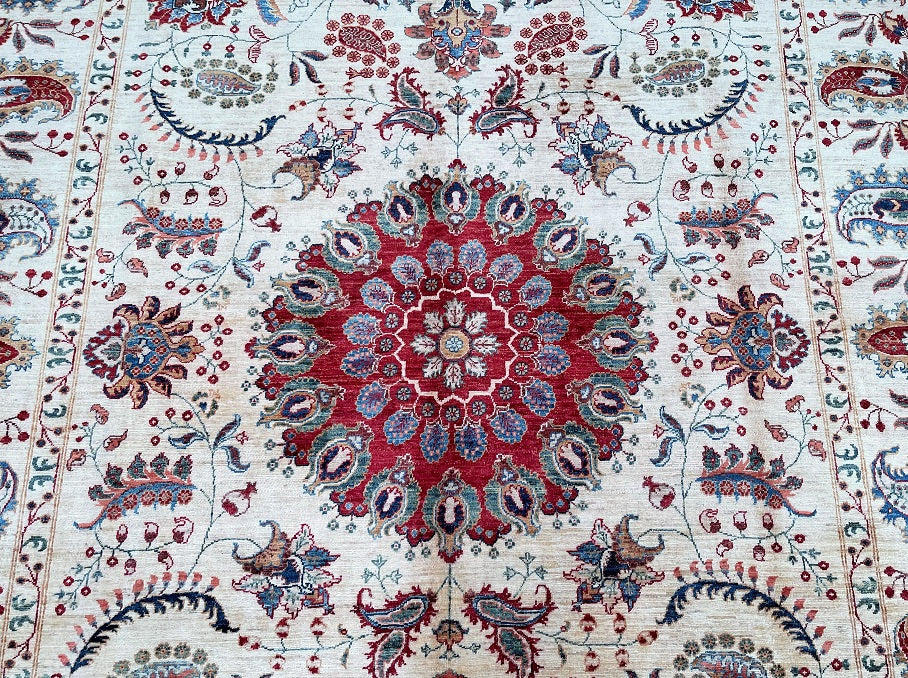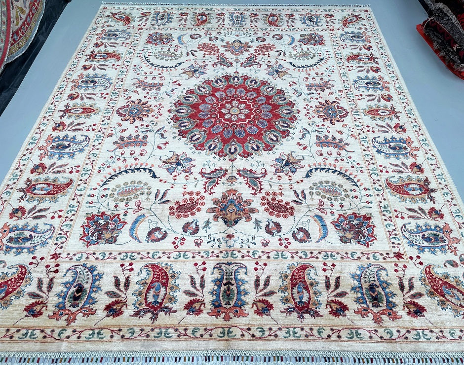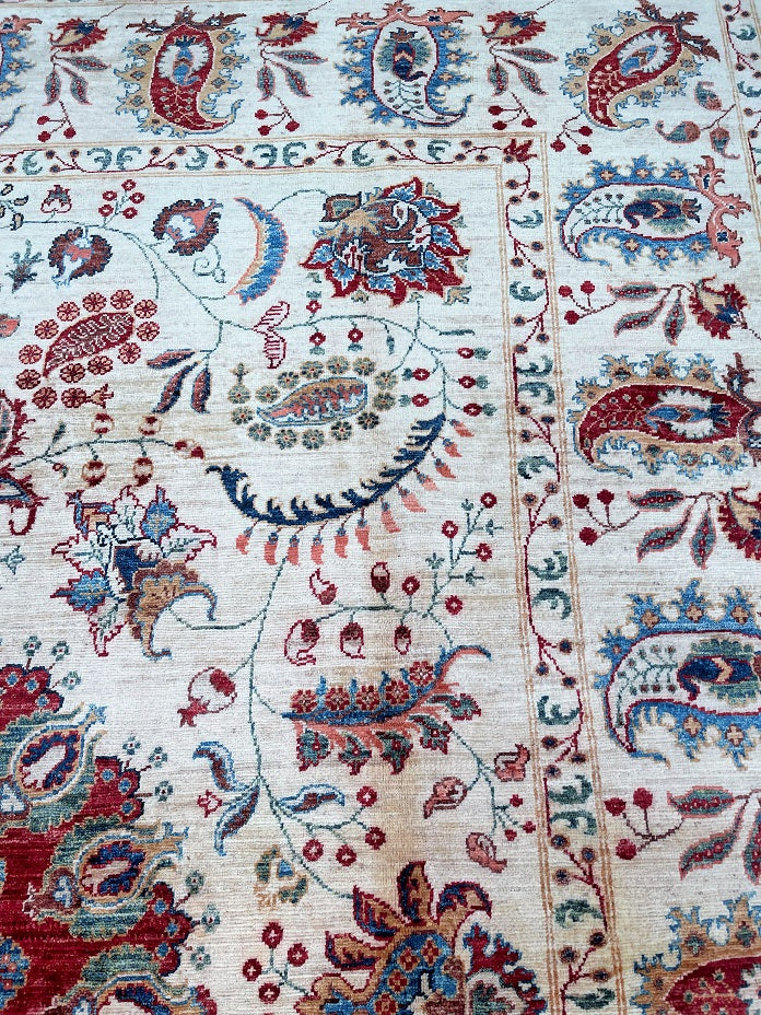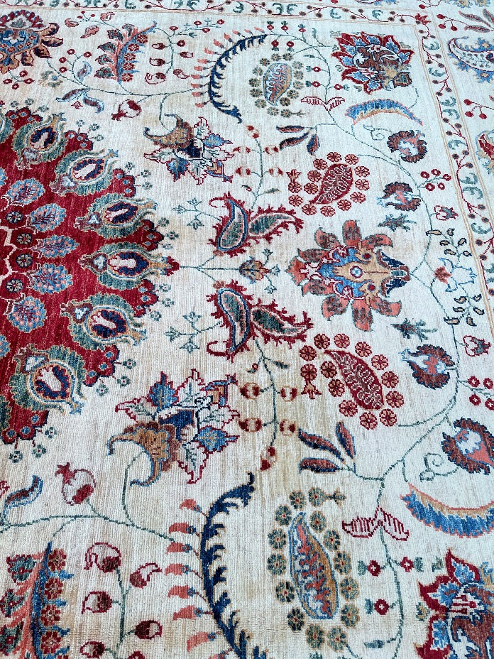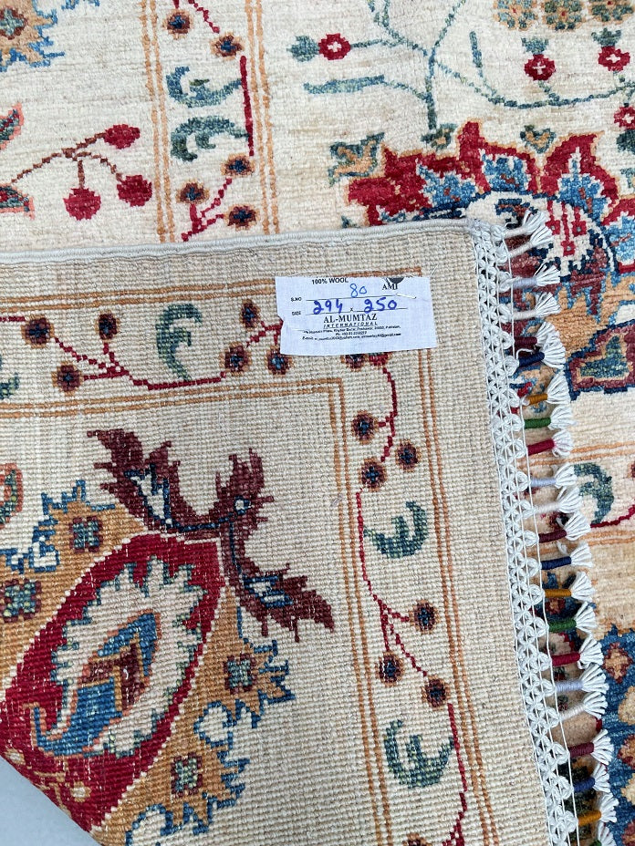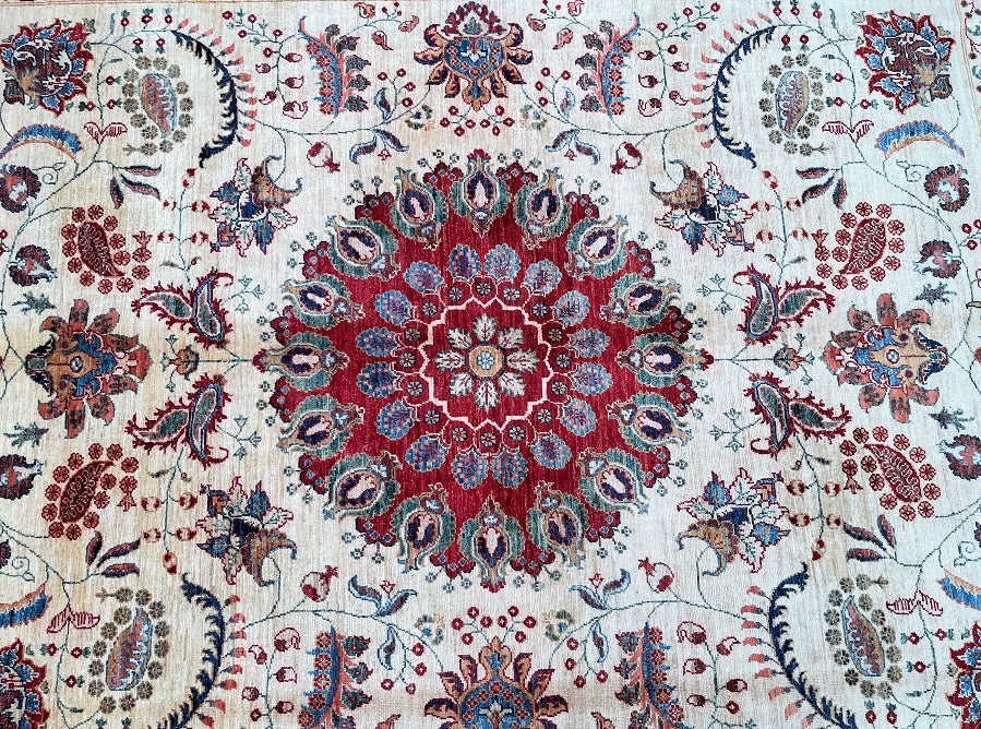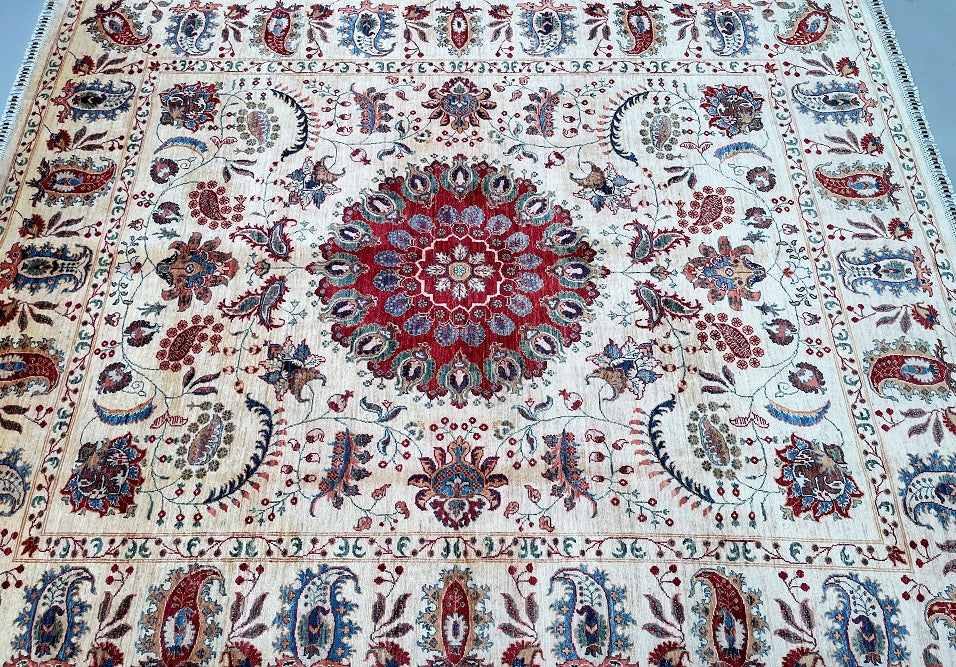 Almost Square Room Size Ziegler Design Hand Knotted Afghan Chobi Rug. Above All It Has A Pure Hand Spun Wool Pile On Cotton Base. Beige/Gold, Maroon, Green And Blue Tone Dyed Using Traditional Methods (Vegetable Dyes). Last of True Woven Nomadic Art.