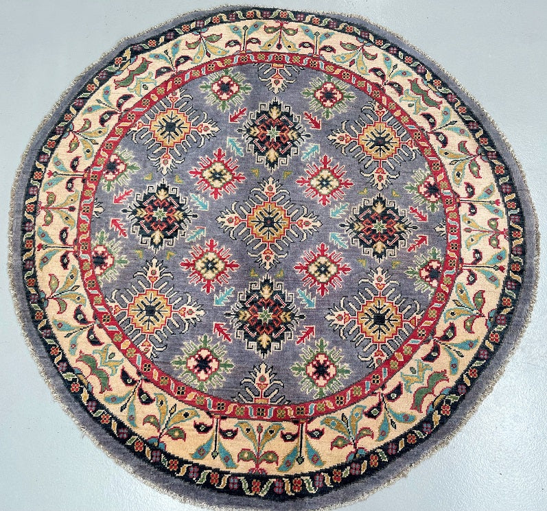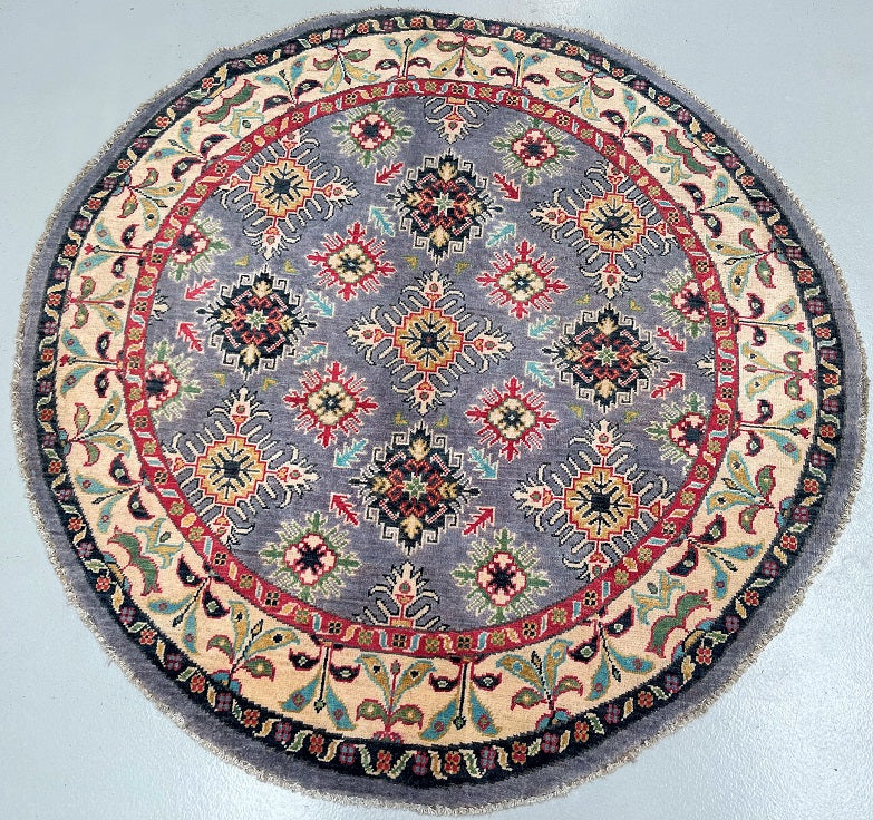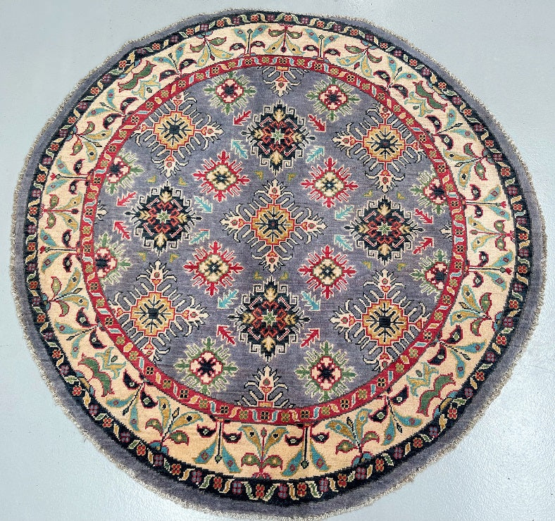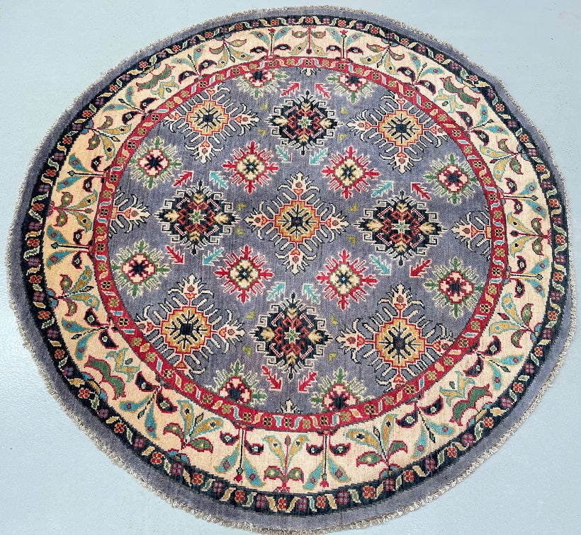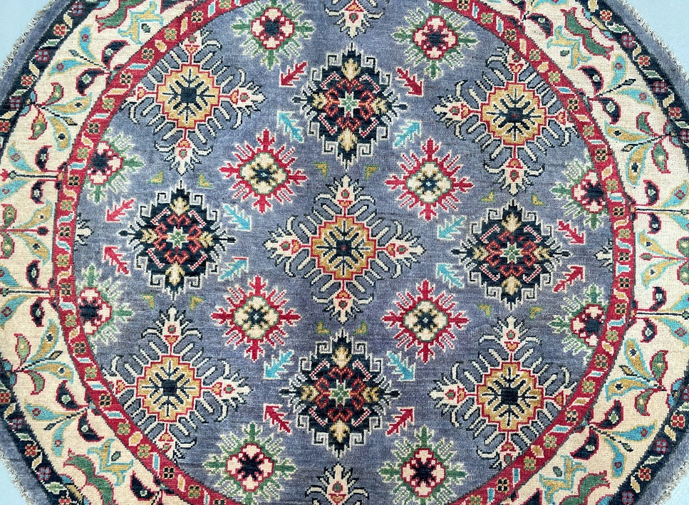 Coffee table Size Authentic Hand Knotted Afghan Kazak Round Rug. It features a pure wool pile on a cotton base, ensuring its durability and quality. The vibrant colors of grey blue, beige, red, orange, turquoise and gold are achieved through traditional methods using vegetable dyes, adding an authentic touch to the rug. The semi geometric, semi floral design, renowned as the Caucasian pattern, further enhances its beauty. It is worth noting that it took a skilled weaver approximately 4 months to complete this intricate piece. Hand-woven in Afghanistan, this rug measures 147 x 147 cm and holds a gallery replacement value of $2899.