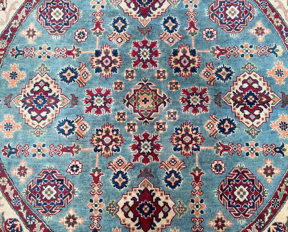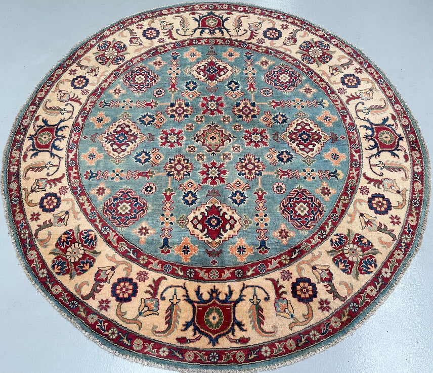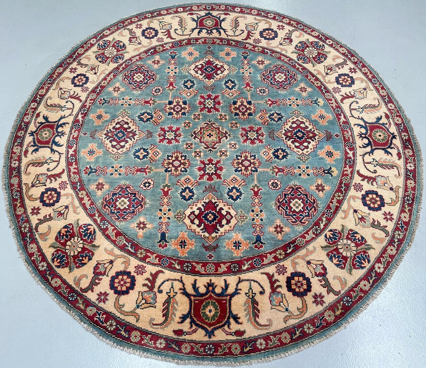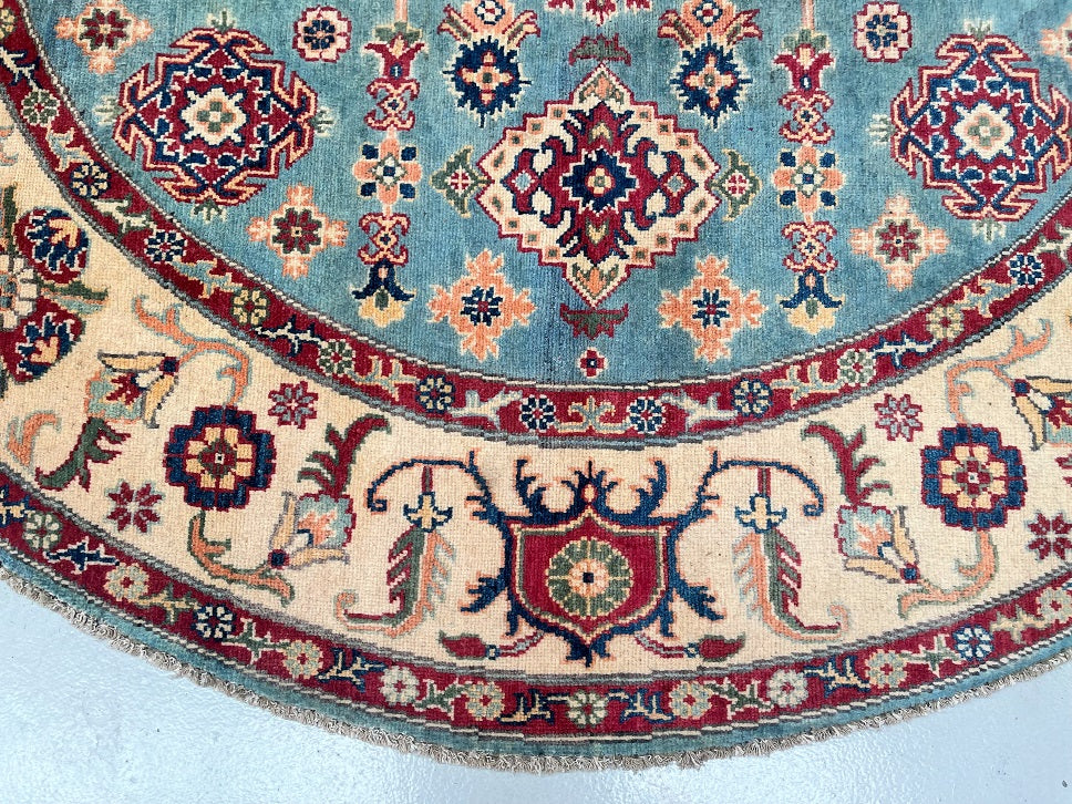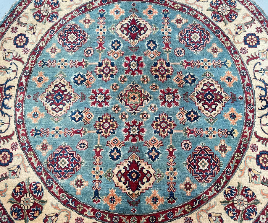 Free Shipping Australia Wide Offered! Certified Handmade Afghan Round Rug 200x200cm Rare Room Size Authentic Hand Knotted Afghan Kazak Round Rug. Above All It Is Hard To Weave Circular carpets. Pure Wool Pile On Cotton Base. Powder Blue, Cream, Re...
