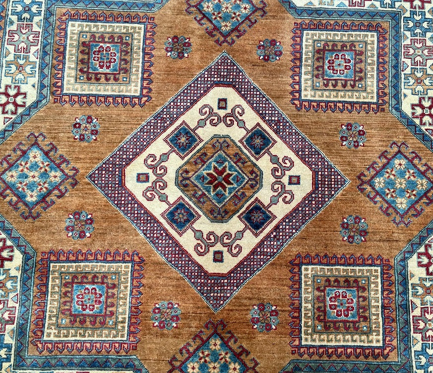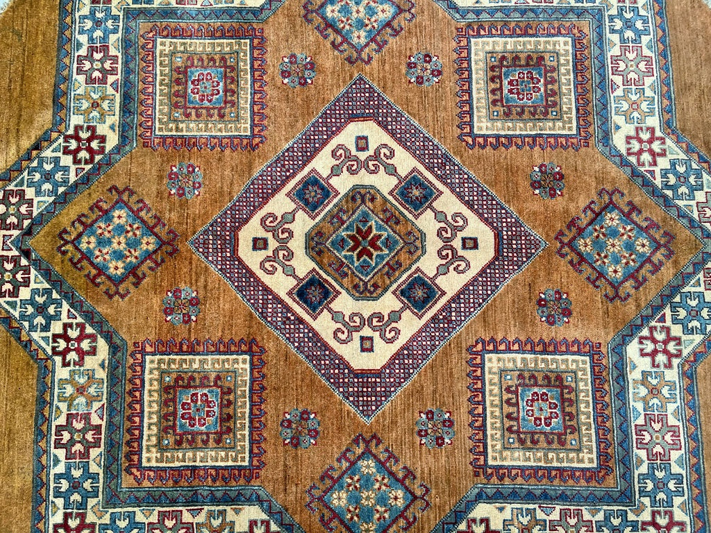 The rug features a warm camel-gold field framed by a bold ivory and sky-blue geometric border. At its center is a striking diamond medallion surrounded by traditional Kazak motifs, stepped lozenges, and tribal rosettes. The colour palette combines rich camel, ivory, sky blue, denim blue, deep navy, burgundy red, and soft terracotta accents, creating a vibrant yet balanced tribal design that stands out beautifully in both classic and contemporary interiors.