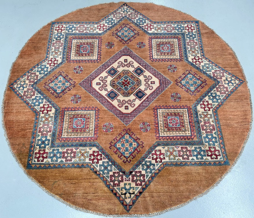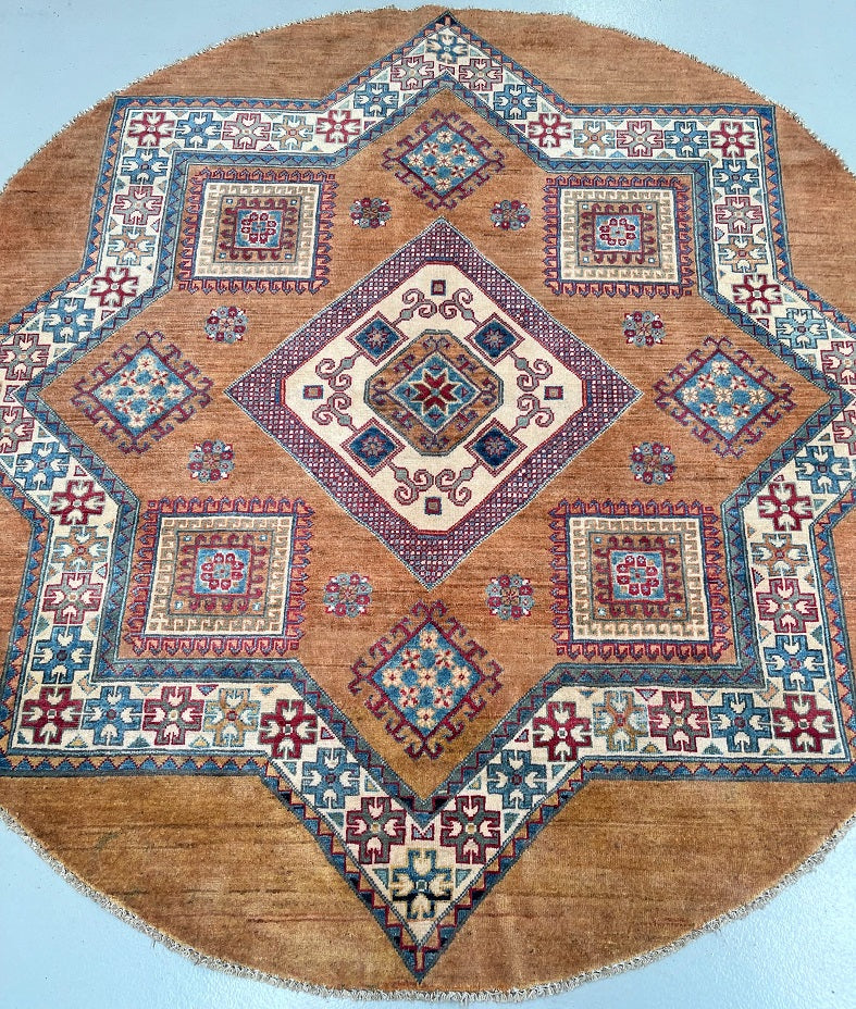 Rare and authentic hand knotted Afghan Kazak round rug, beautifully hand knotted in Afghanistan using pure wool. This impressive room-size piece would have taken a skilled weavers approximately 4–6 months to complete.