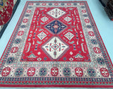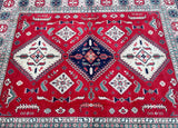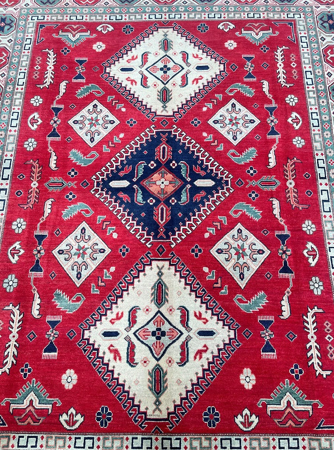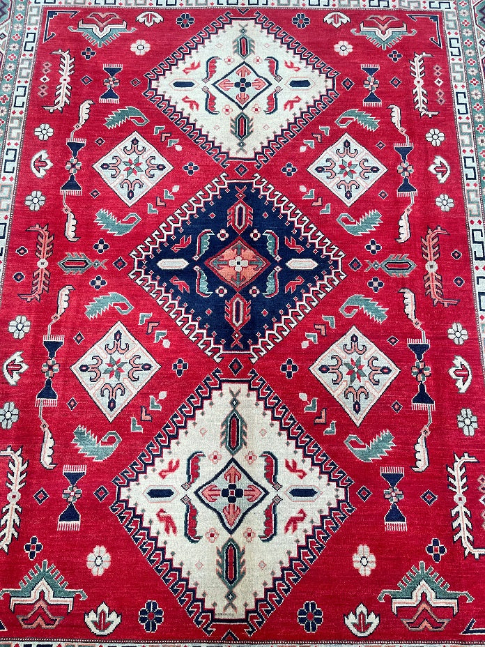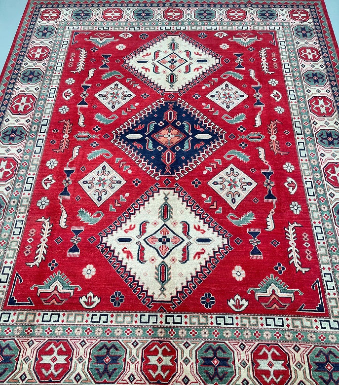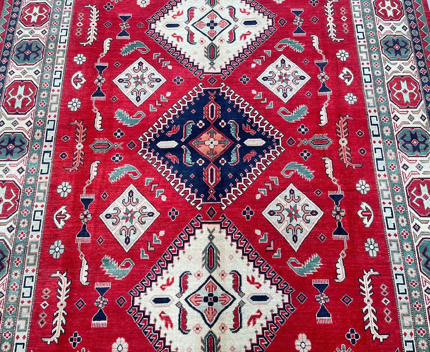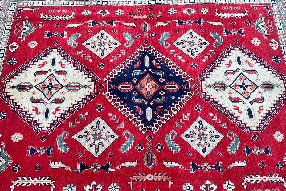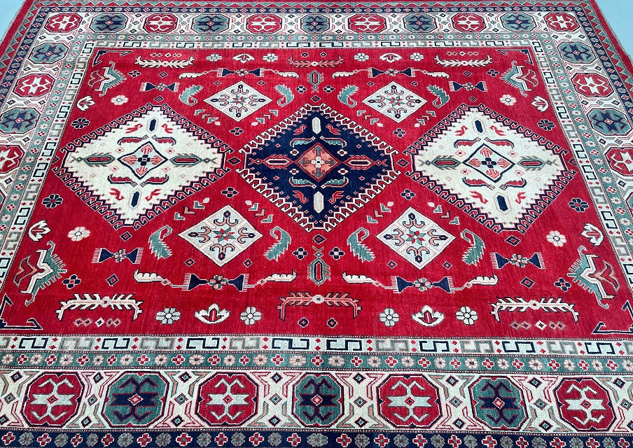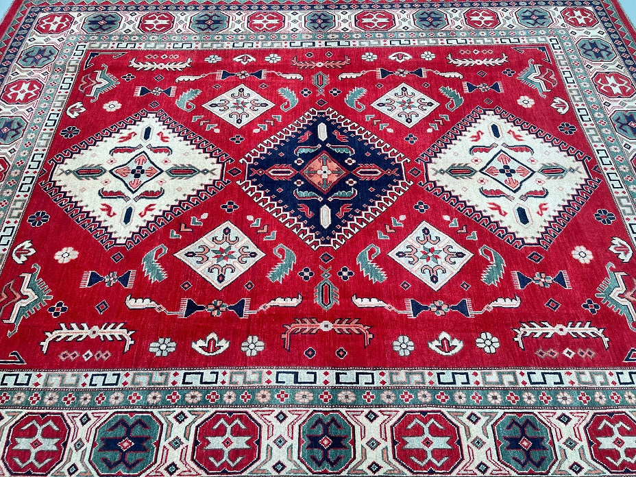 Large Room Size Authentic Hand Knotted Afghan Kazak rug. Above All It Is Pure Hand Spun Wool Pile On Cotton Base. Red, Beige,, Blue, Black And Green Tone Dyed Using Traditional Methods (Vegetable Dyes). Last Of True Woven Tribal Art.