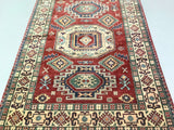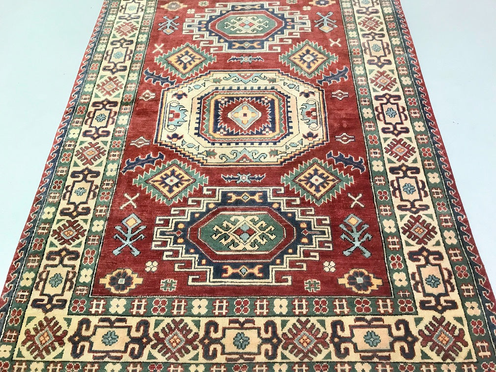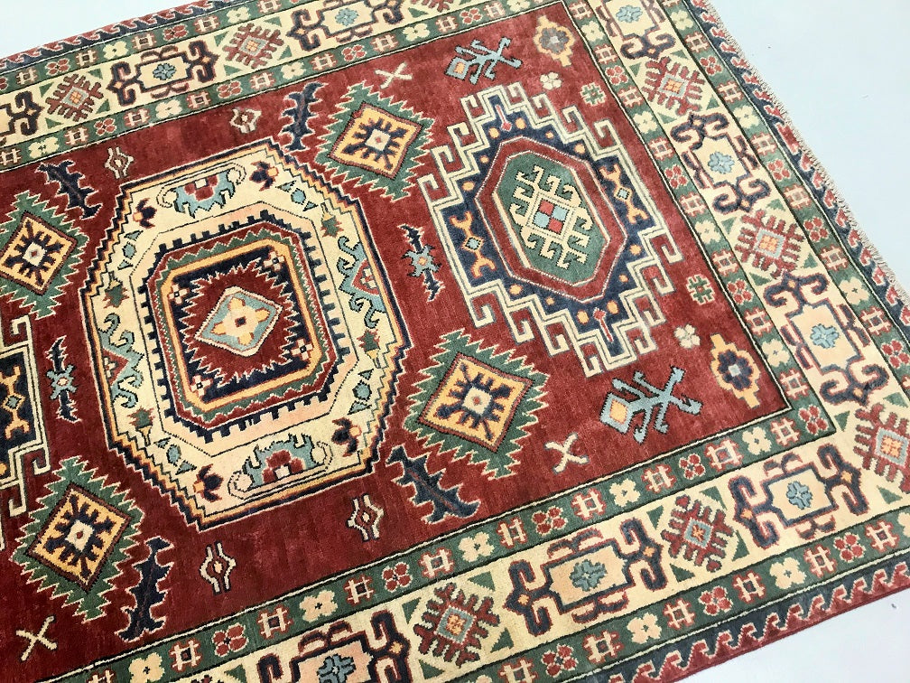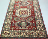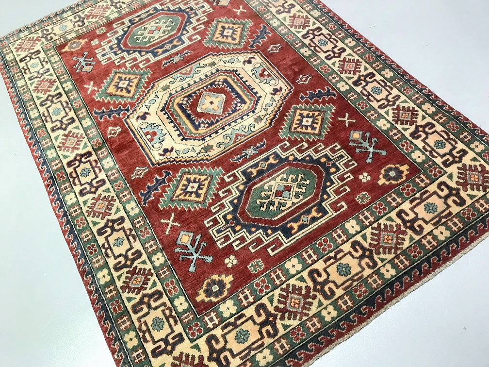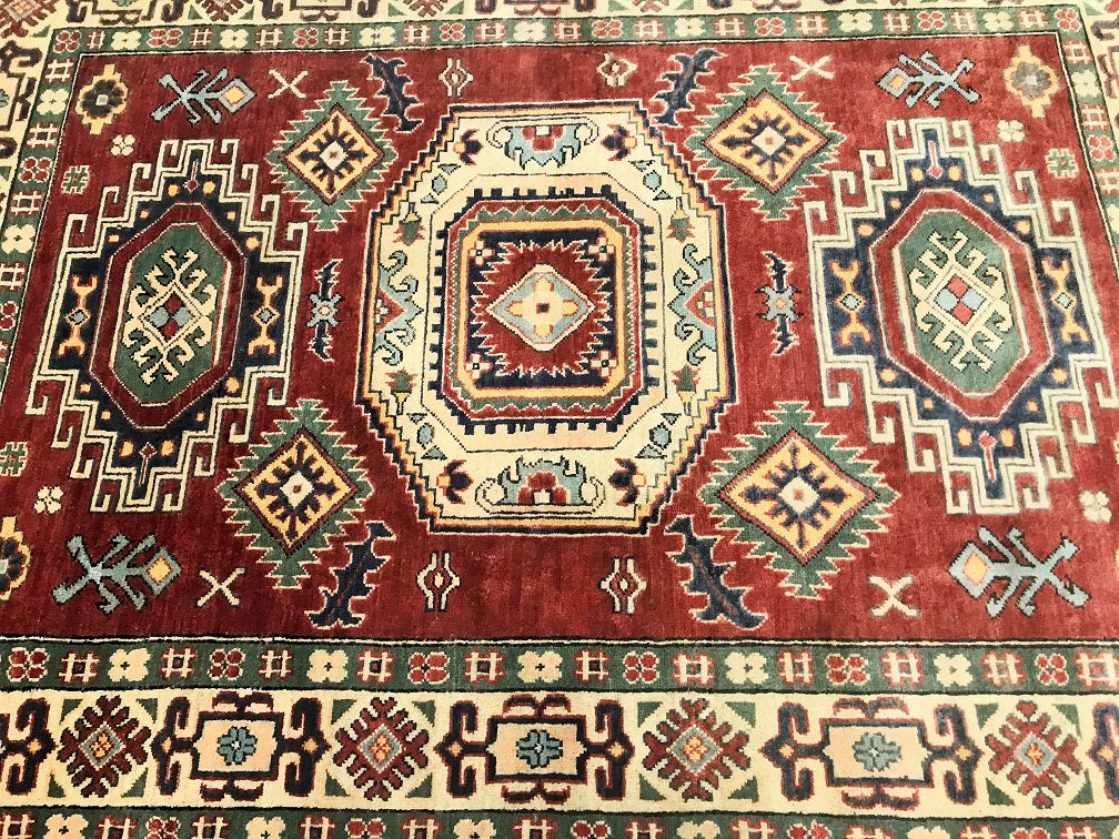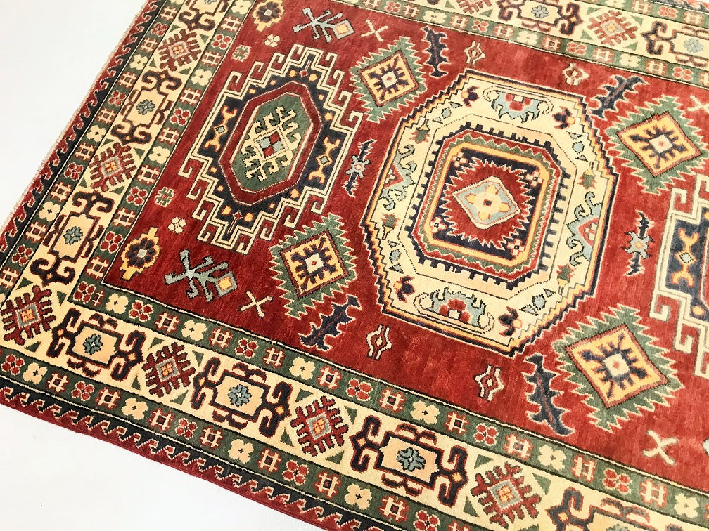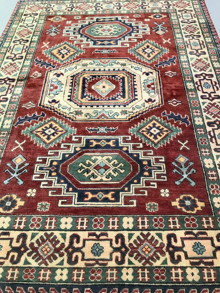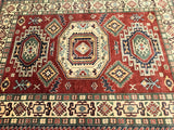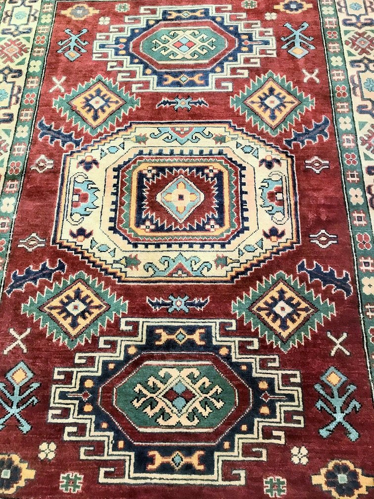 Coffee Table To Room Size Hand Knotted Afghan Kazak Rug. Above All It Is Pure Hand Spun Wool Pile On Cotton Base. Rustic Red, Beige, Blue and Green Tone Dyed Using Traditional Methods (Vegetable Dyes). Last Of True Woven Tribal Art.