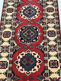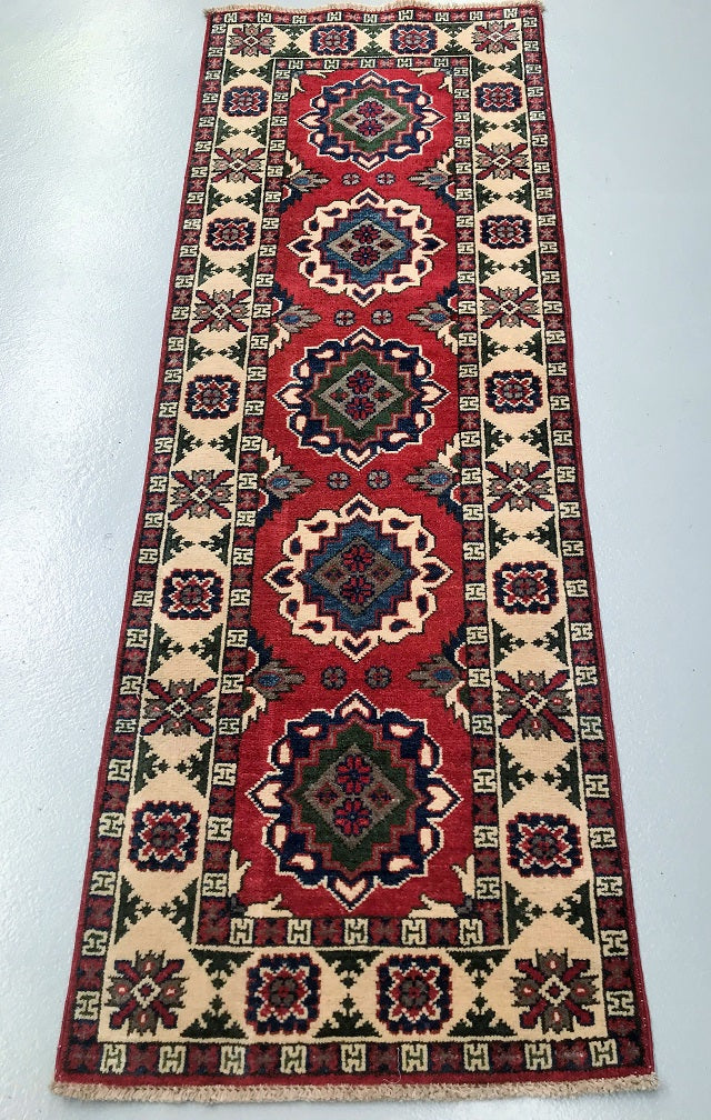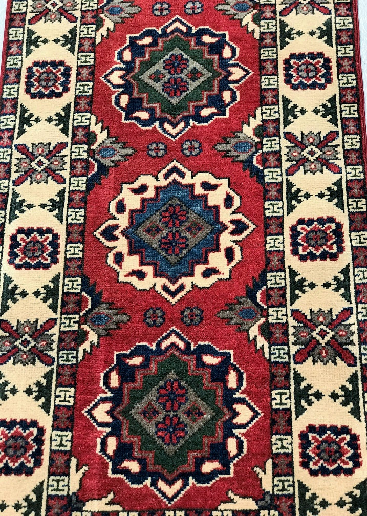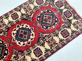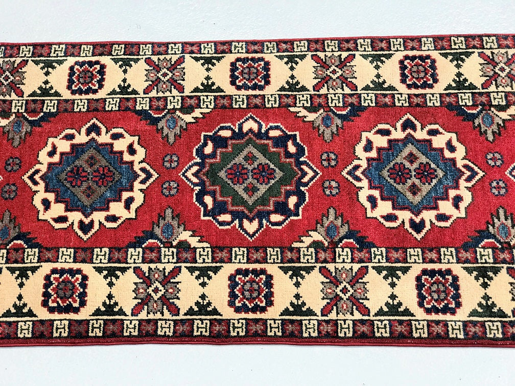 Handmade Afghan Kazak Short Runner. Above All It Has a Pure Hand Spun Wool Pile On Cotton Base. Gorgeous Red, Beige, Green and Blue Tone Dyed Using Traditional Methods (Vegetable Dyes). Last of True Woven Tribal Art.