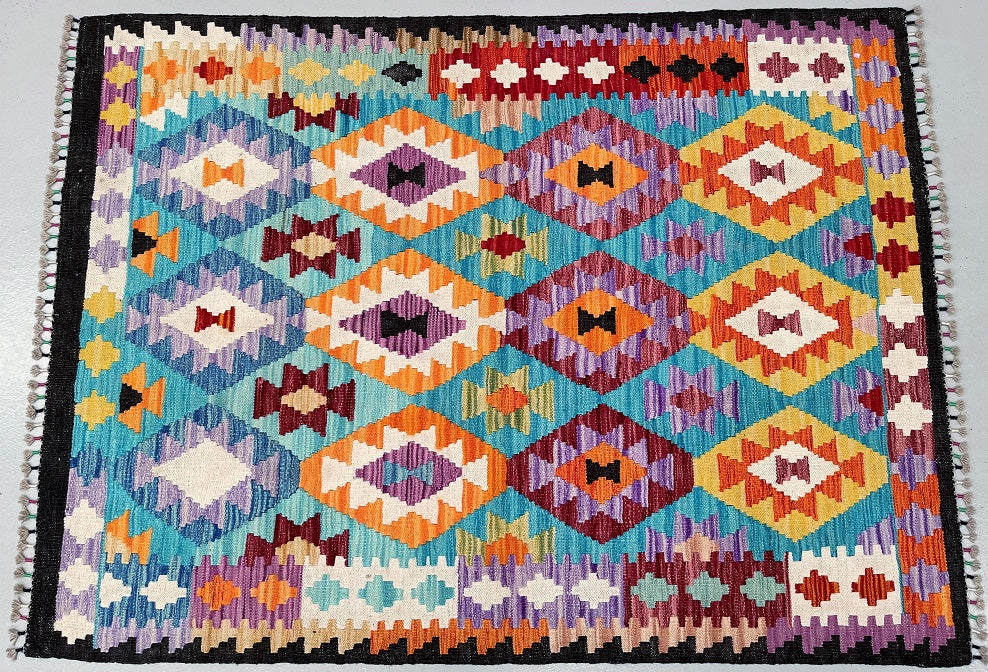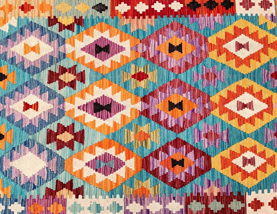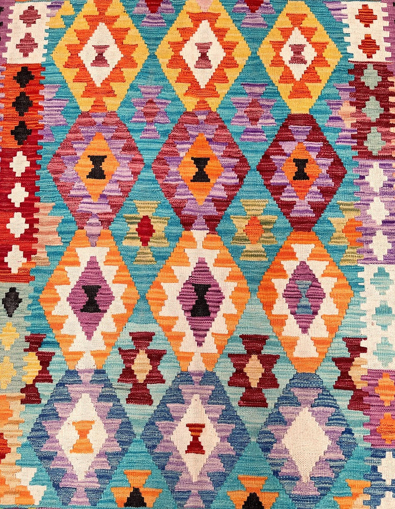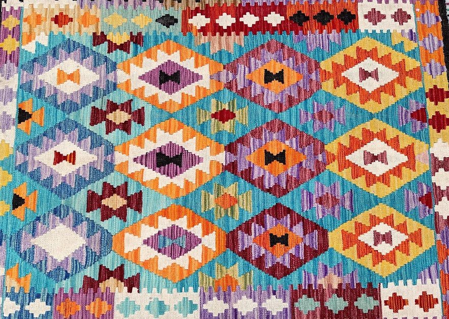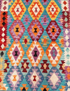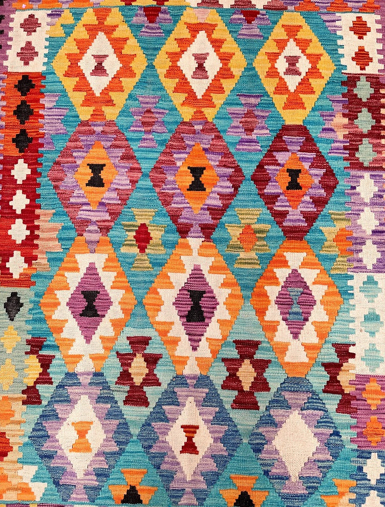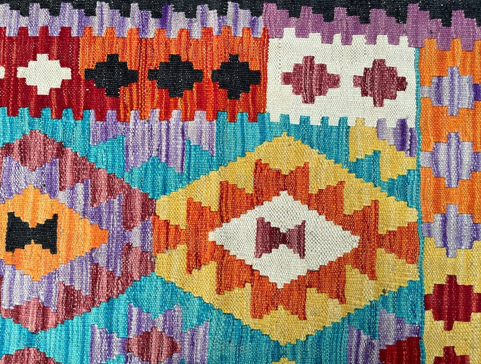 Boho Hand Woven Afghan Kyber Kilim Rug. Above All It Has A Pure Wool Pile On Wool Base. Vibrant Multi Colour Tone Dyed Using Traditional Methods.