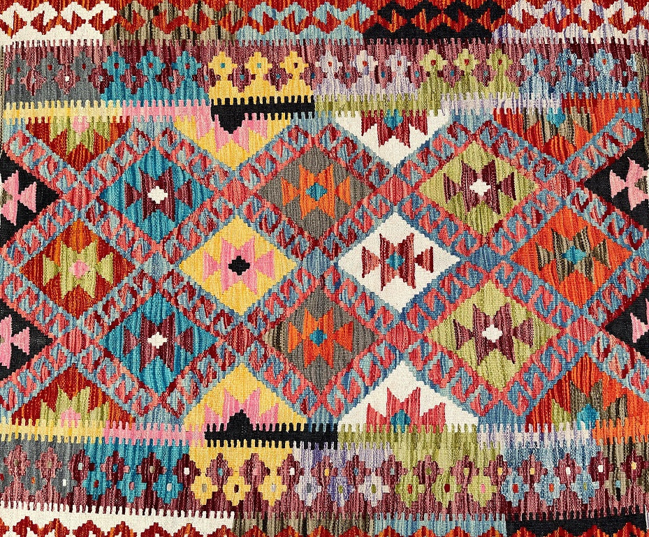 Coffee Table Size Nomadic Hand Woven Afghan Kyber Kilim Rug. Above All It Is A Very Versatile Size. It Also Has A Pure Hand Spun Wool Pile On Wool Base. Multi-Colour Tone Dyed Using Traditional Methods.