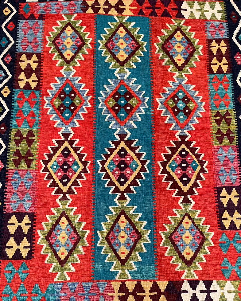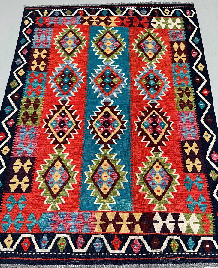 Decorative Hand Woven Boho Design Tribal Afghan Kyber Kilim Rug. Above All It Has A Pure Hand Spun Wool Pile On Wool Base. Multi-Colour Tone Dyed Using Traditional Methods.