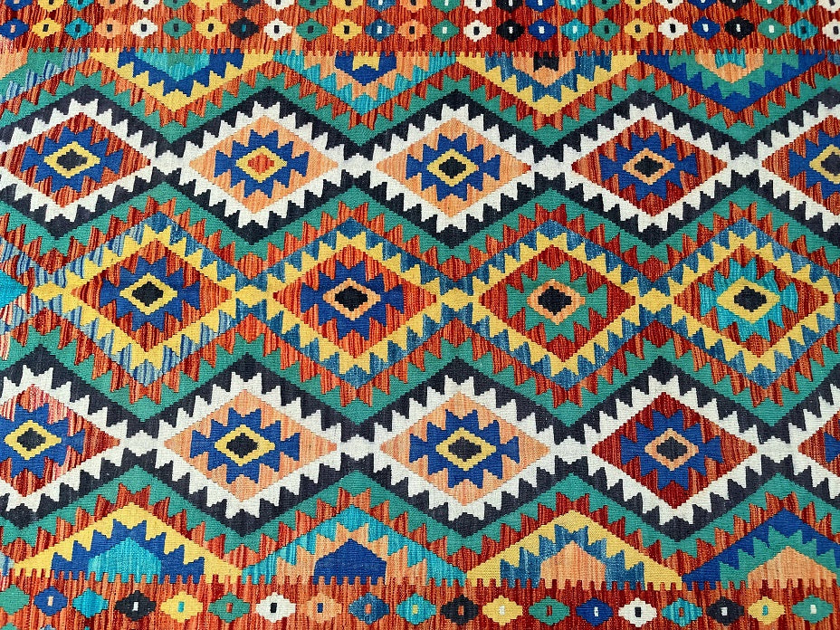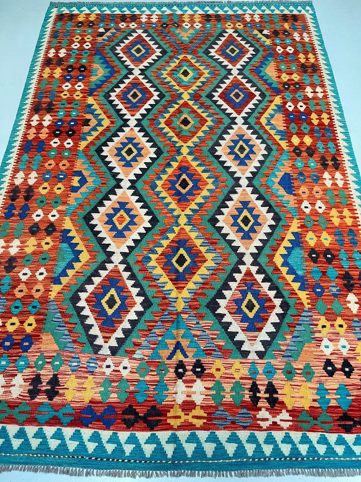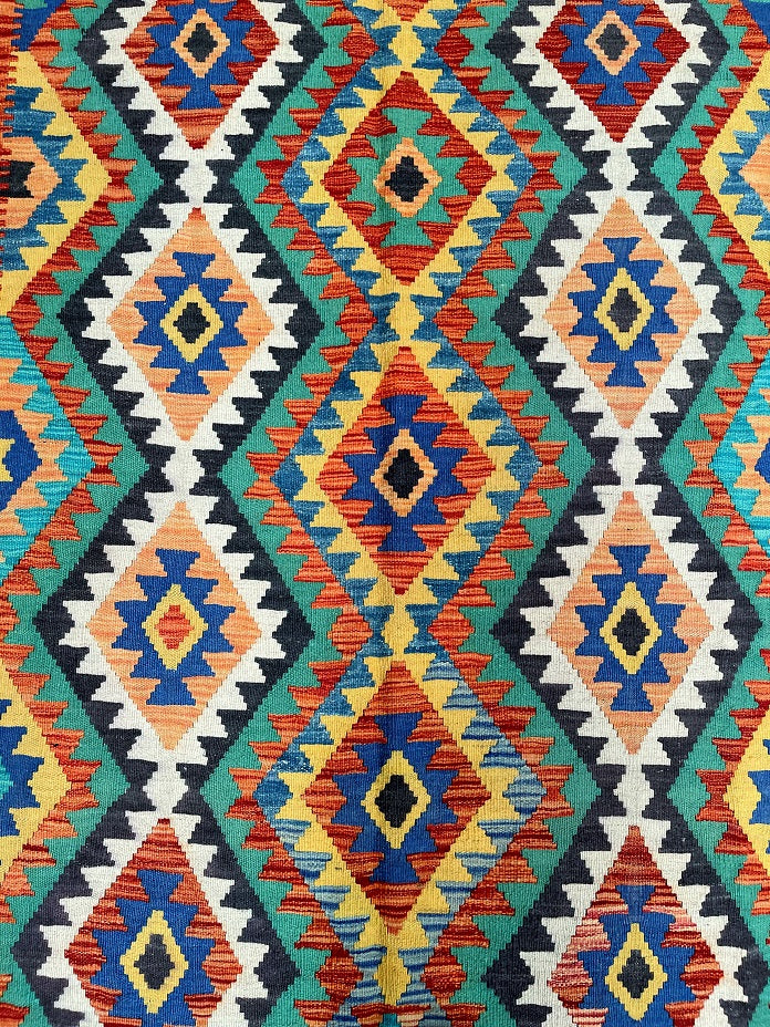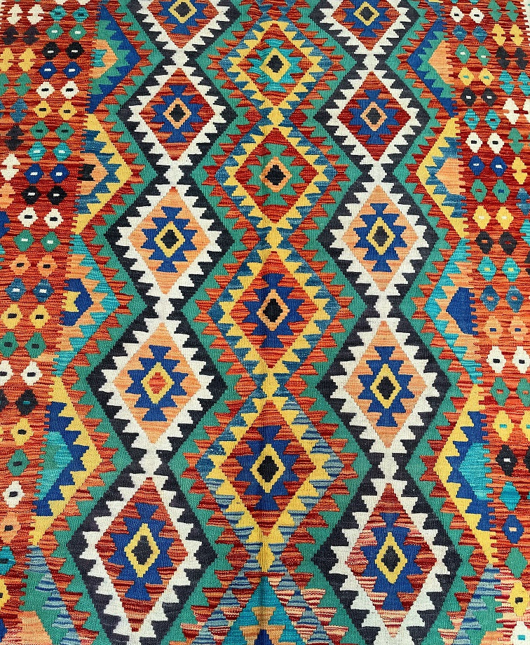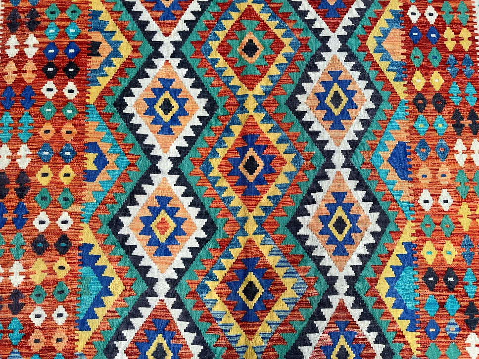 Full Room Size Hand Woven Boho Design Afghan Kyber Kilim Rug. Above All It Is Reversible. It Also Has A Pure Hand Spun Wool Pile On Wool Base. Vibrant Tone Dyed Using Vegetable Roots.
