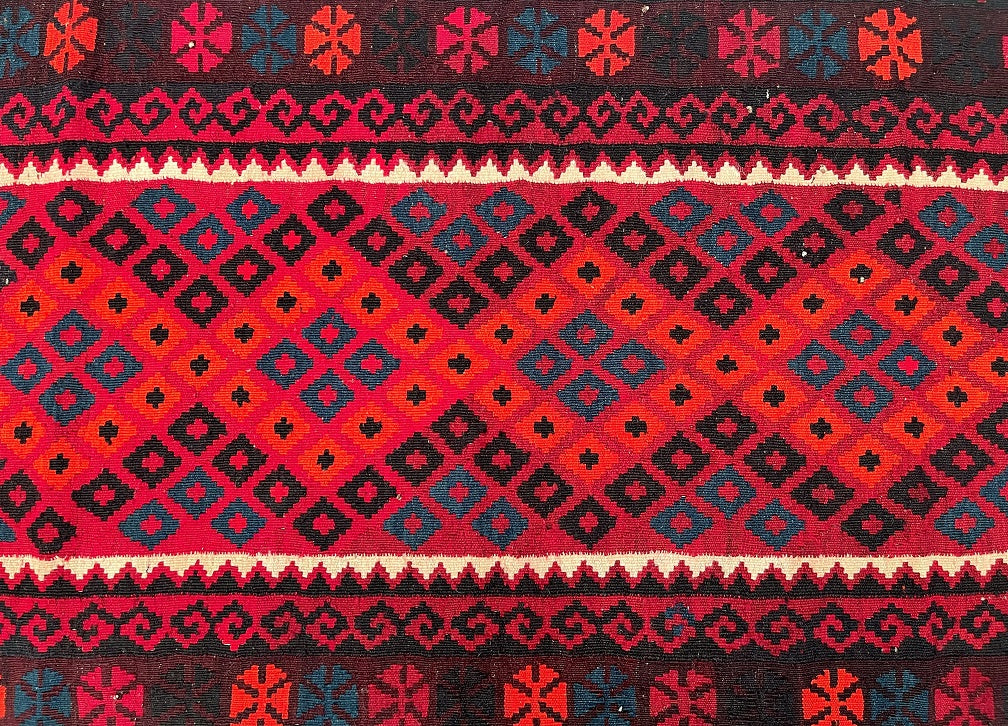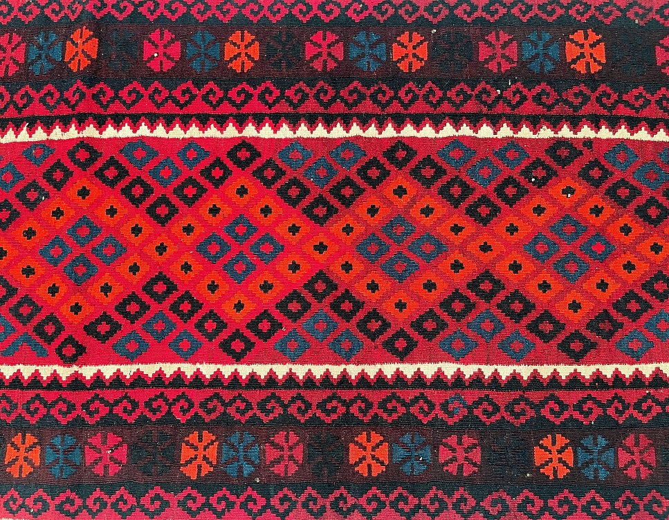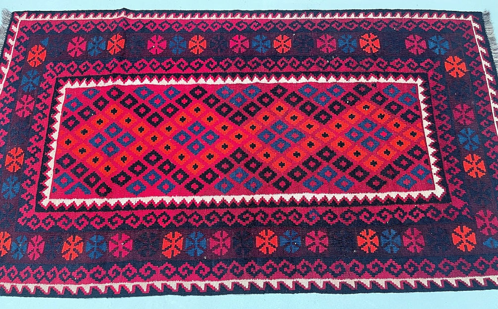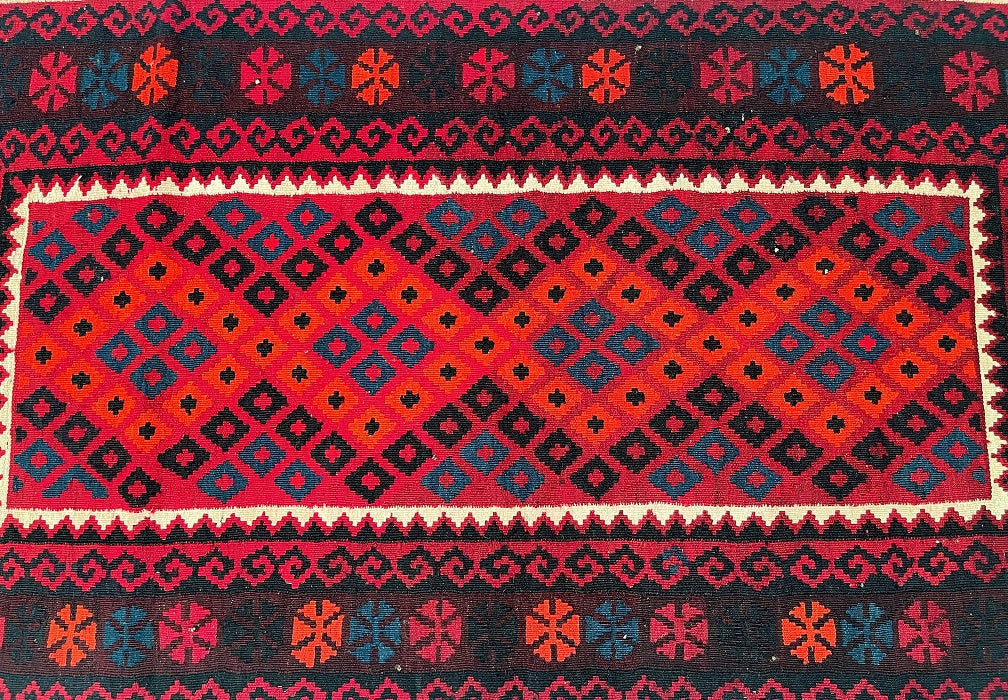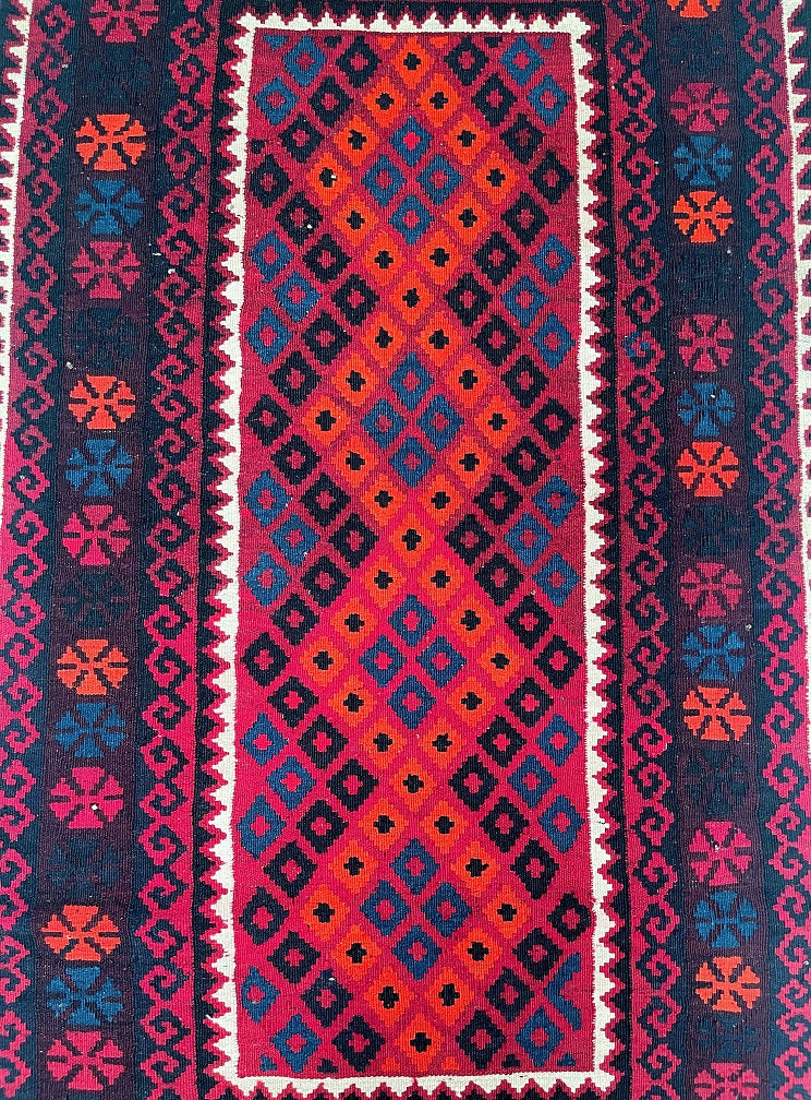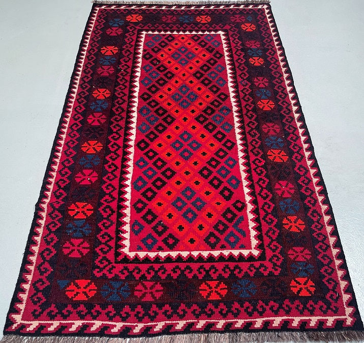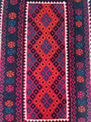 Authentic Hand Woven Afghan Maymaneh Kilim Rug. Above All It Is A Very Versatile Size Which Also Could Be Used As a Runner. It Also Has A Pure Wool Pile On Wool Base. Red, Blue, Orange And Black Tone Dyed Using Traditional Methods.