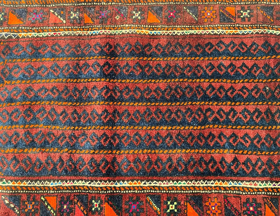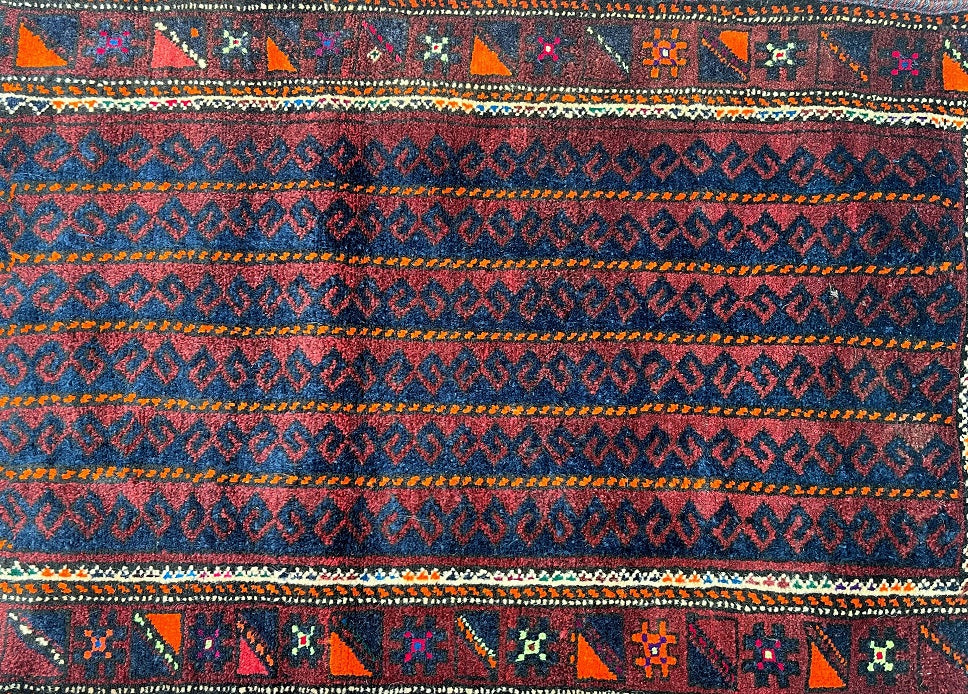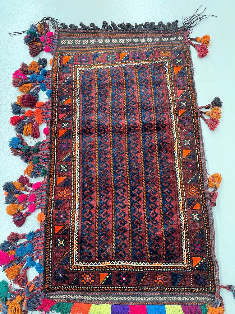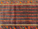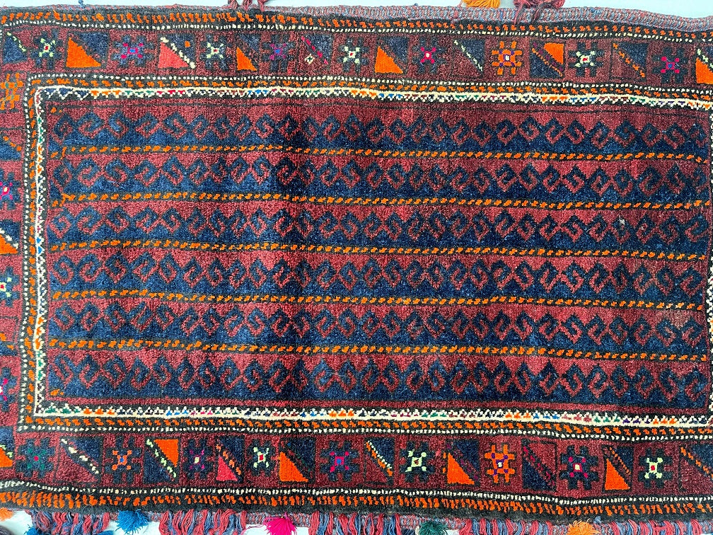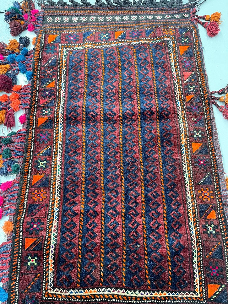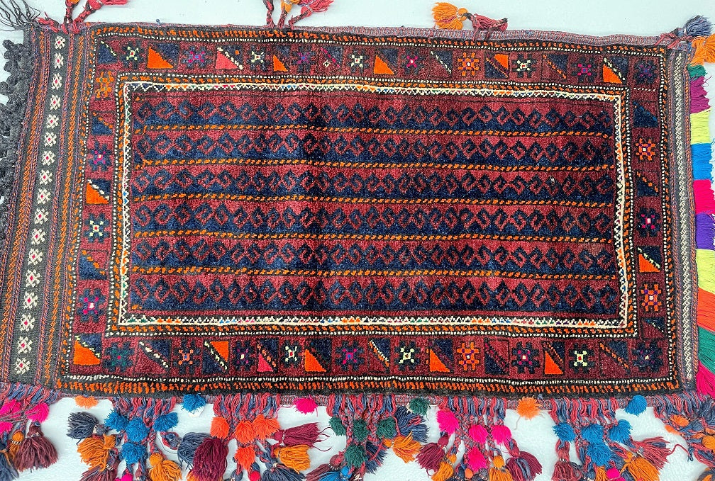 Authentic Handmade Afghan Mishwani Balouchi Saddle Rug/Pillow Case. Above All It Has The Kilim Backing And Could Be Filled And Used As A Large Cushion, Pillow Or As A Floor Rug. It Also Has A Pure Hand Spun Wool Pile On Wool Base. Terracotta Red, Indigo Blue And Orange Tone Dyed Using Traditional Methods.