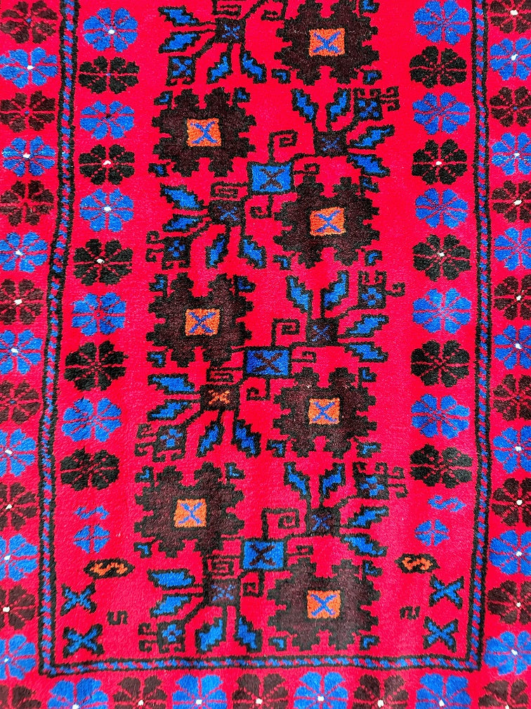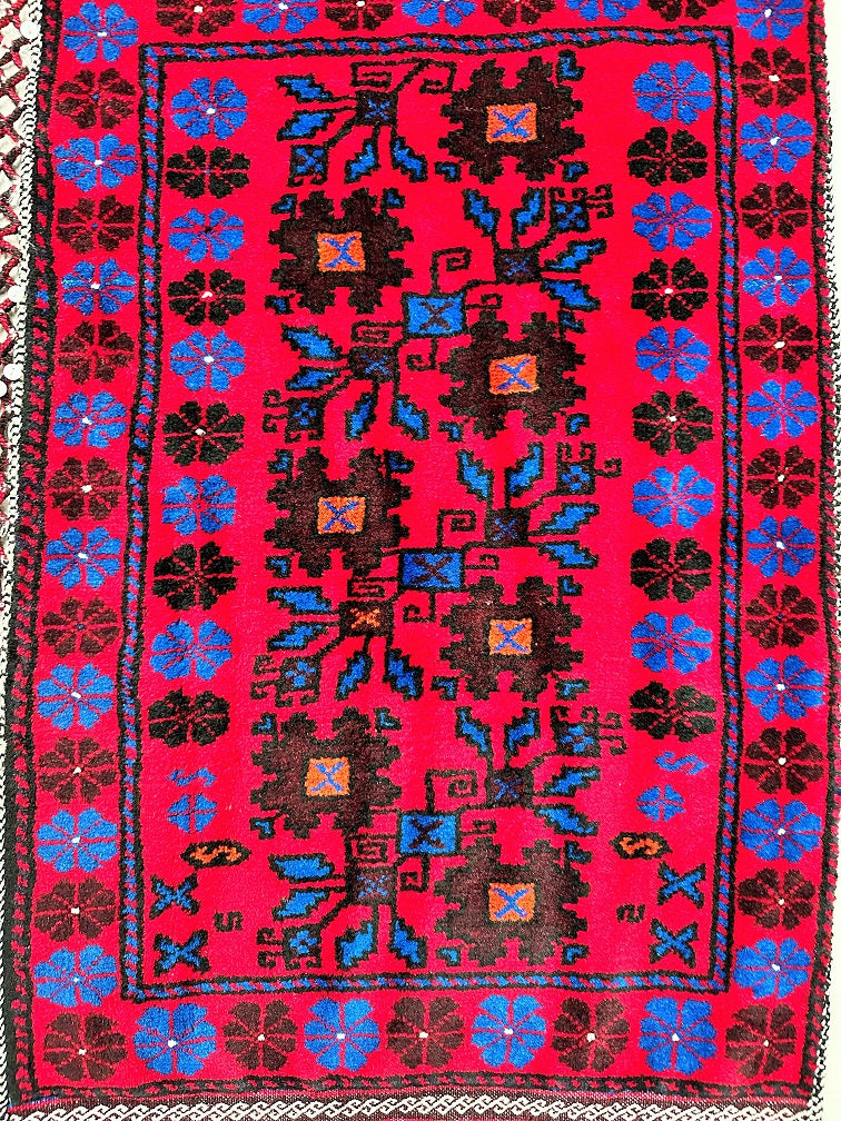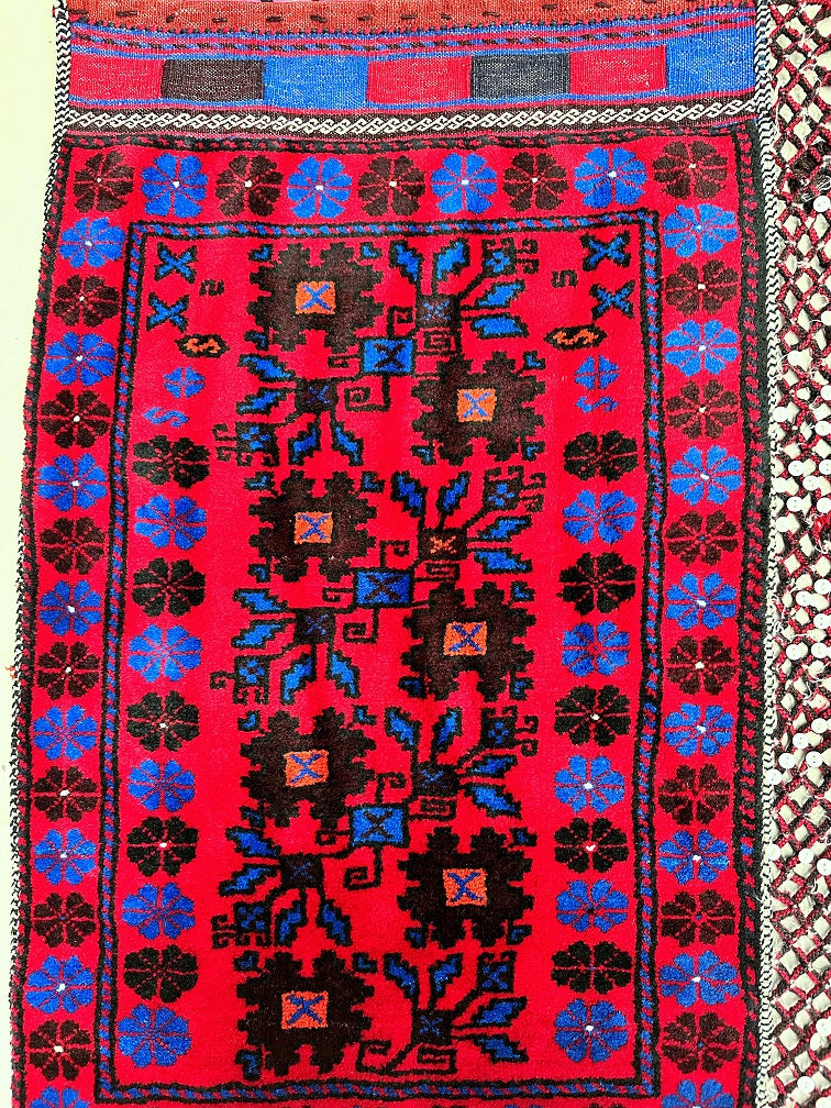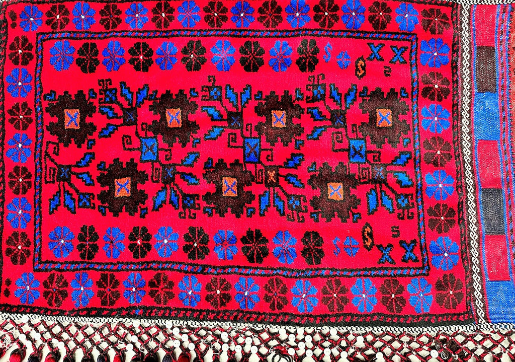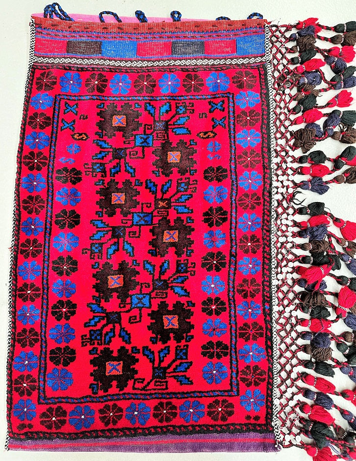 Authentic Handmade Afghan Mishwani Balouchi Saddle Rug/Pillow Case. Above All It Has The Kilim Backing And Could Be Filled And Used As A Large Cushion, Pillow Or As A Floor Rug. It Also Has A Pure Hand Spun Wool Pile On Wool Base. Red, Indigo Blue, Pink and Black Tone Dyed Using Traditional Methods.