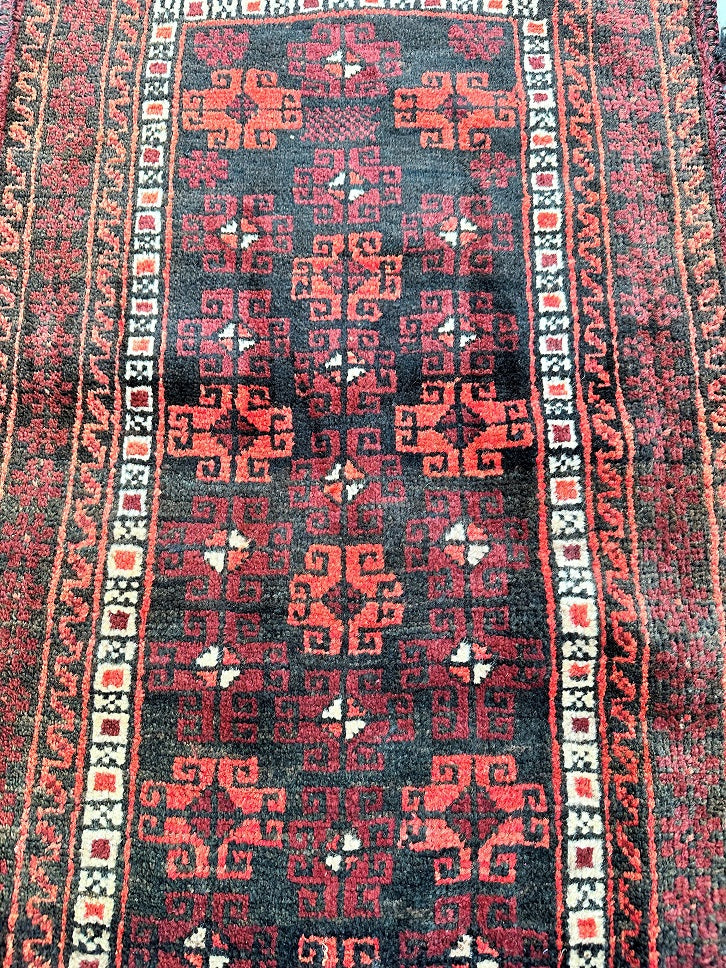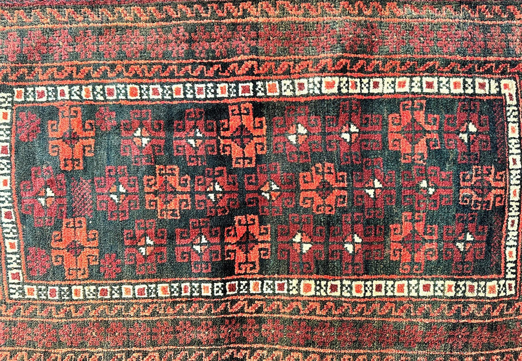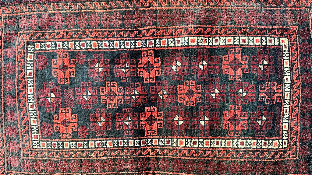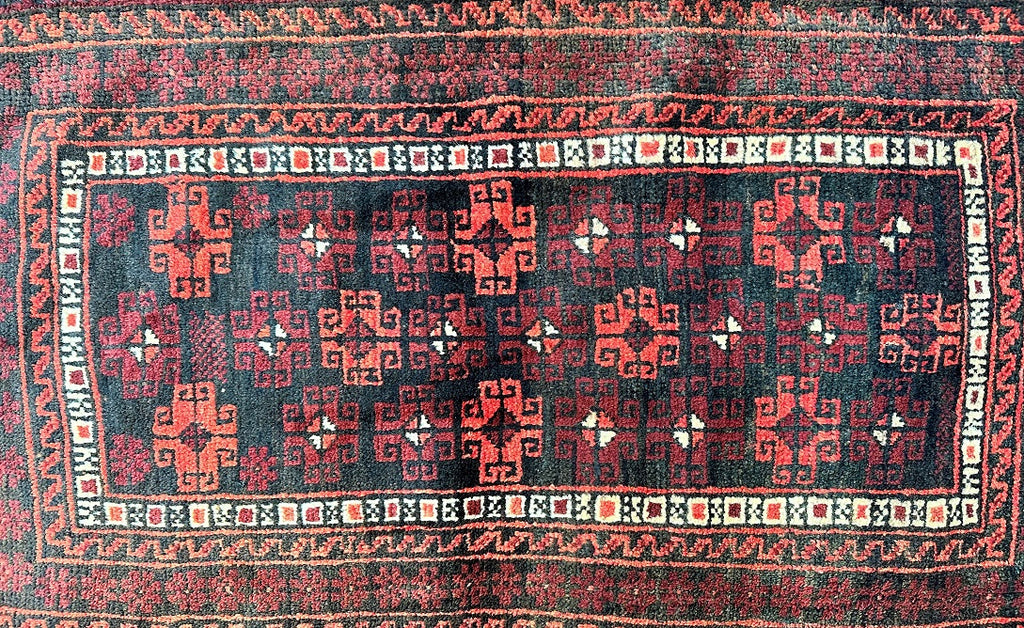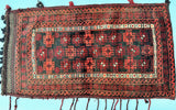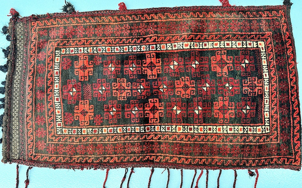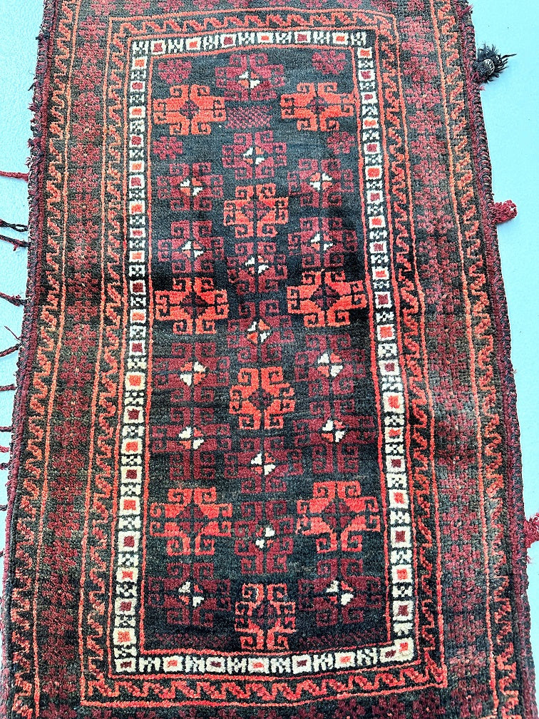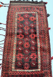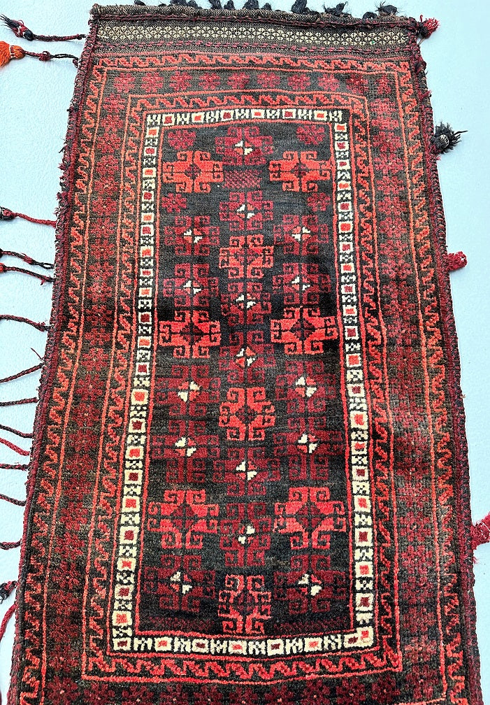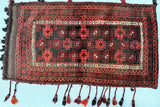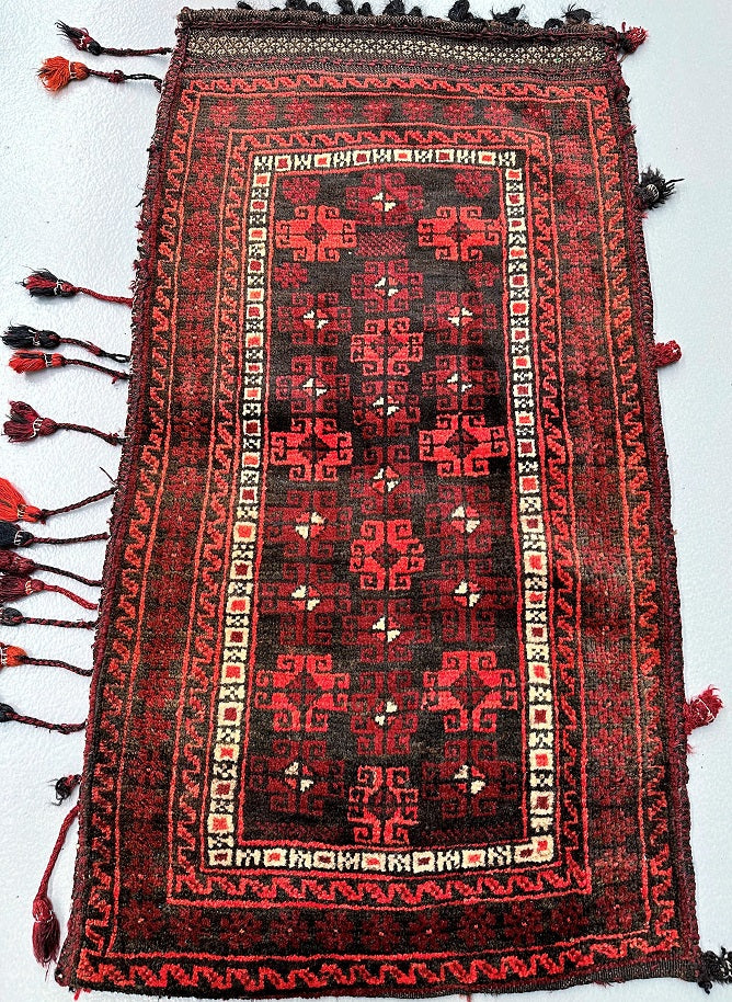 Authentic Handmade Afghan Mishwani Balouchi Saddle Rug/Pillow Case. This versatile piece not only features a kilim backing but can also be filled and used as a large cushion, pillow, or even as a floor rug. It showcases a pure hand-spun wool pile on a wool base, providing a high-quality construction. The colors of oxidized red, beige, and black are achieved through traditional dyeing methods, adding to its aesthetic appeal. With a geometric tribal design, this rug/pillow case is truly unique. It would have taken a skilled weaver approximately 2 weave to complete this intricate piece. Hand-woven in Afghanistan, it represents the craftsmanship of the region. The size of this item is 109 x 59 cm, making it suitable for various purposes. The gallery replacement value of this Afghan Mishwani Balouchi Saddle Rug/Pillow Case is estimated at $699.