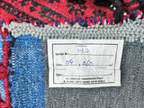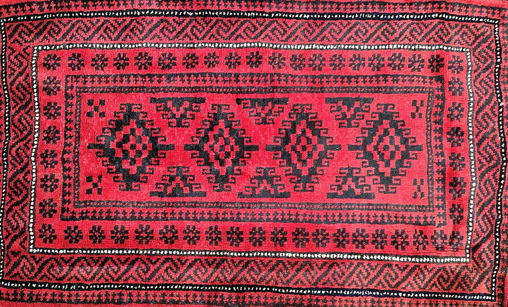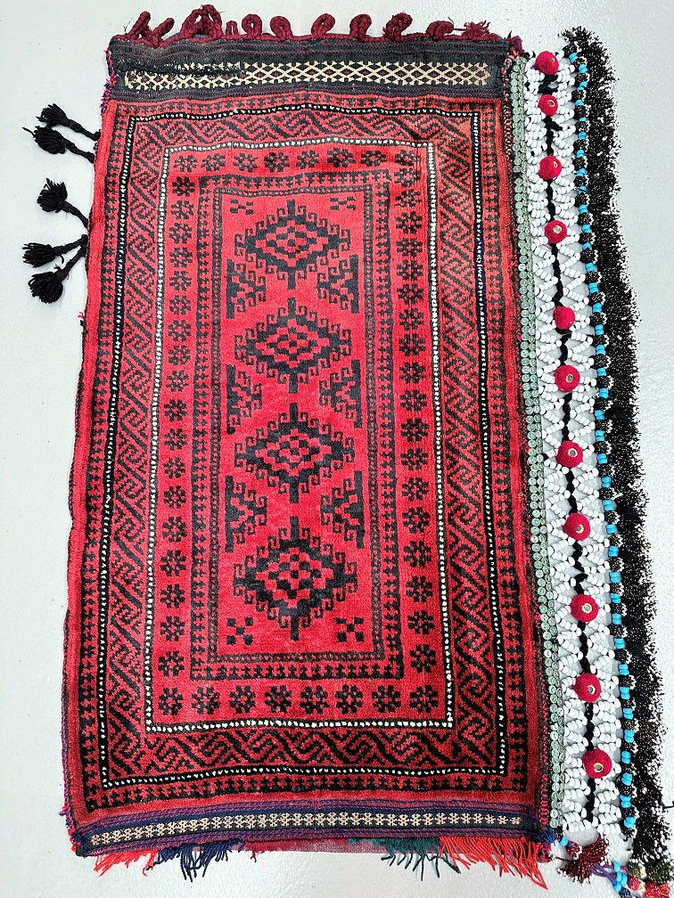 Authentic Handmade Afghan Mishwani Balouchi Saddle Rug/Pillow Case. This versatile piece features a kilim backing, allowing it to be filled and used as a large cushion, pillow, or even as a floor rug. Crafted with a pure hand-spun wool pile on a wool base. The red, black, and beige tones are achieved through traditional dyeing methods, adding to its authentic appeal. With a geometric tribal design, this rug embodies the rich cultural heritage of Afghanistan. It is worth noting that the weaver dedicated approximately 2 weeks to complete this remarkable piece. Hand-woven in Afghanistan, this rug measures 114 x 60 cm and holds a gallery replacement value of $699.