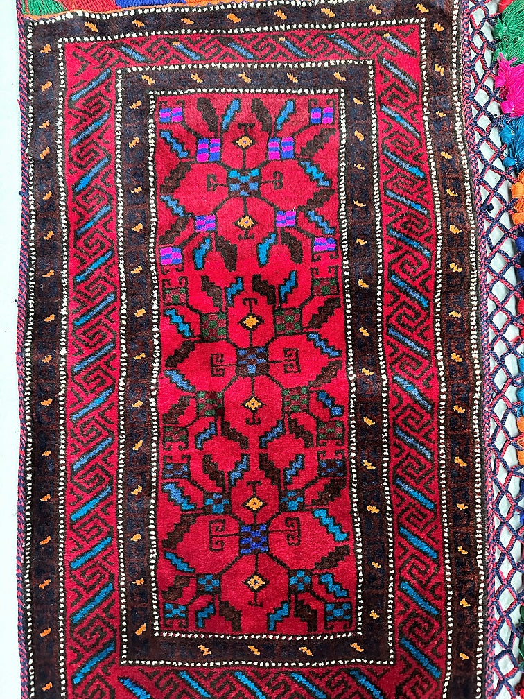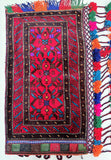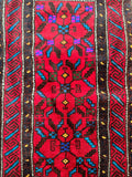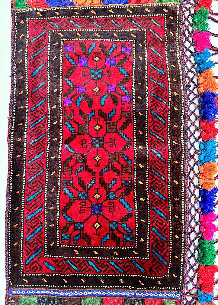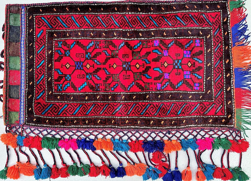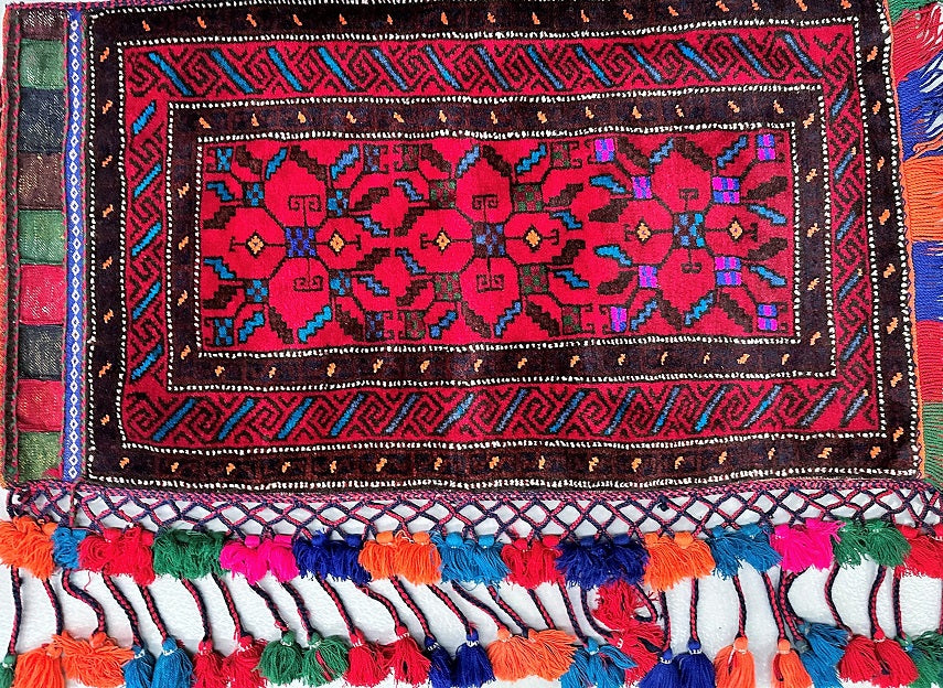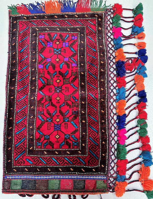 Authentic Handmade Afghan Mishwani Balouchi Saddle Rug/Pillow Case. Above All It Has The Kilim Backing And Could Be Filled And Used As A Large Cushion, Pillow Or As A Floor Rug. It Also Has A Pure Hand Spun Wool Pile On Wool Base. Red, Blue, Brown, Orange and Black Tones Dyed Using Traditional Methods.