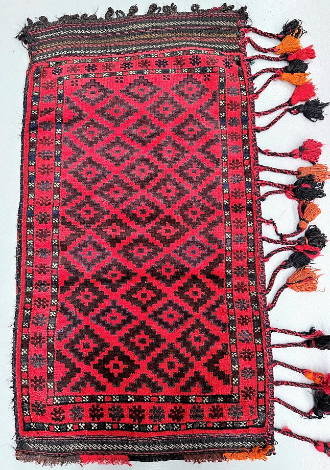 Authentic Handmade Afghan Mishwani Balouchi Saddle Rug/Pillow Case. Above All It Has The Kilim Backing And Could Be Filled And Used As A Large Cushion, Pillow Or As A Floor Rug. It Also Has A Pure Hand Spun Wool Pile On Wool Base. Red, Beige, Black And Orange Tones Dyed Using Traditional Methods.